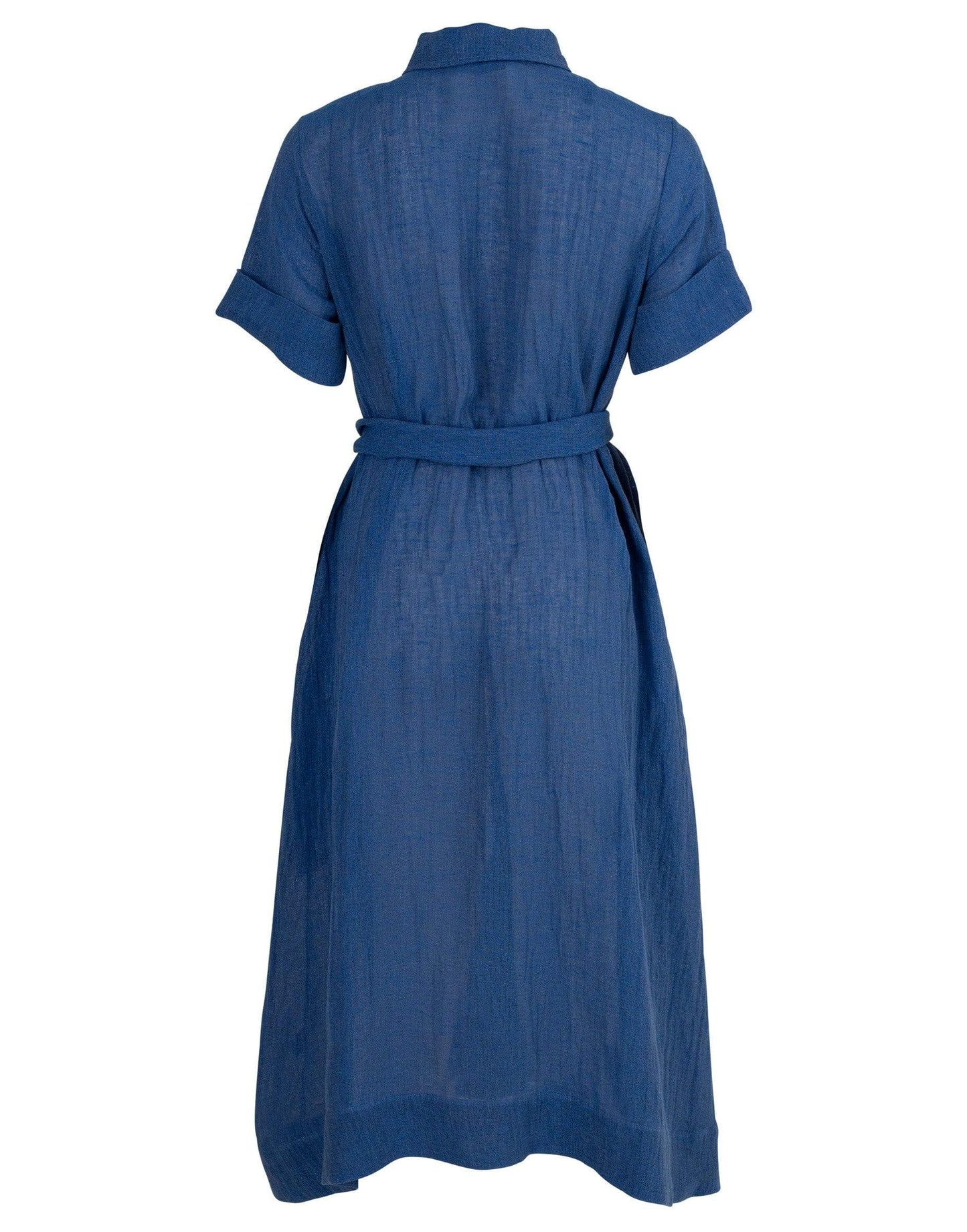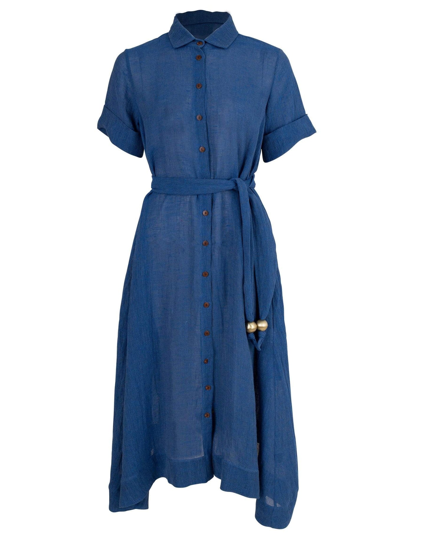 Lisa Marie Fernandez Moroccan blue organic gauze shirt dress with a classic silhouette, spread collar, coconut buttons, short sleeves, a fitted waist that cinches with a matching scarf belt, and a mid-length.