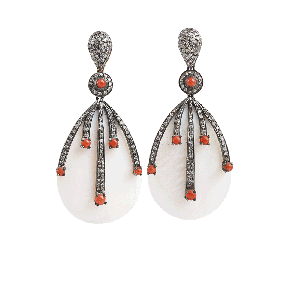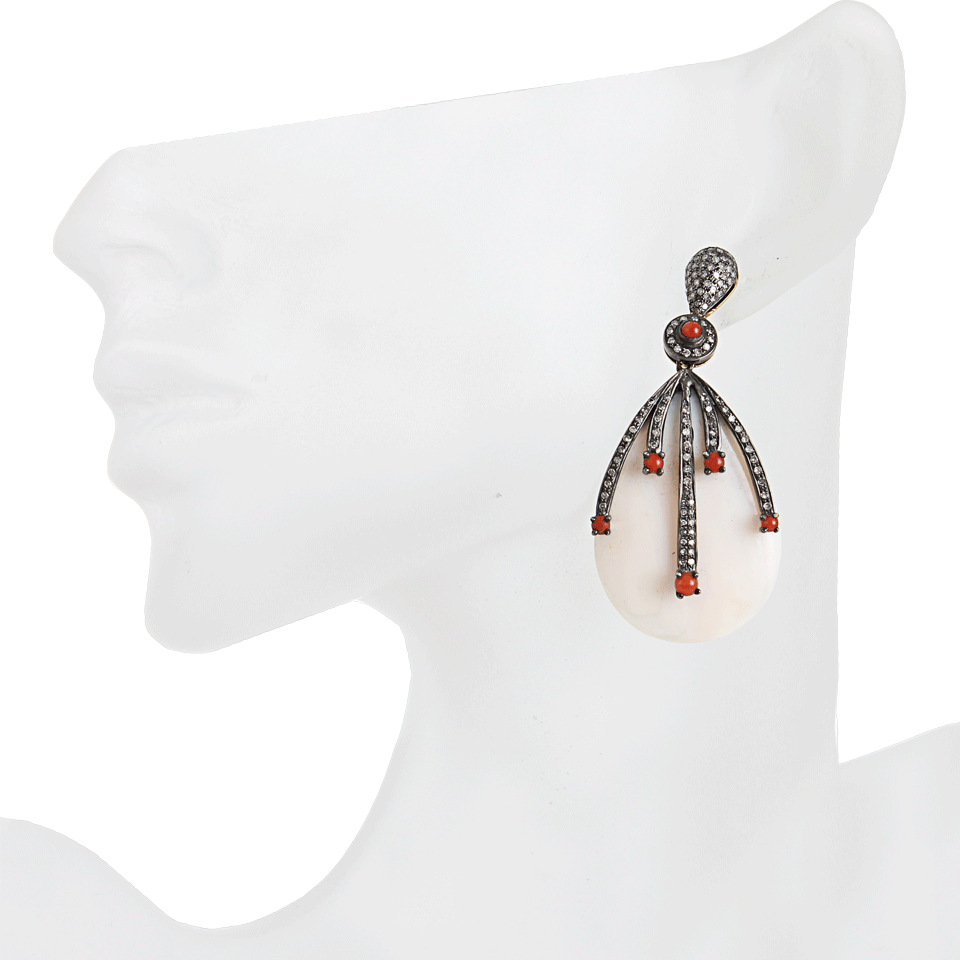 Allow Dorie Love’s mother of pearl, diamond and coral drop earrings to hang from your ears as they would on a branch with grace and ease.They will frame your face beautifully while they radiate from your complexion that the only thing people will be looking at is you.