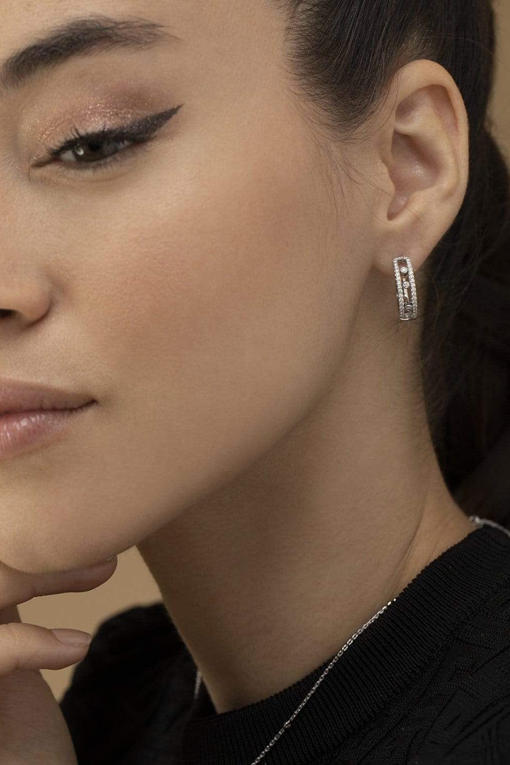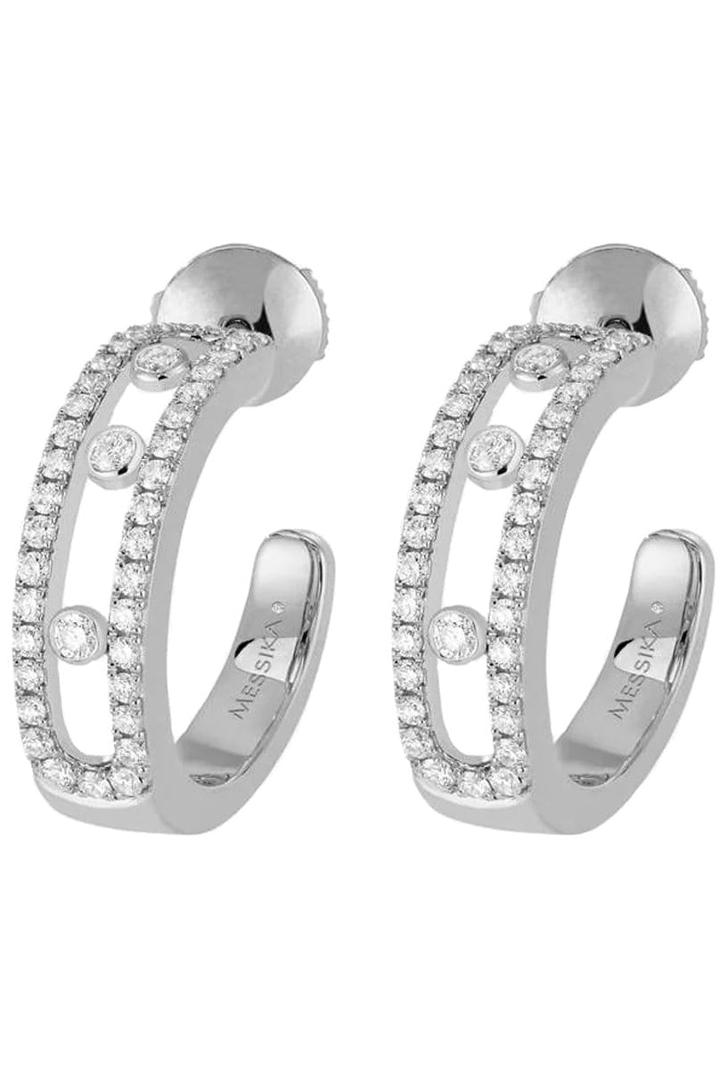 Messika Move Pave Diamond Hoop Earrings. Pared down style and modern, these white gold pavé diamond hoop earrings are the best everyday companions of a woman for a glamorous and stylish look. Diamond jewels of the Move Joaillerie collection, these diamond jewels are recognizable by the diamonds in motion. Three luminous stones on each ear, perfect symbols of the love of yesterday, today and tomorrow. In this aerial pavé version, this 18 carat white gold diamond hoop earrings will wrap up the face with a special glow.