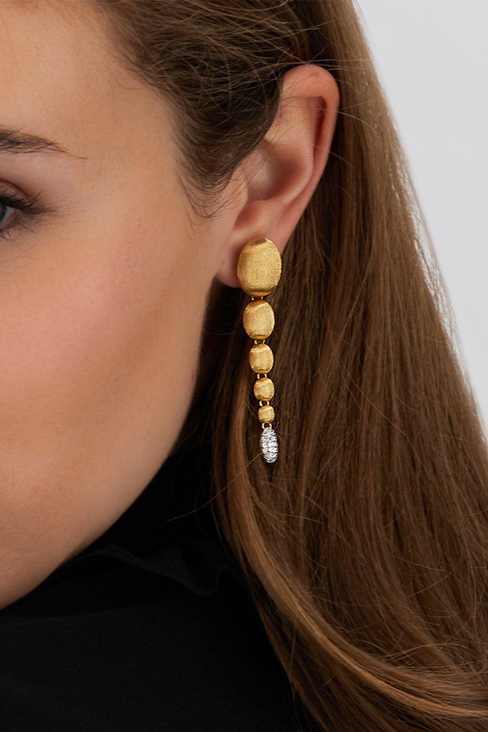 Elegant 18kt gold boules, hand-engraved with artisanal wisdom, chase each other in these contemporary earrings crowned with a diamonds drop. Laura, who tests each of her creations, has created special butterflies for these earrings, equipped with a little plate to support the upper part of the earring, ensuring a perfect wearability.