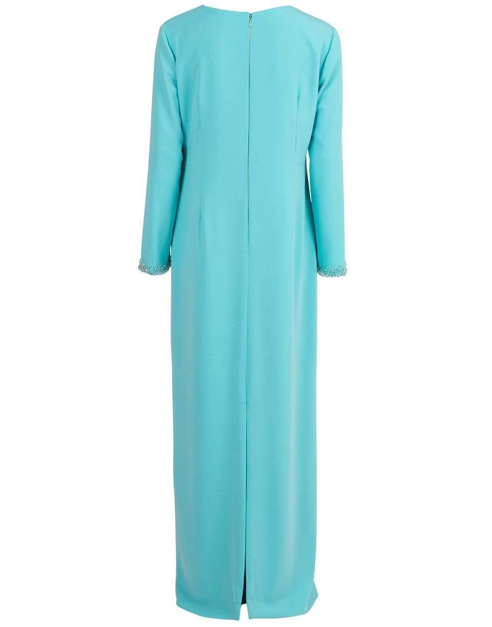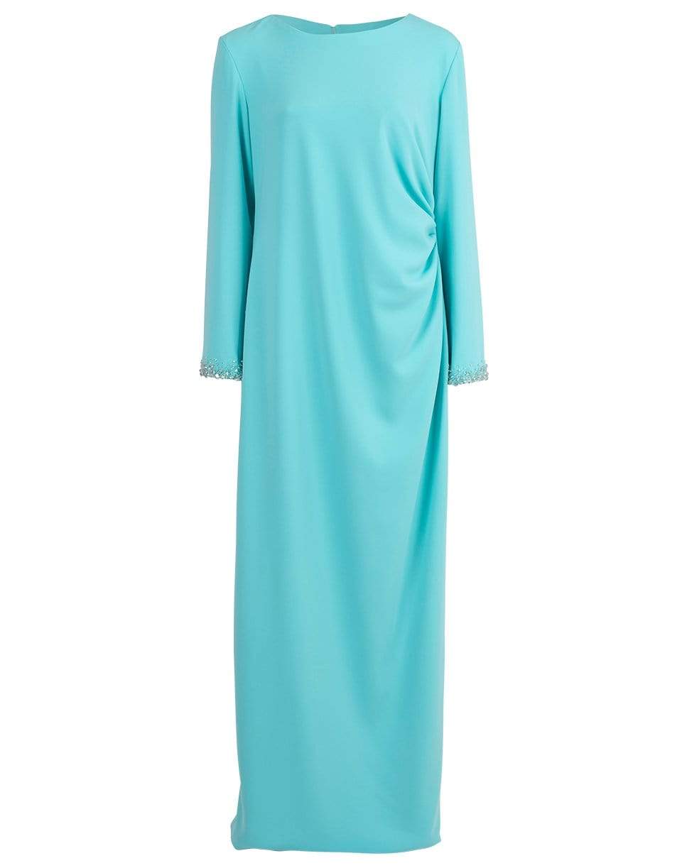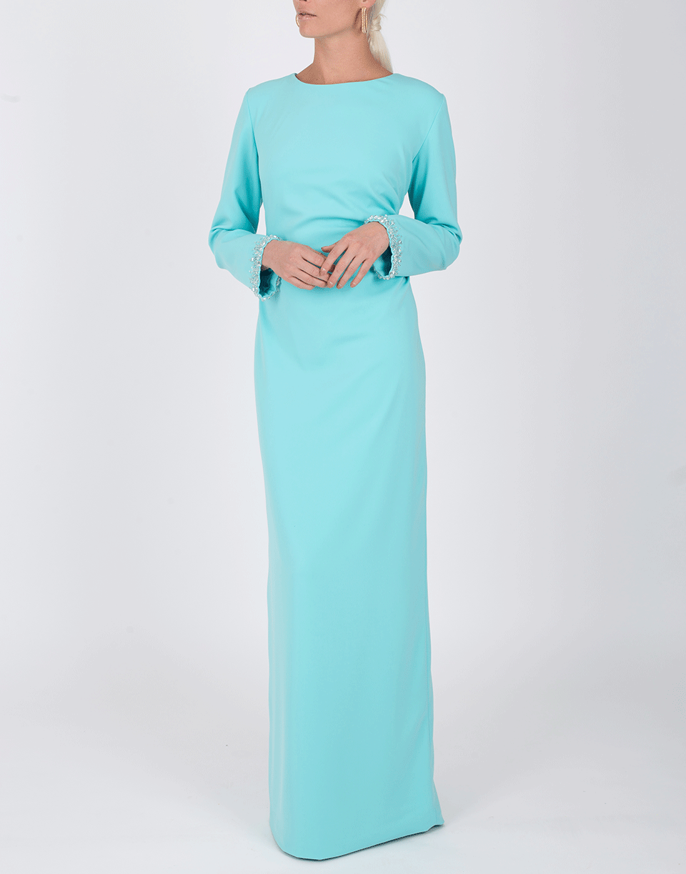 The Naomi sheath dress from Catherine Regehr features a regular fit, boatneck, long sleeves with embroidered cuffs, gathered waist, back slit, concealed zip at back, and a full length.