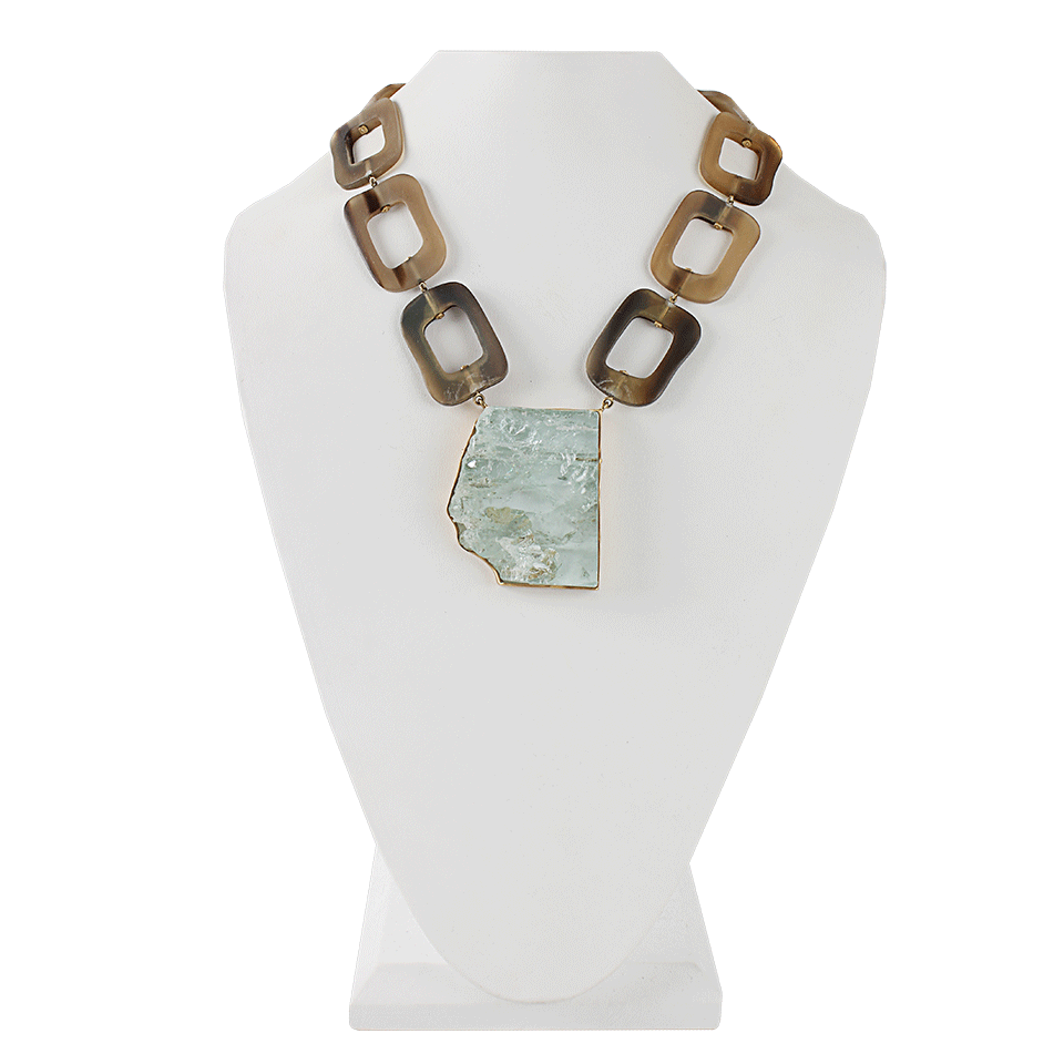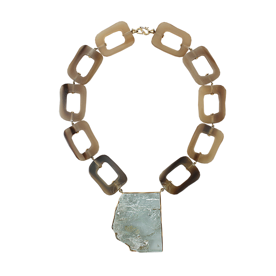 Make a naturalistic statement in this Monique Pean natural aquamarine and buffalo horn link necklace. Let this extraordinary piece steal the limelight of the evening and pair with a neutral toned strapless dress and hair pulled back.
