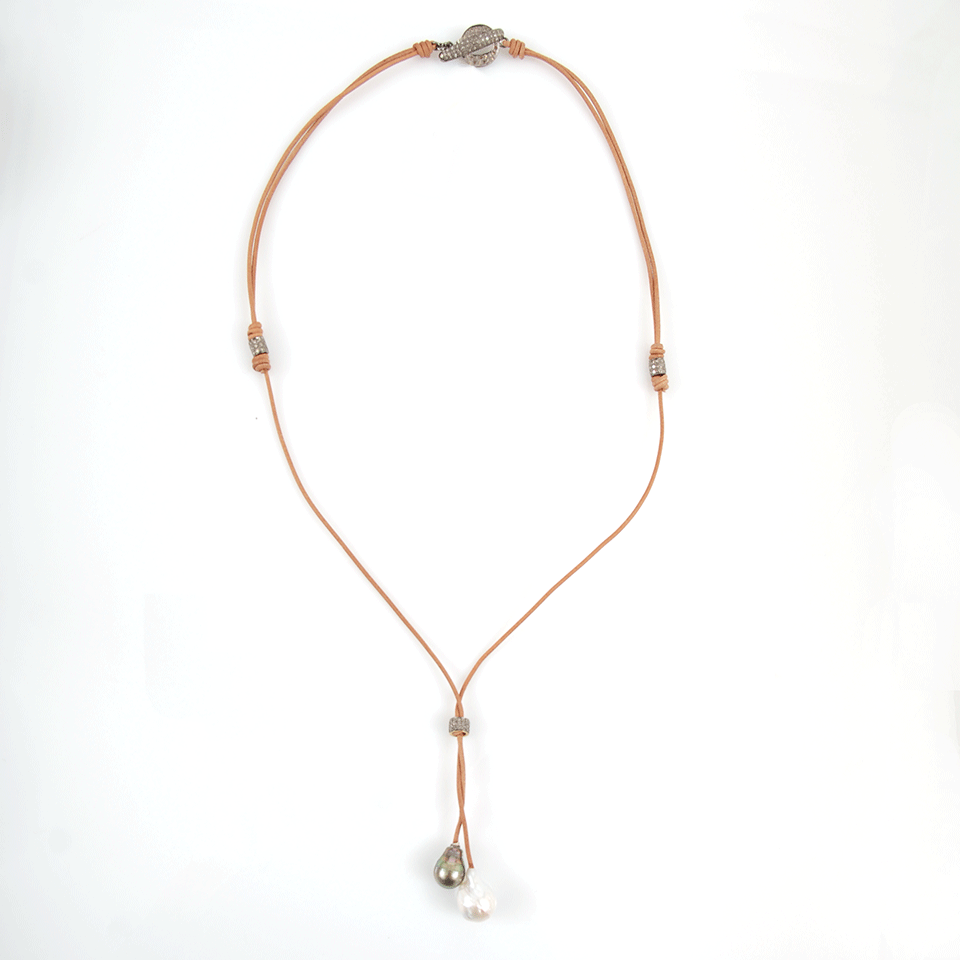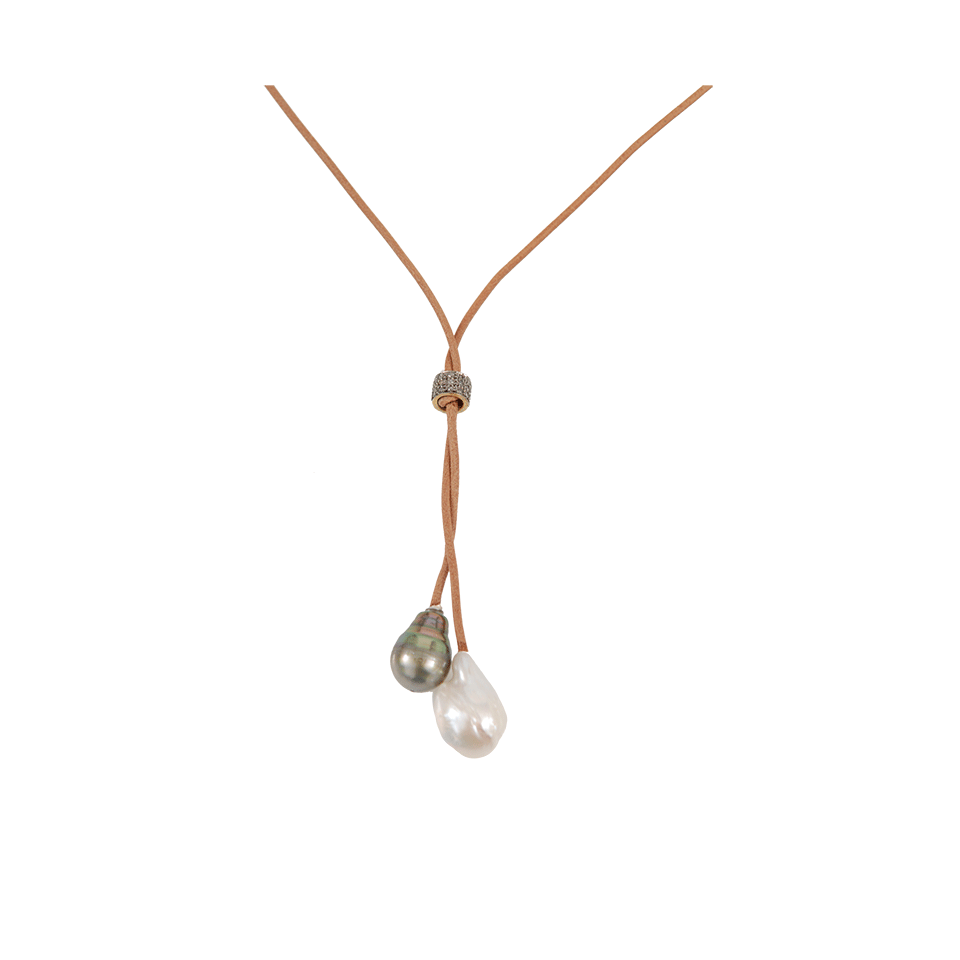 Natural Leather Lariat Necklace With One White Pearl, One Tahitian Pearl And Three Diamond Rondelle Beads