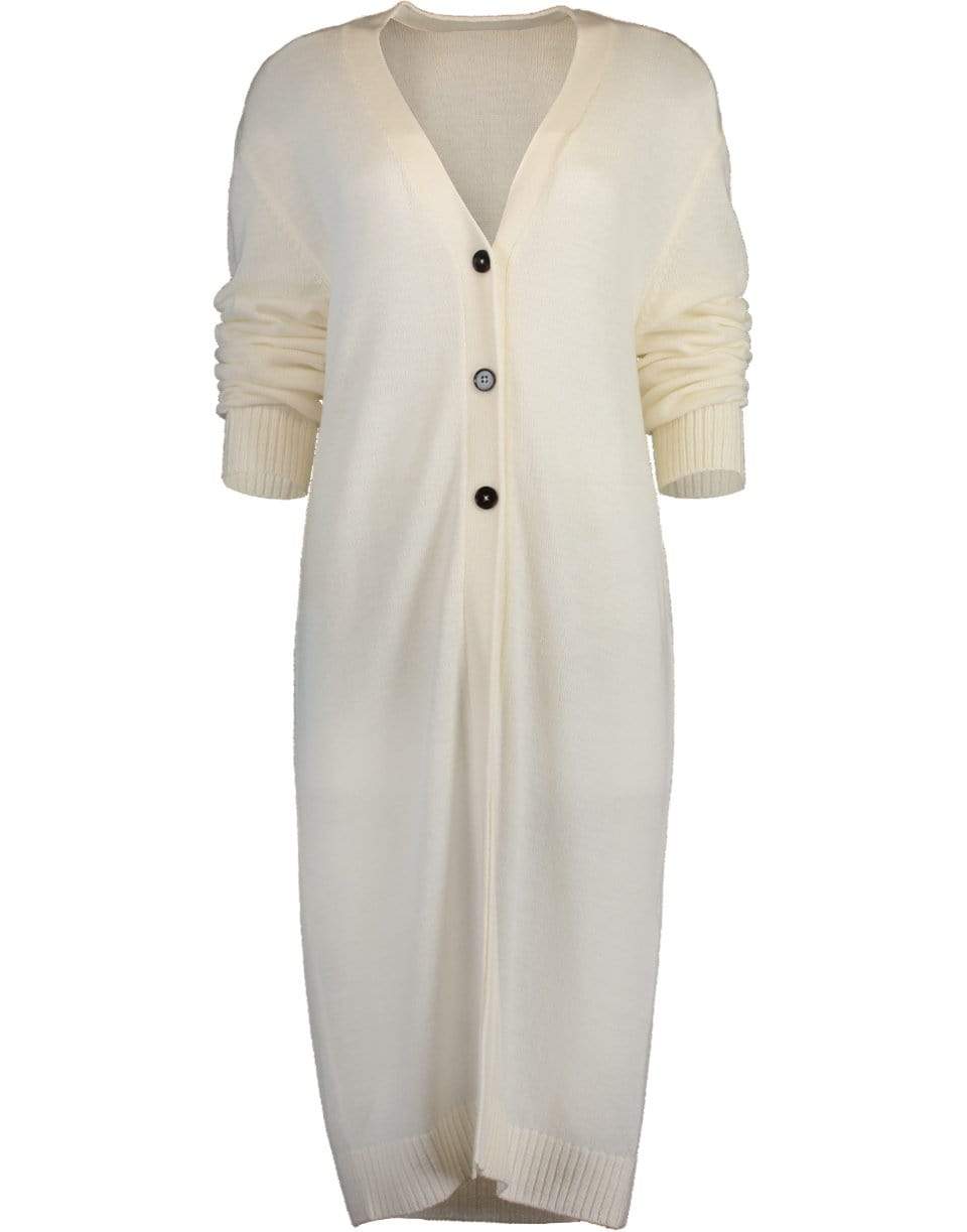 Jil Sander long cardigan with a v-neck, front button closures, ribs trim, long sleeves, and a calf length.