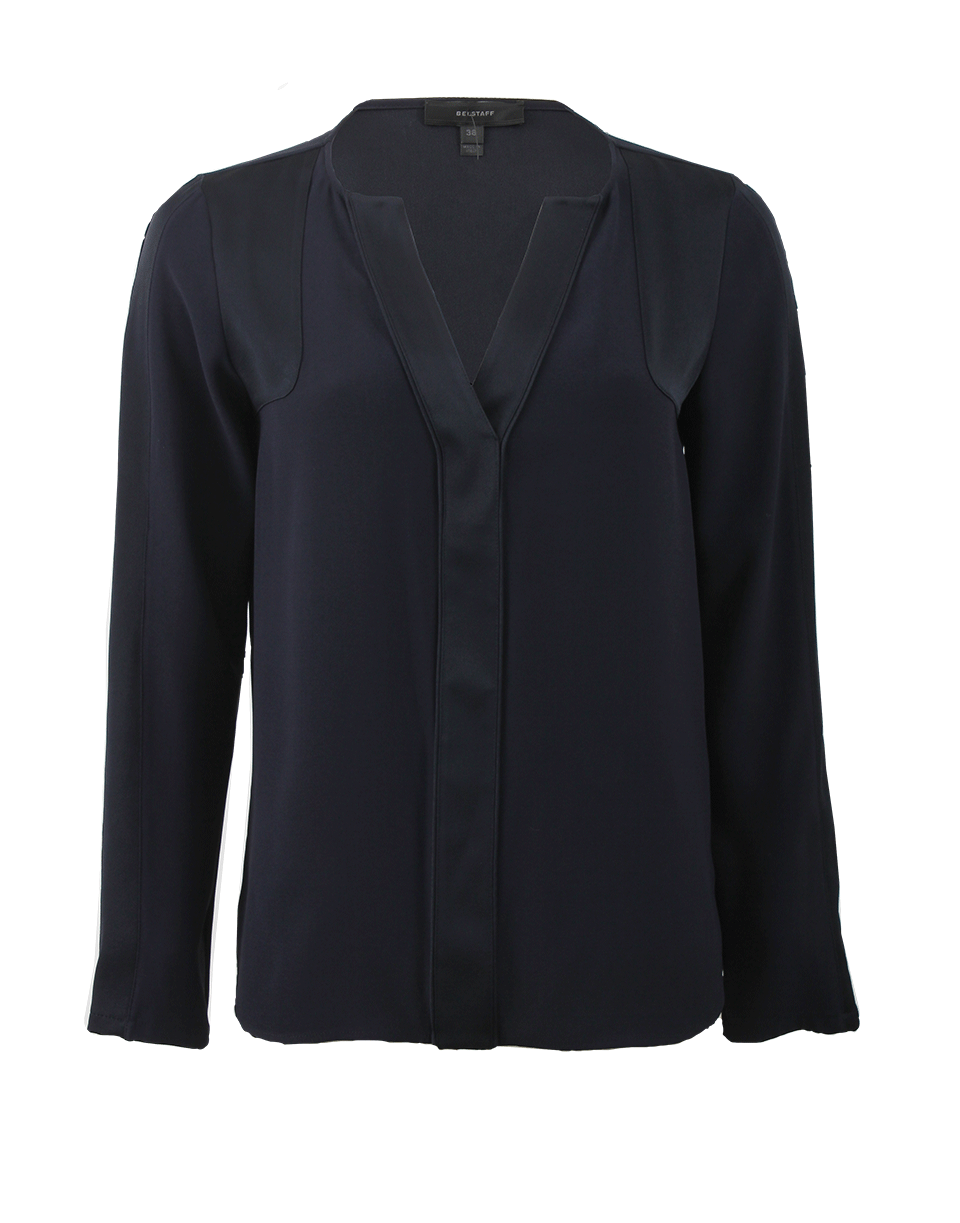 V-Cut Neckline With Placket Detail And Satin Panels At Arms, Placket, And Shoulders