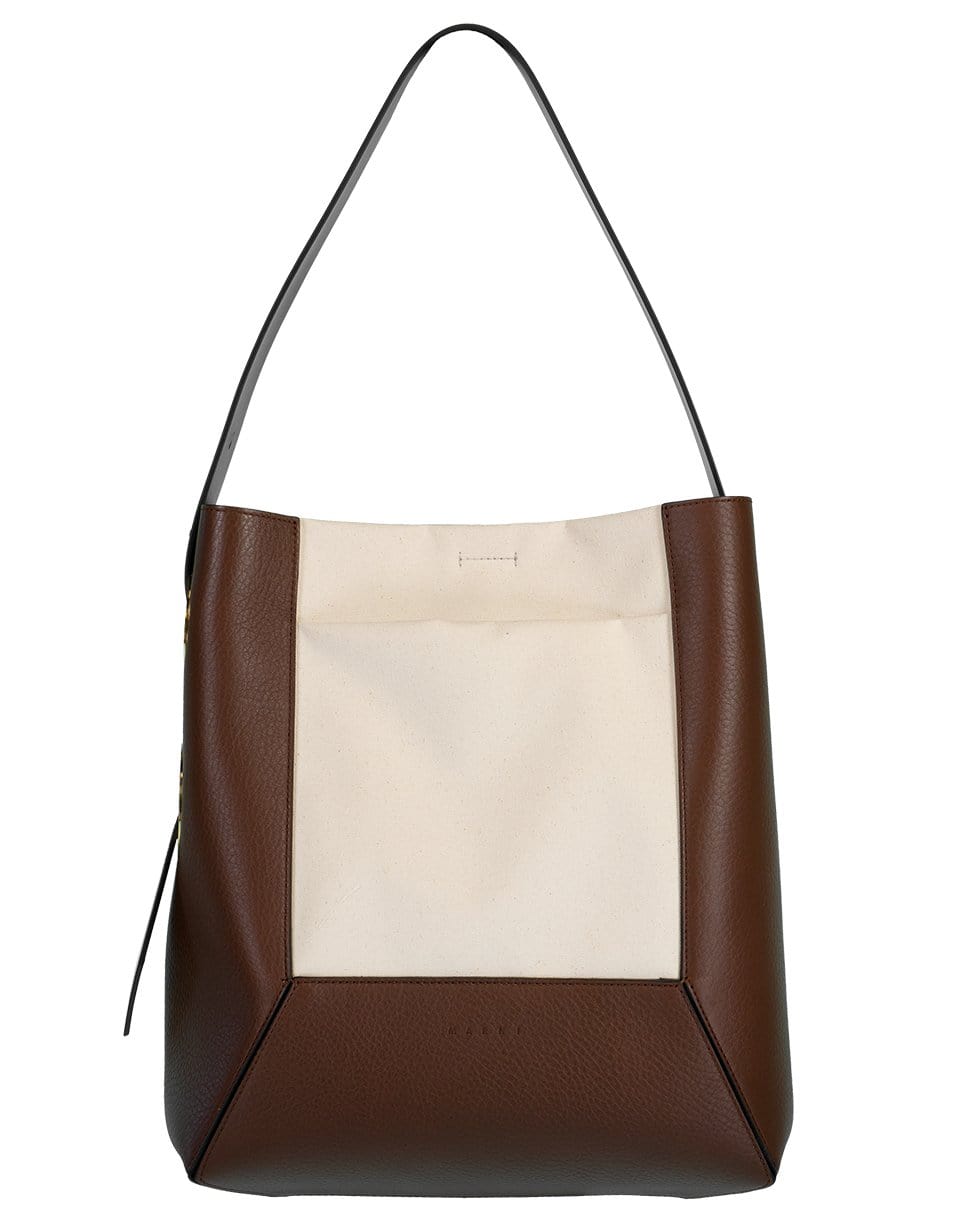 Marni canvas and leather color blocked Nemo Tote with contrasting shoulder strap, magnetic closure, gold-tone side grommets, and a spacious interior with pockets.