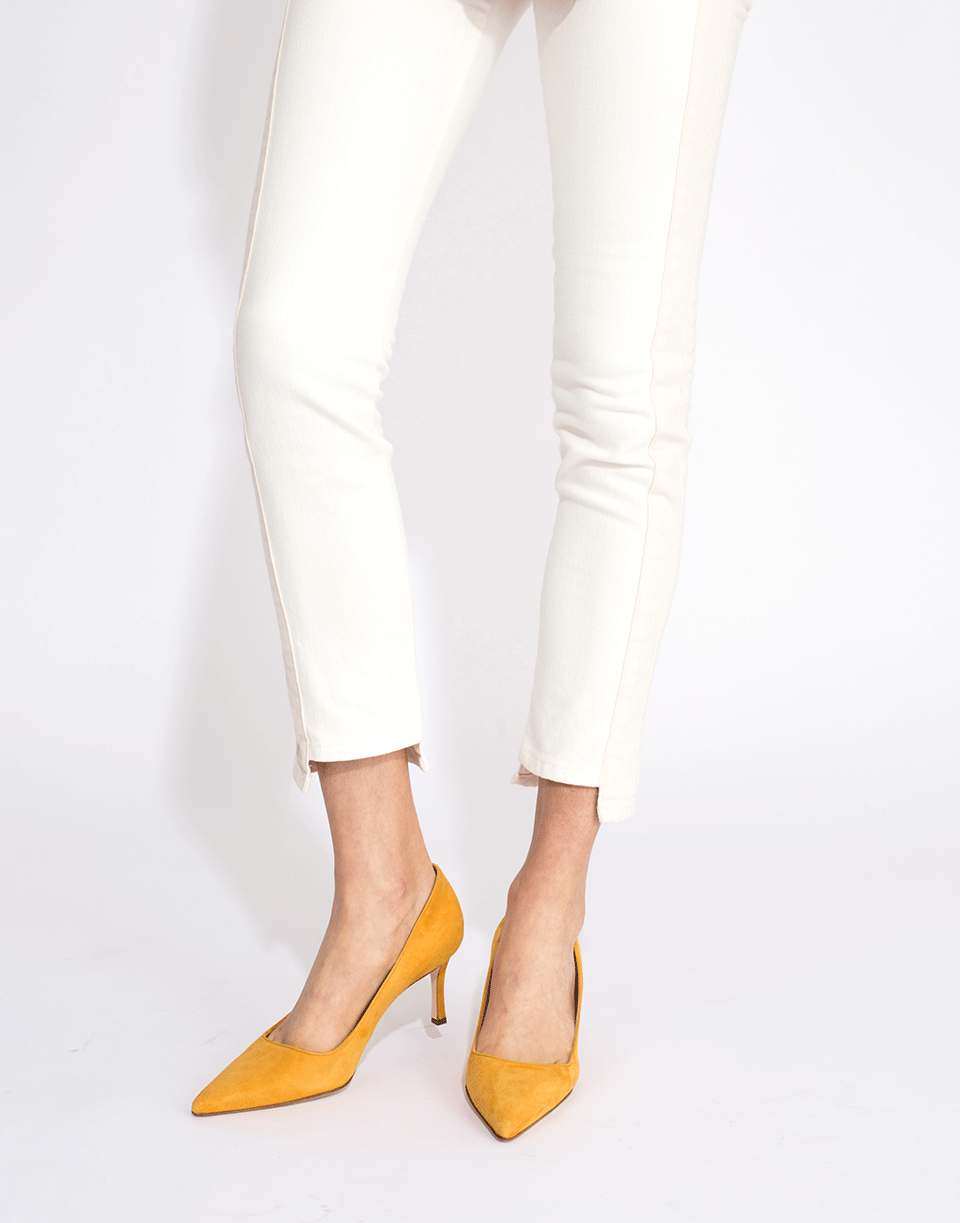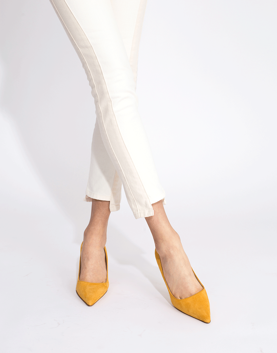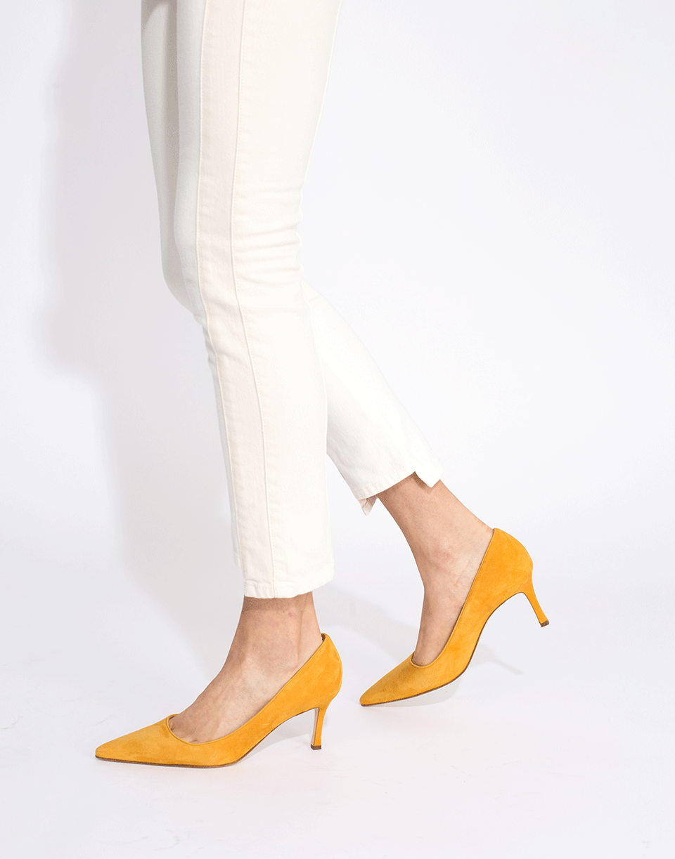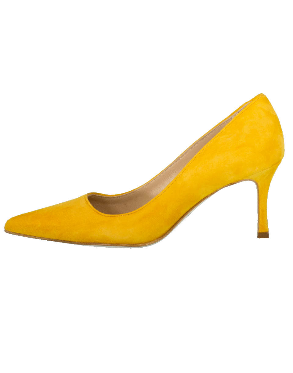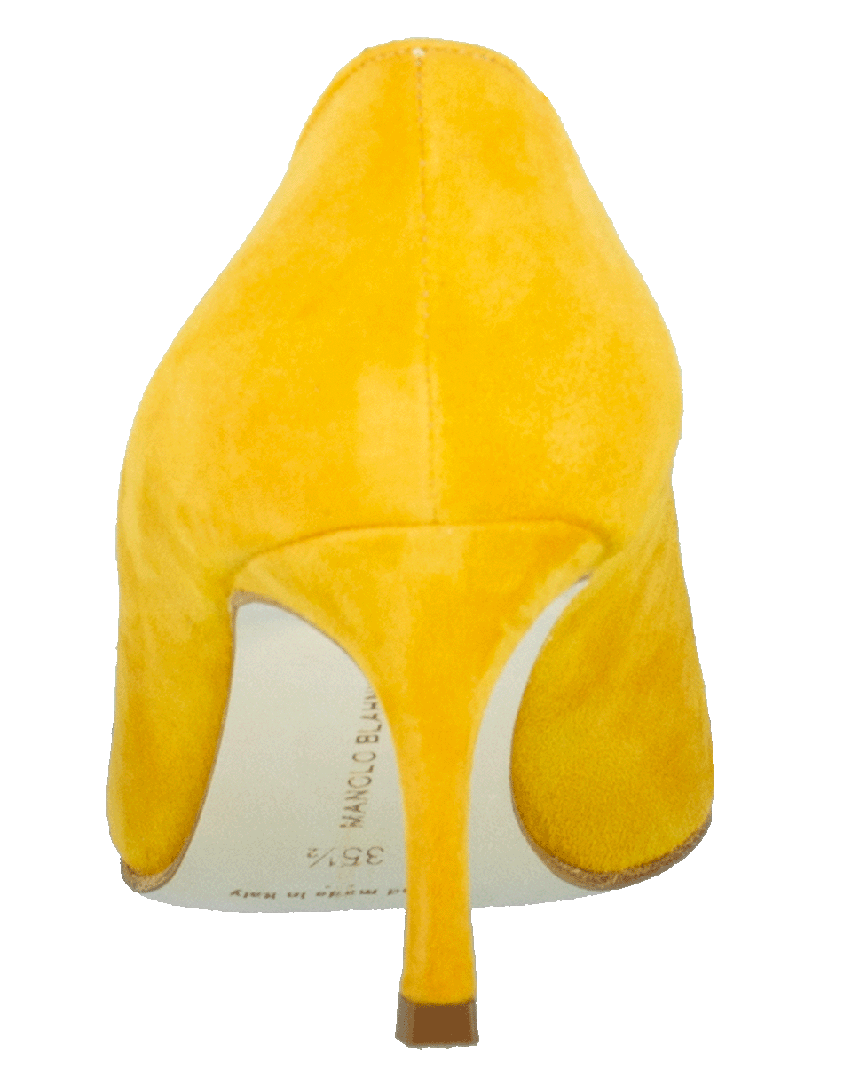 Manolo Blahnik yellow suede Newcio pump featuring a stiletto heel with a pointed toe.