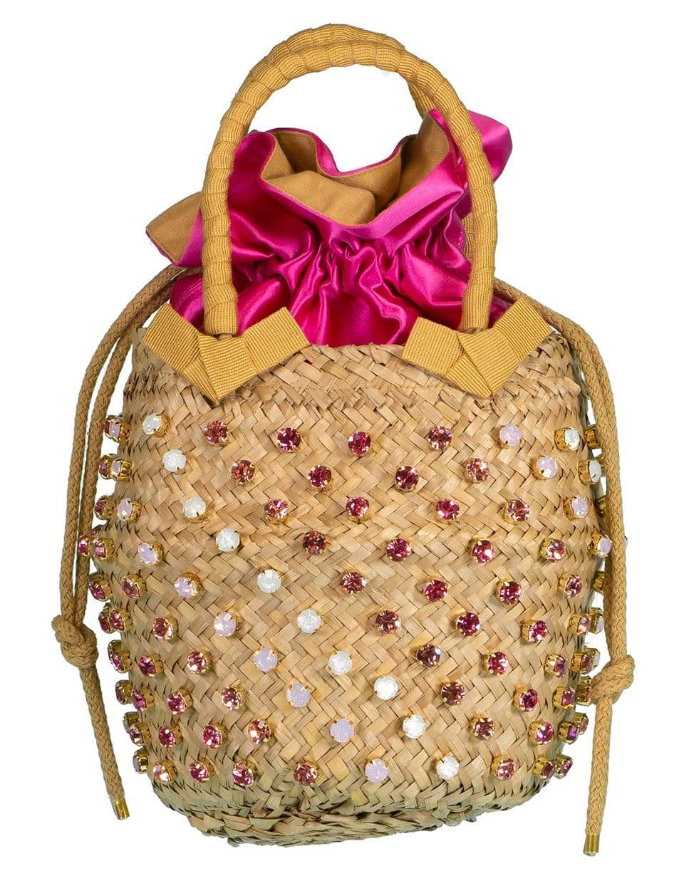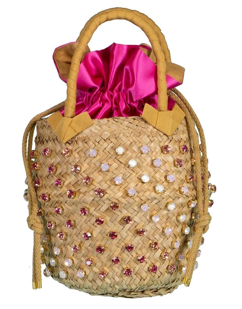 Le Nine Nina Shadow Rose raffia basket bag with white opal and pink crystal stones, double top handles, and an interior drawstring bag.
