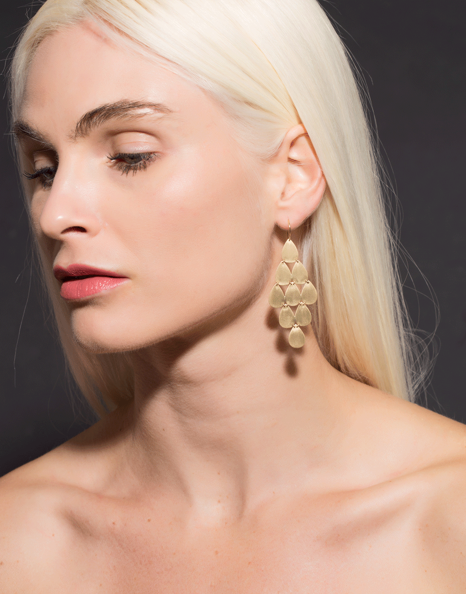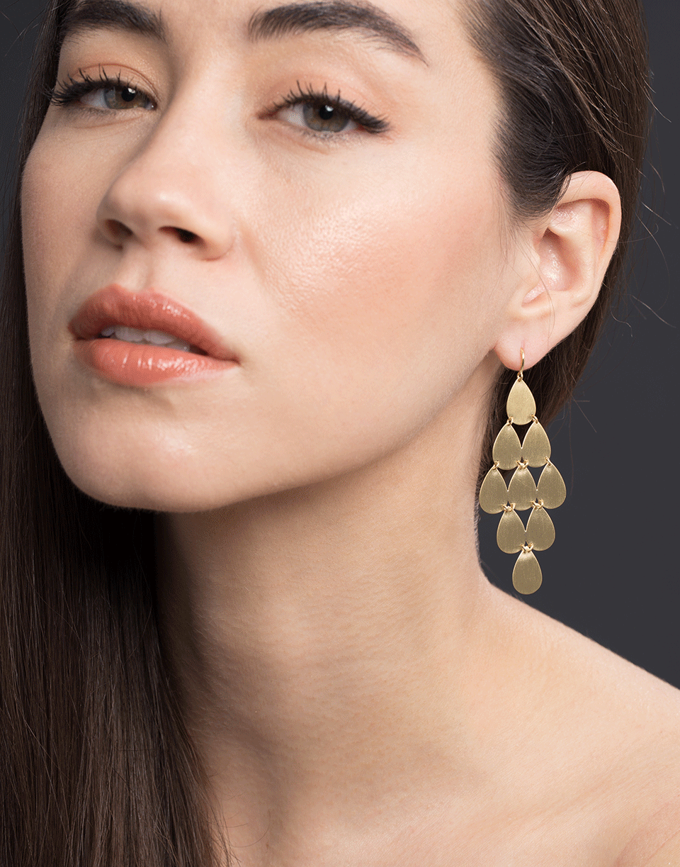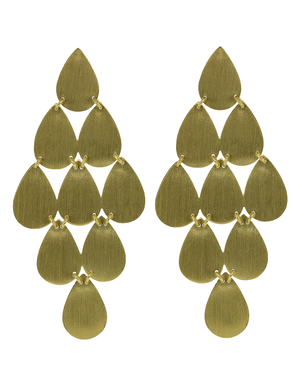 Handcrafted 18k yellow gold Irene Neuwirth Chandelier earrings with nine flat pear shape drops linked together to create fluid movement. Push back closures for pierced ears.