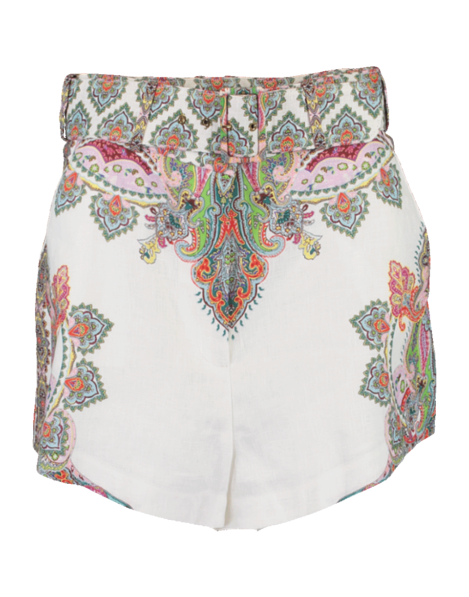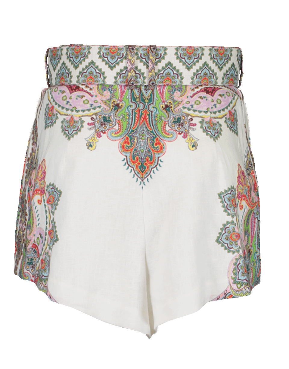 This high-rise waist mini tailored short by Zimmermann features a multicolored paisley-print with a removable matching belt, side slash pockets and a concealed front button/zip closure.