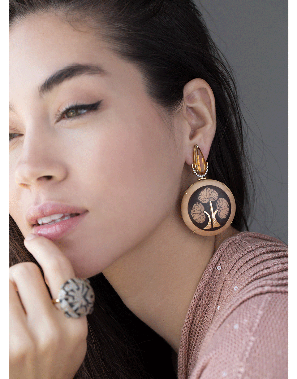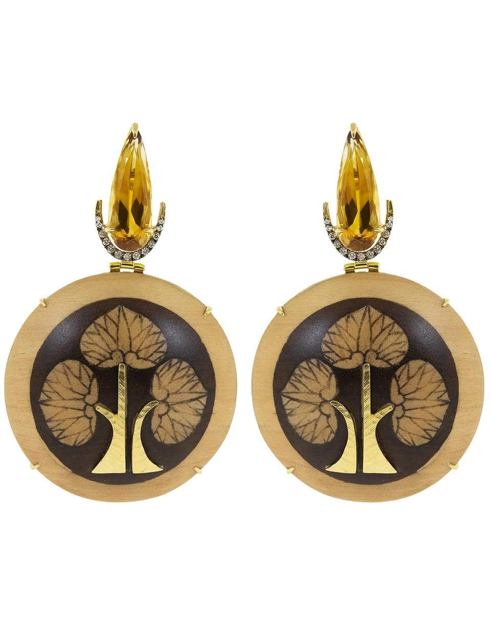 Silvia Furmanovich Obi round marquetry japanese family tree earrings with cognac citrine and light brown diamonds. For pierced ears.