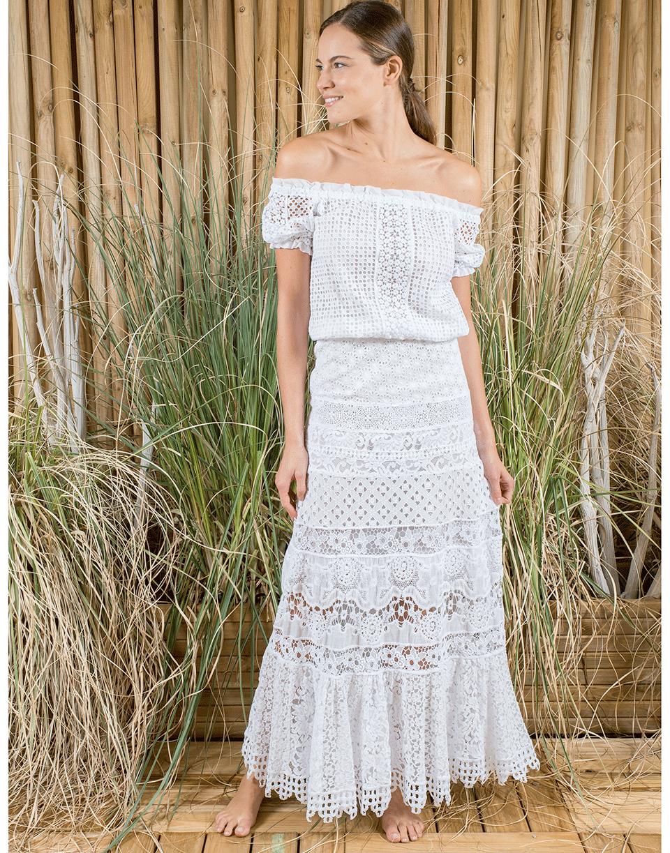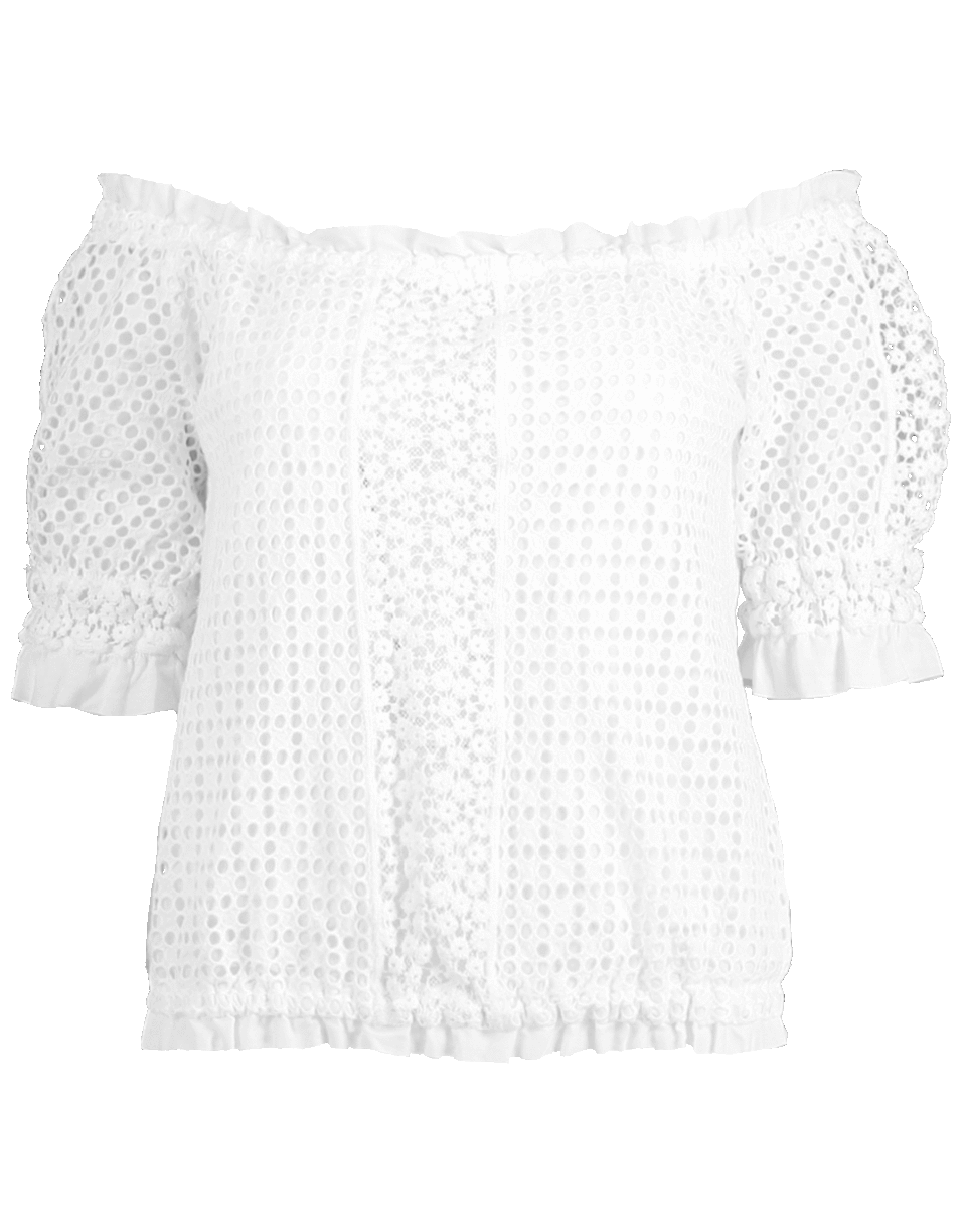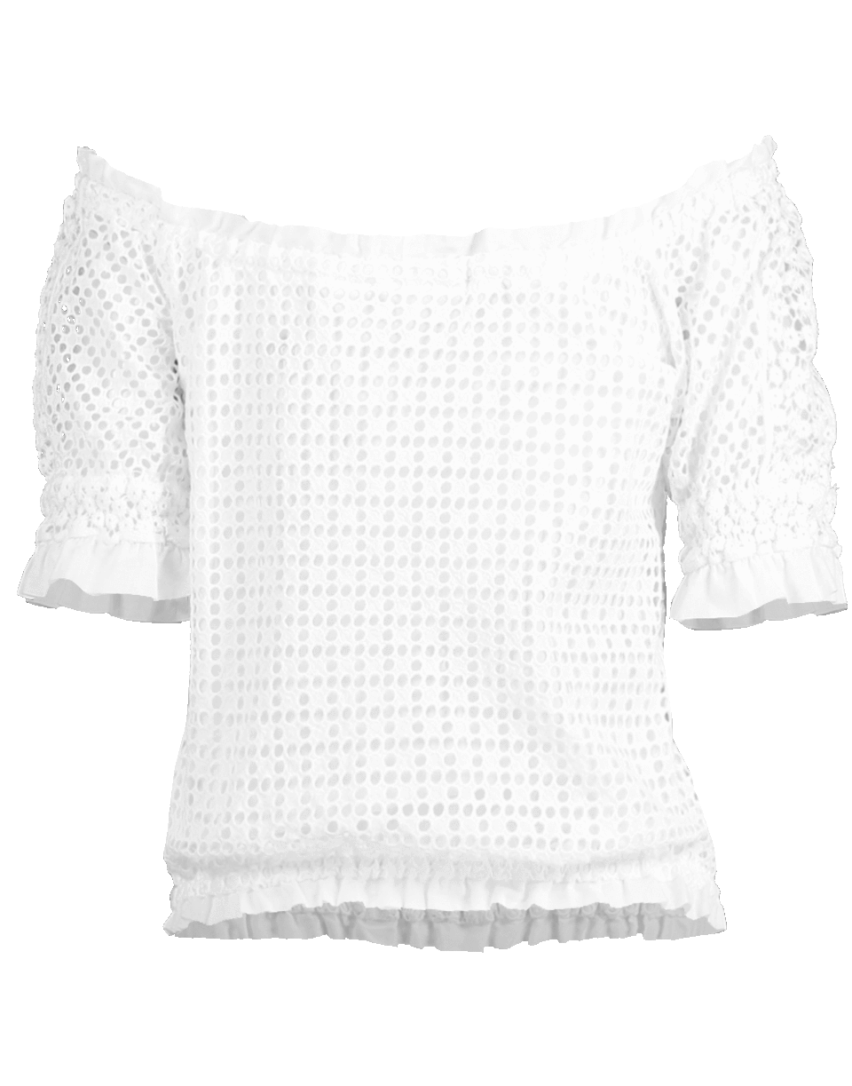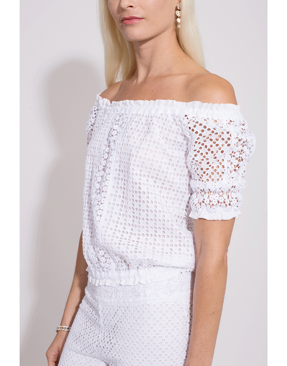 Off-shoulder Avellino top by Temptation Positano. This off-shoulder cropped top features a boat neckline, puff short sleeves with ruffle trim, slip over style, regular fit, and an embroidered design throughout.