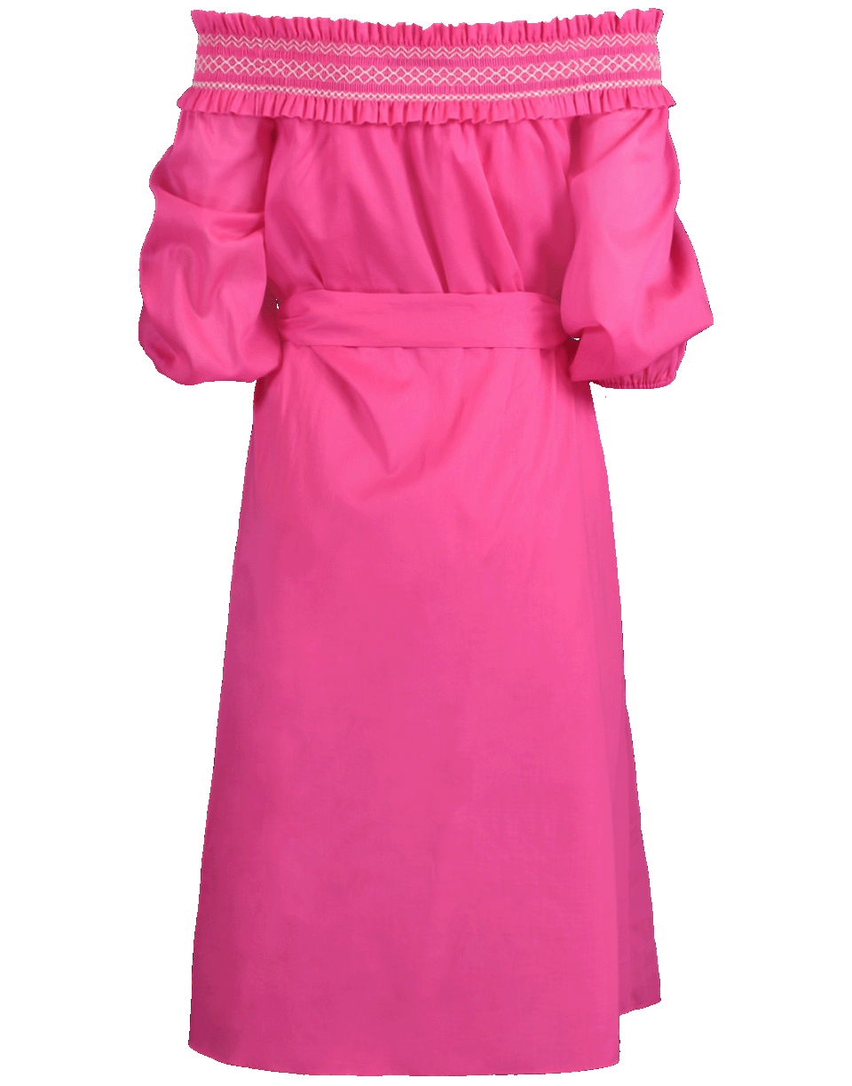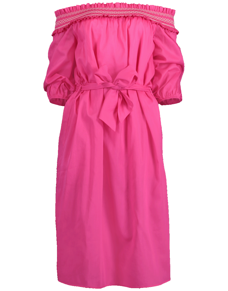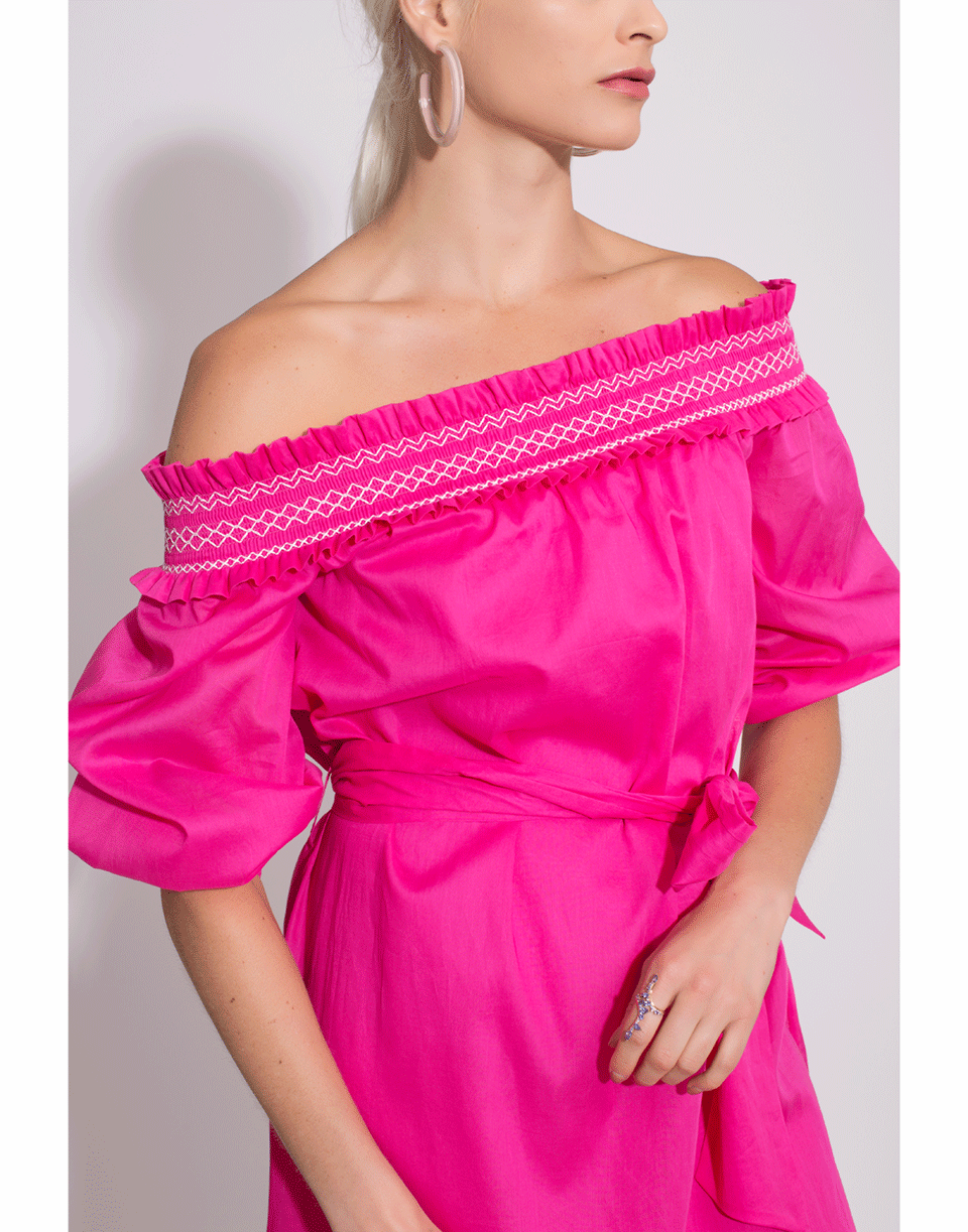 Off-shoulder belted dress by Blumarine. This fuchsia dress features an off-shoulder style with an elasticated ruffle boat neckline and ¾ length sleeves, knee length, regular fit, tie belt to cinch in waist and a straight hem.