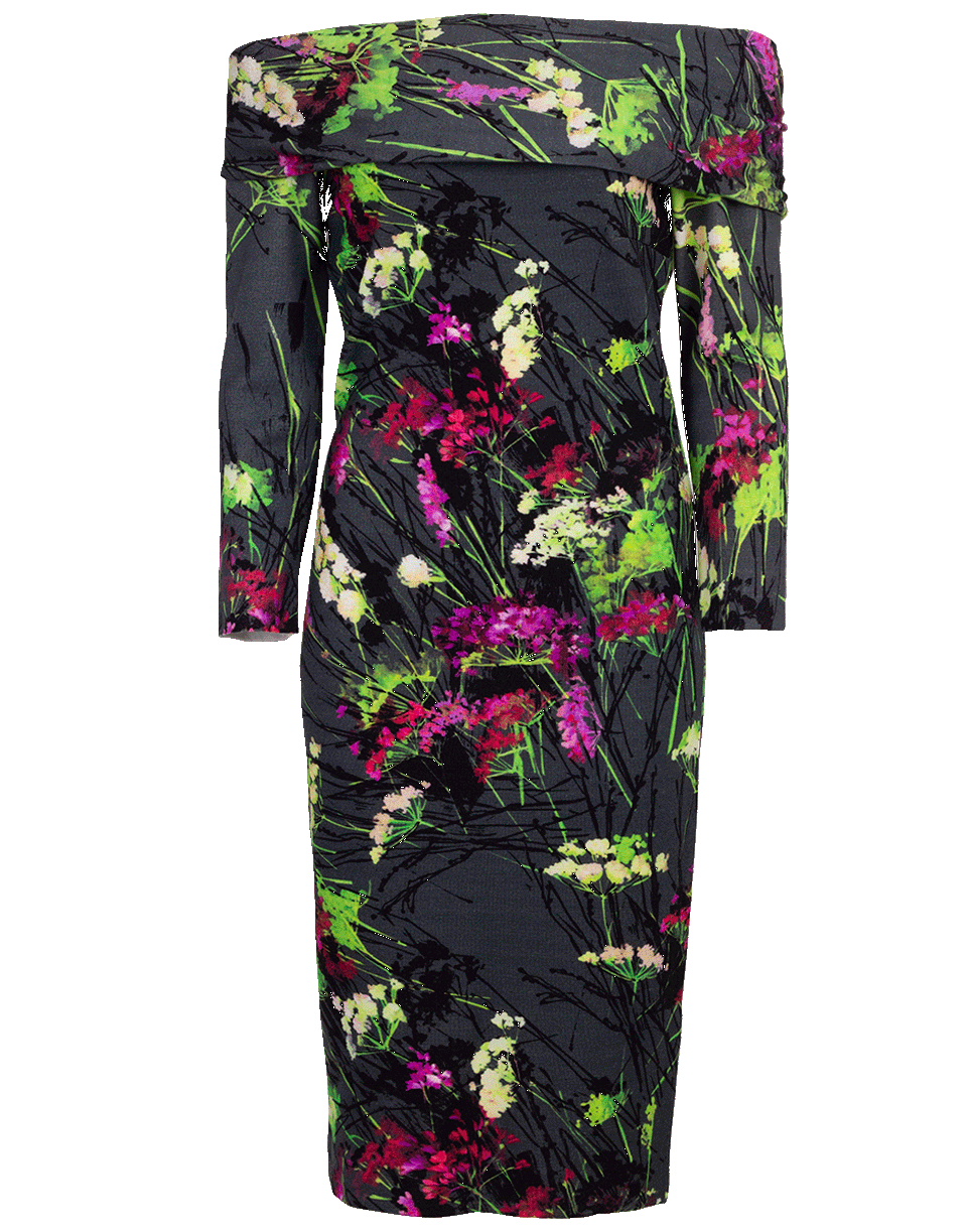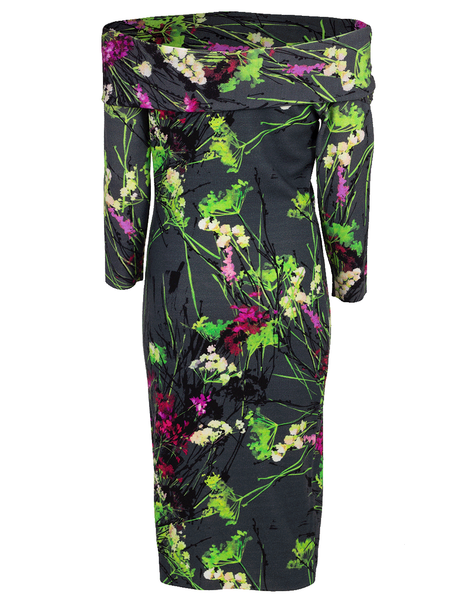 Off shoulder floral print dress from Blumarine featuring 3/4 length sleeves, off shoulder design, mid-length, slim fit, and a pullover style.