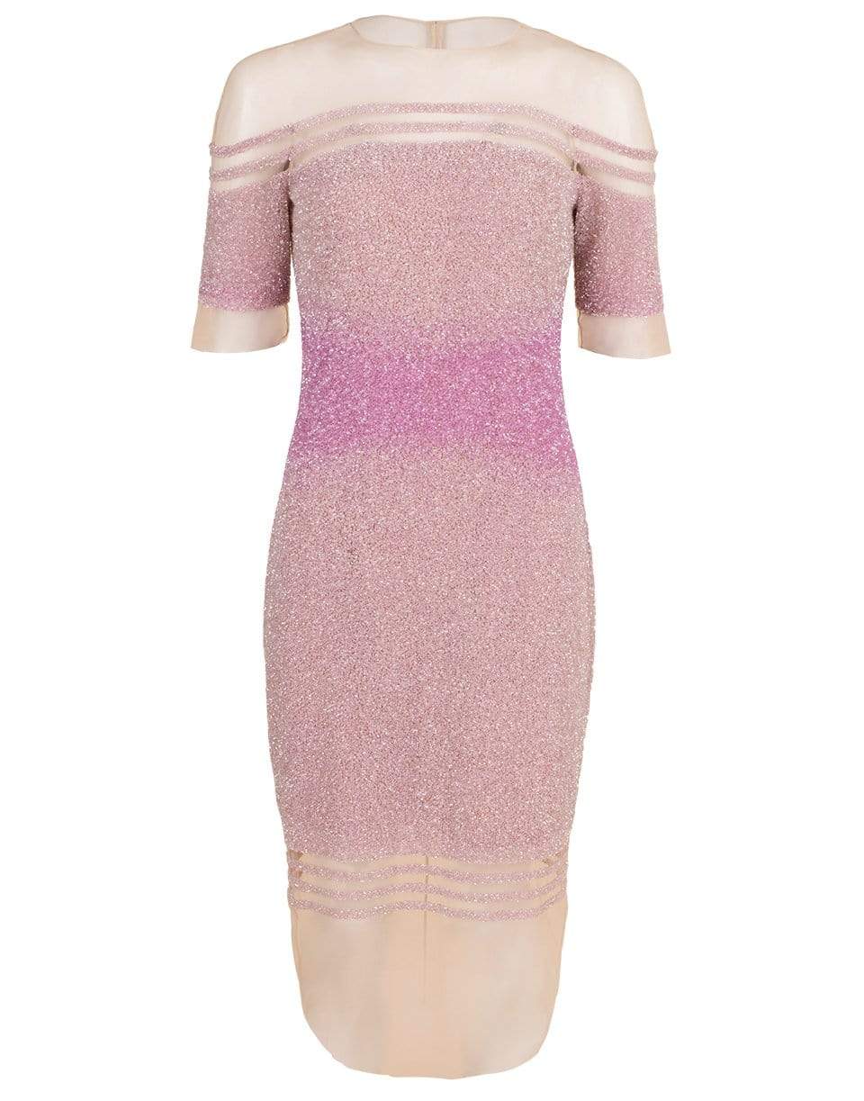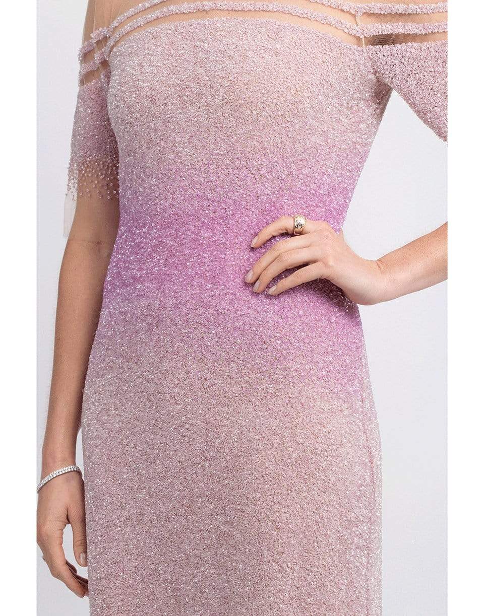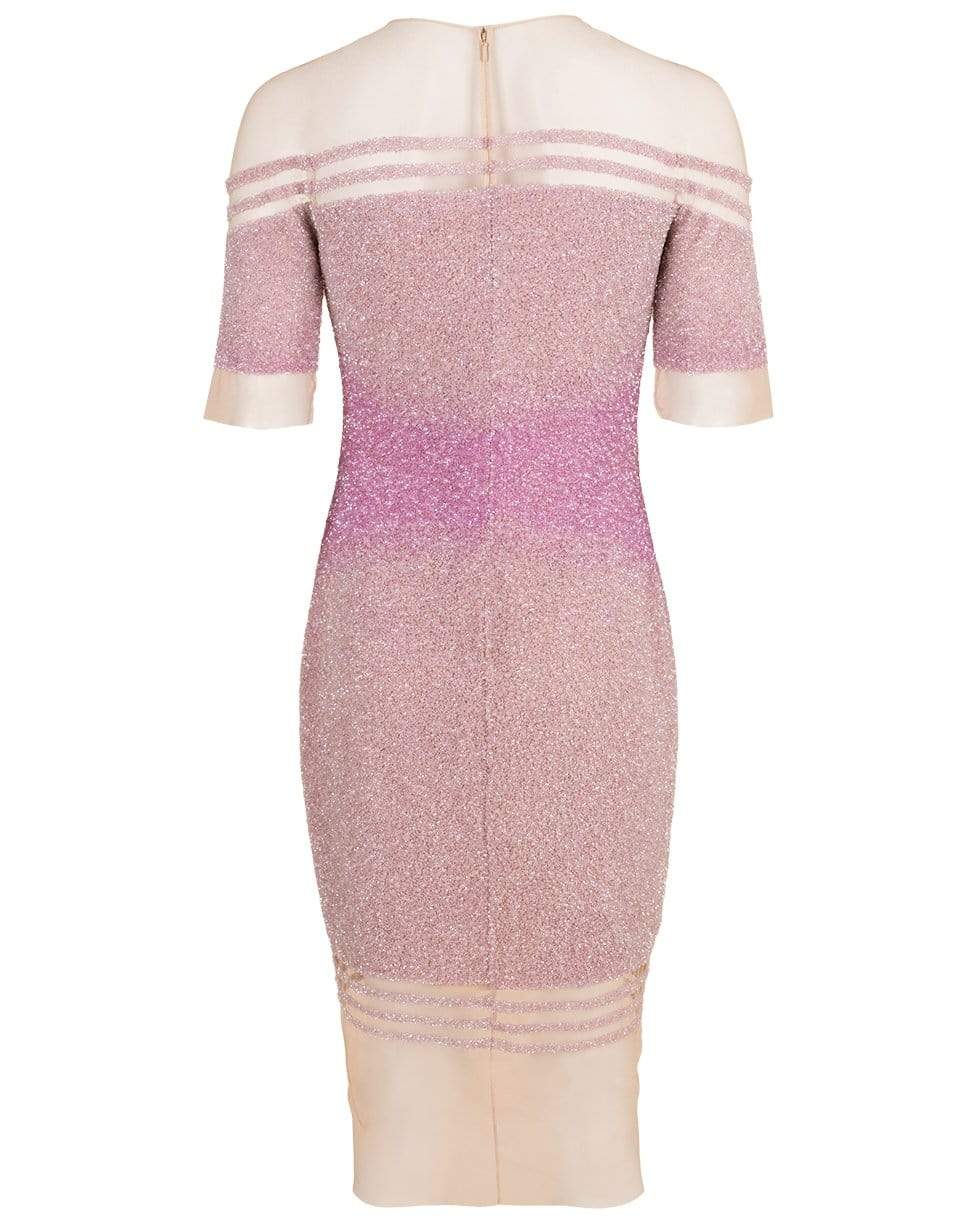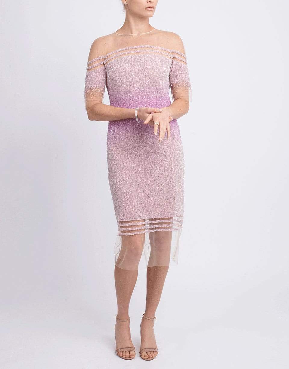 Off the shoulder illusion sequin dress from Pamella Roland featuring a fitted silhouette, short sleeves, round neckline, back zip closure, and a knee length.
