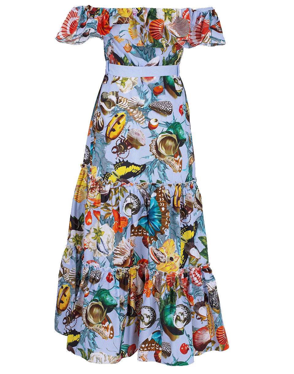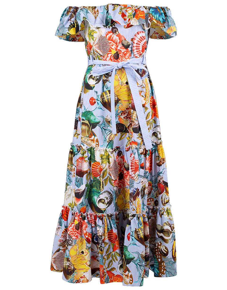 Off the shoulder Nata Dalia Dress by Mary Katrantzou. This cotton-poplin maxi dress features a floral and seashell print, off the shoulder style with ruffles around the edges, concealed zip fastening at back, contrasting light blue self-tie belt at waist and a tiered skirt.