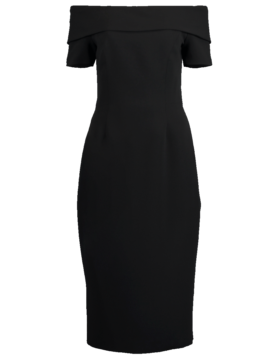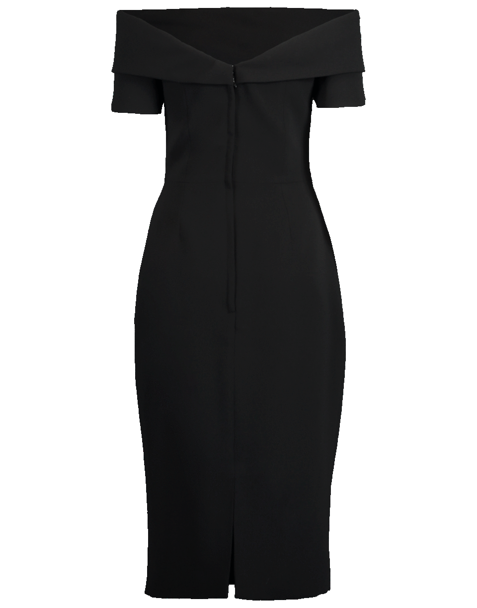 Cut for a flattering fit, this LBD dress from Catherine Regehr is prepared to accentute your curves. It features an off-the-shoulder neckline with a delicately scooped back, back slit, midi length, and a concealed back zip.