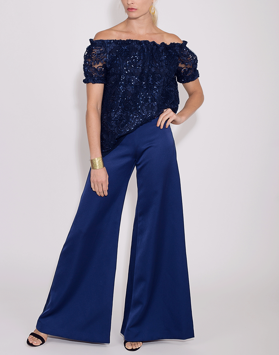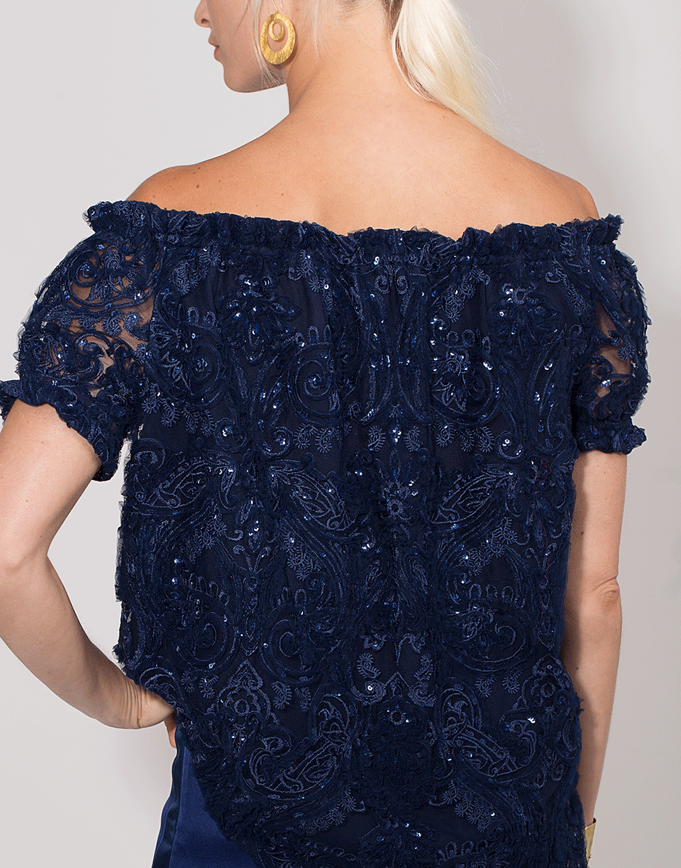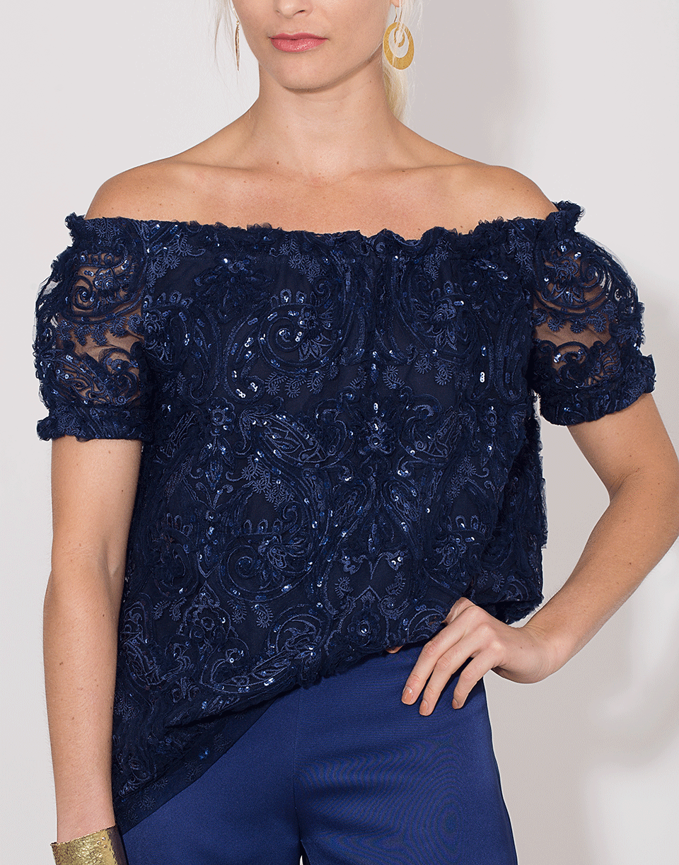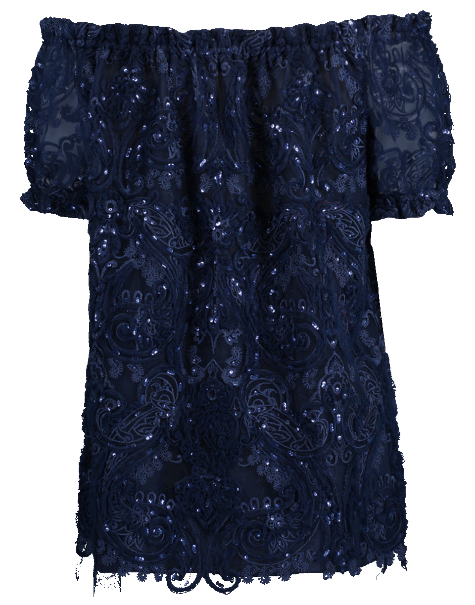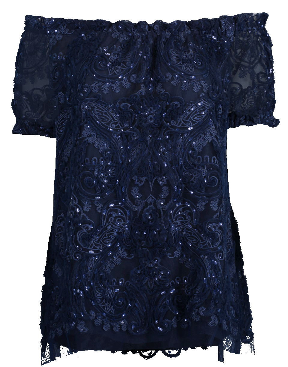 This navy embroidered top by Naeem Khan features an off the shoulder design with an elastic neckline, short sleeves, tunic style and a loose silhouette.