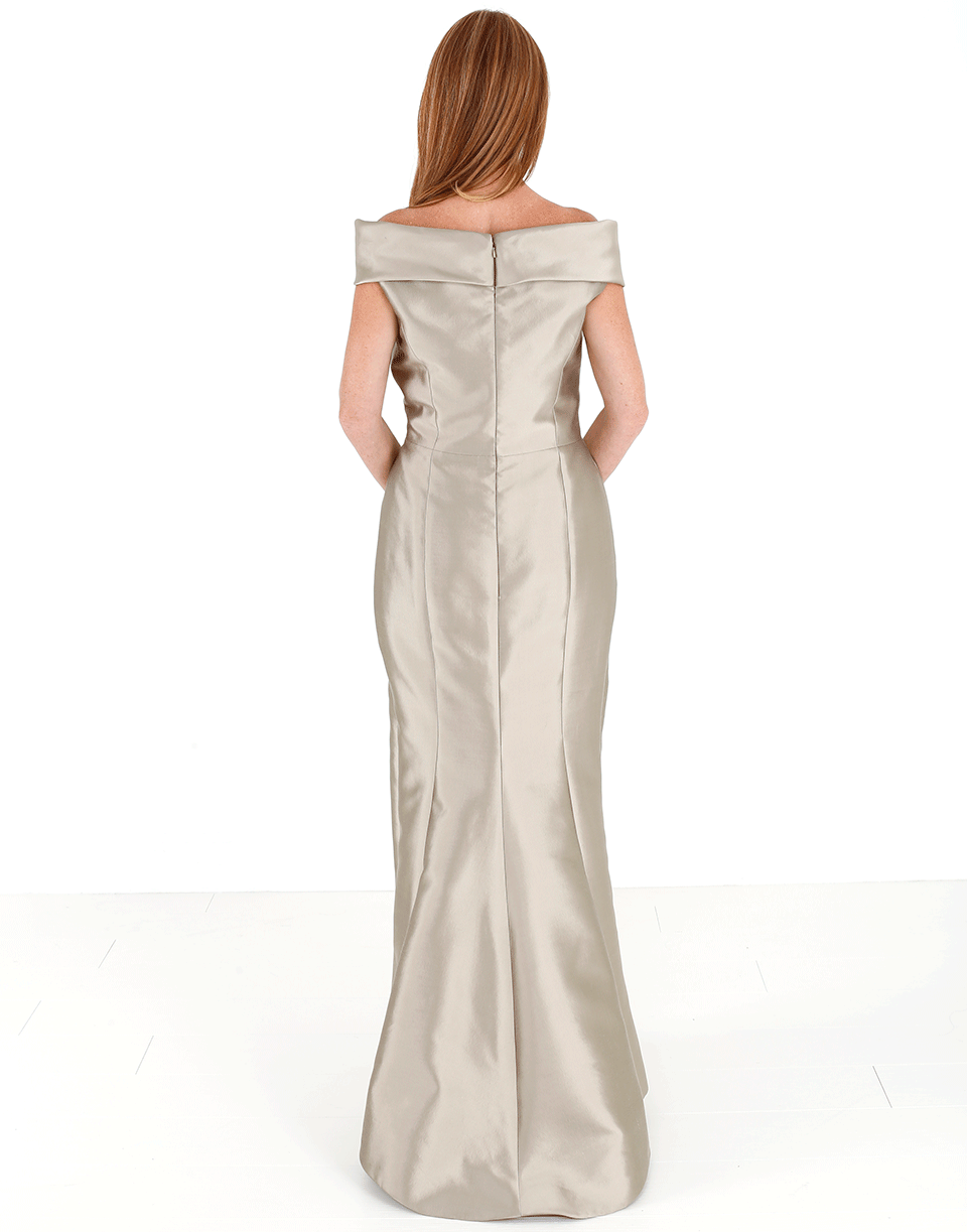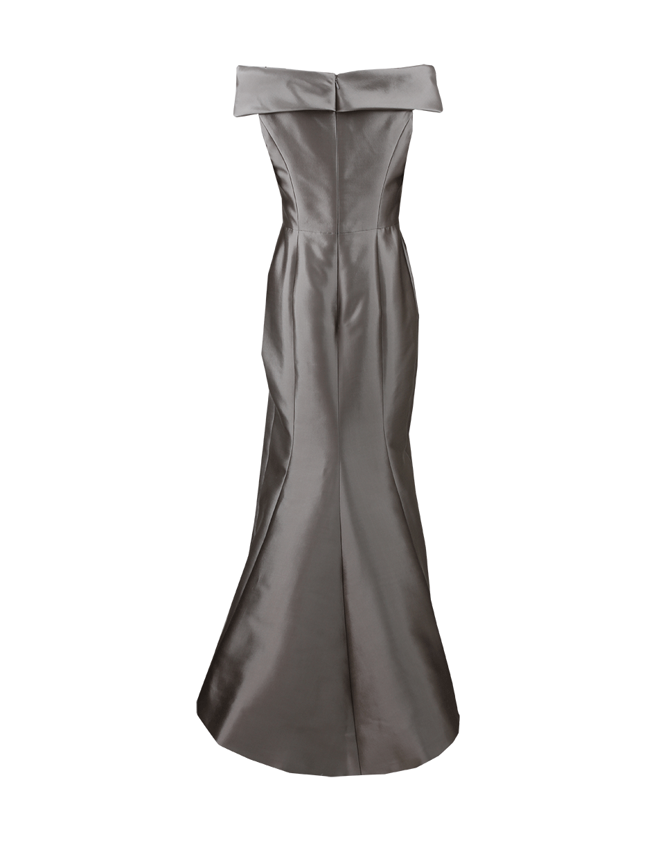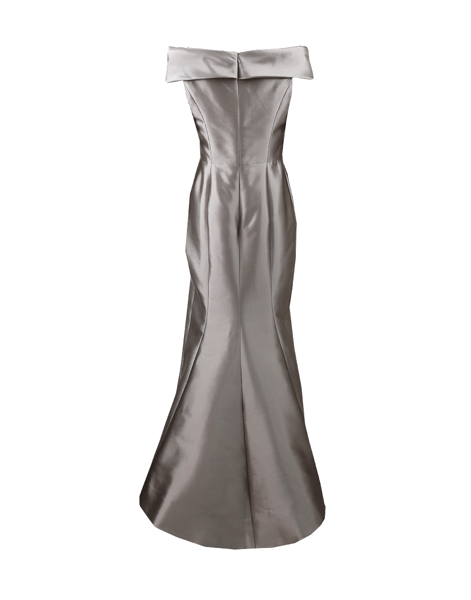 Criss-Cross Front With Draping Foldover Detail And Off-The-Shoulder Design, And Back Reinforced Train