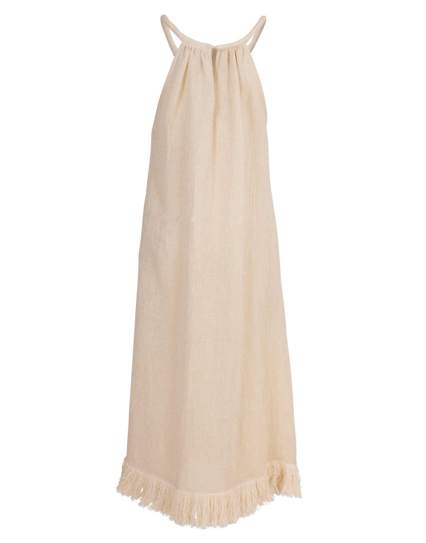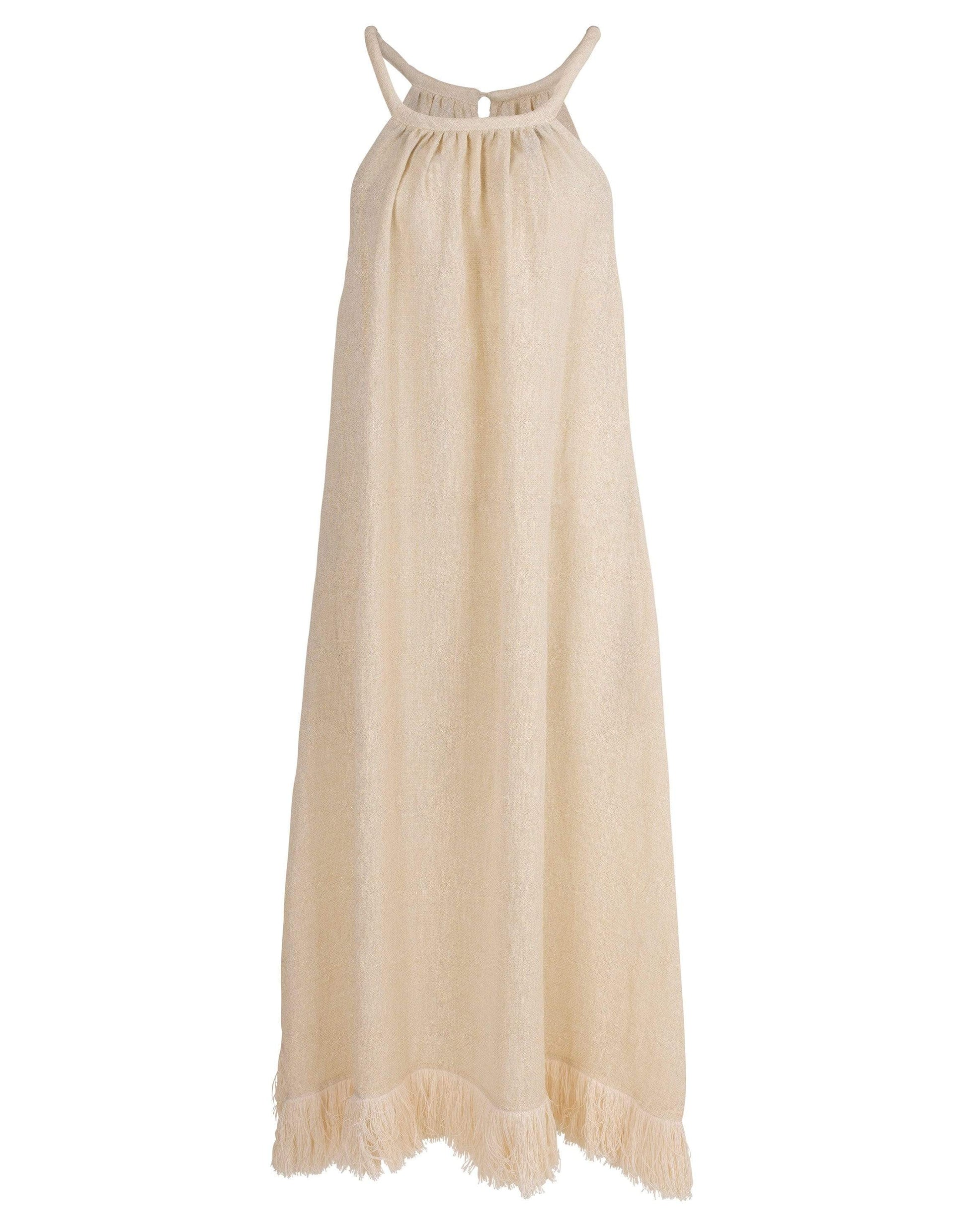 This Lisa Marie Ojai white gauze fringe dress features an A-line silhouette that offers a flattering fit with an exaggerated fringe hem, round neckline, sleeveless cut, and a mid-length.