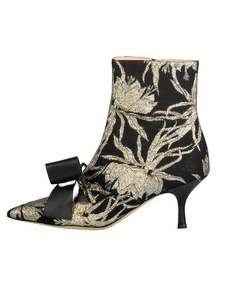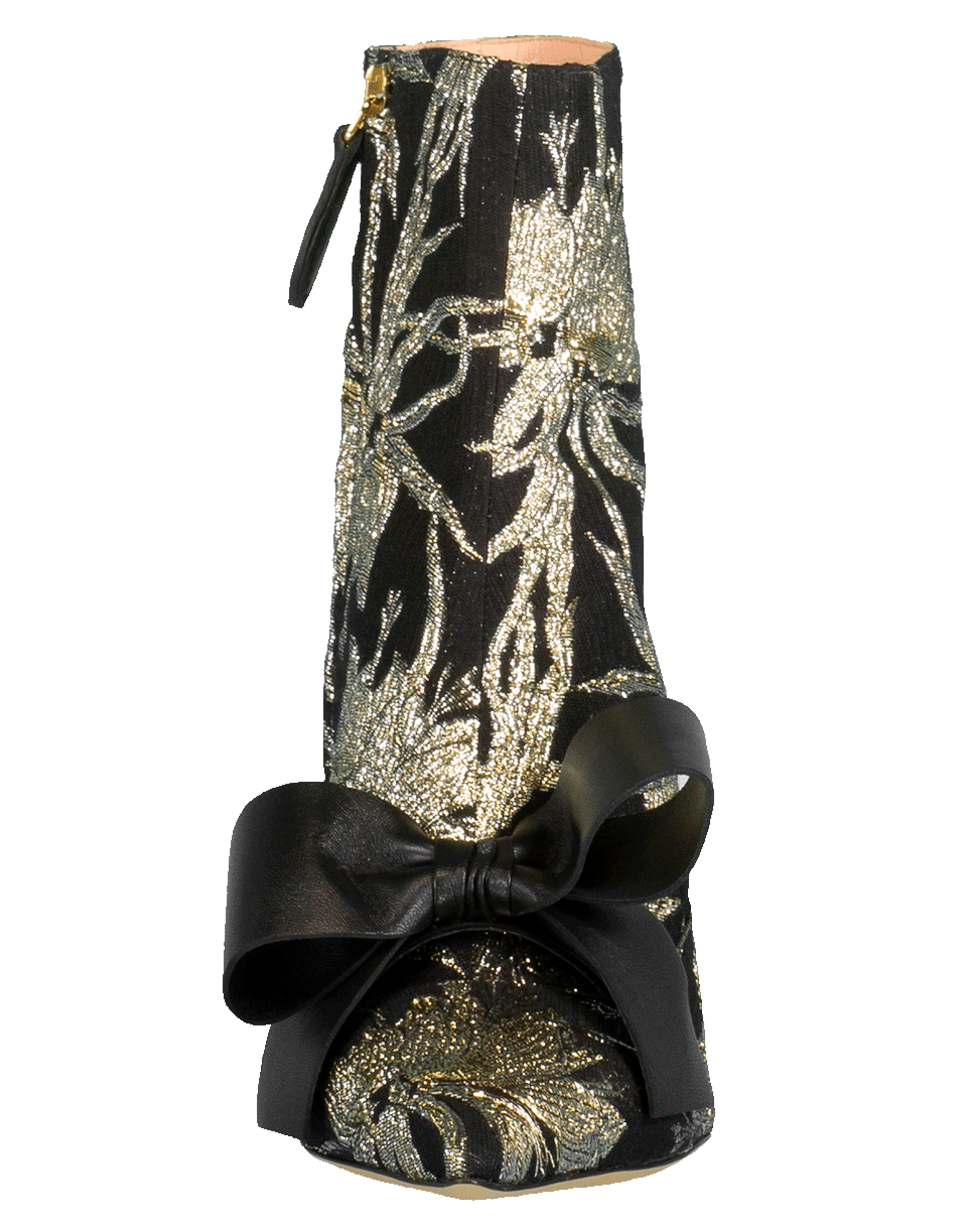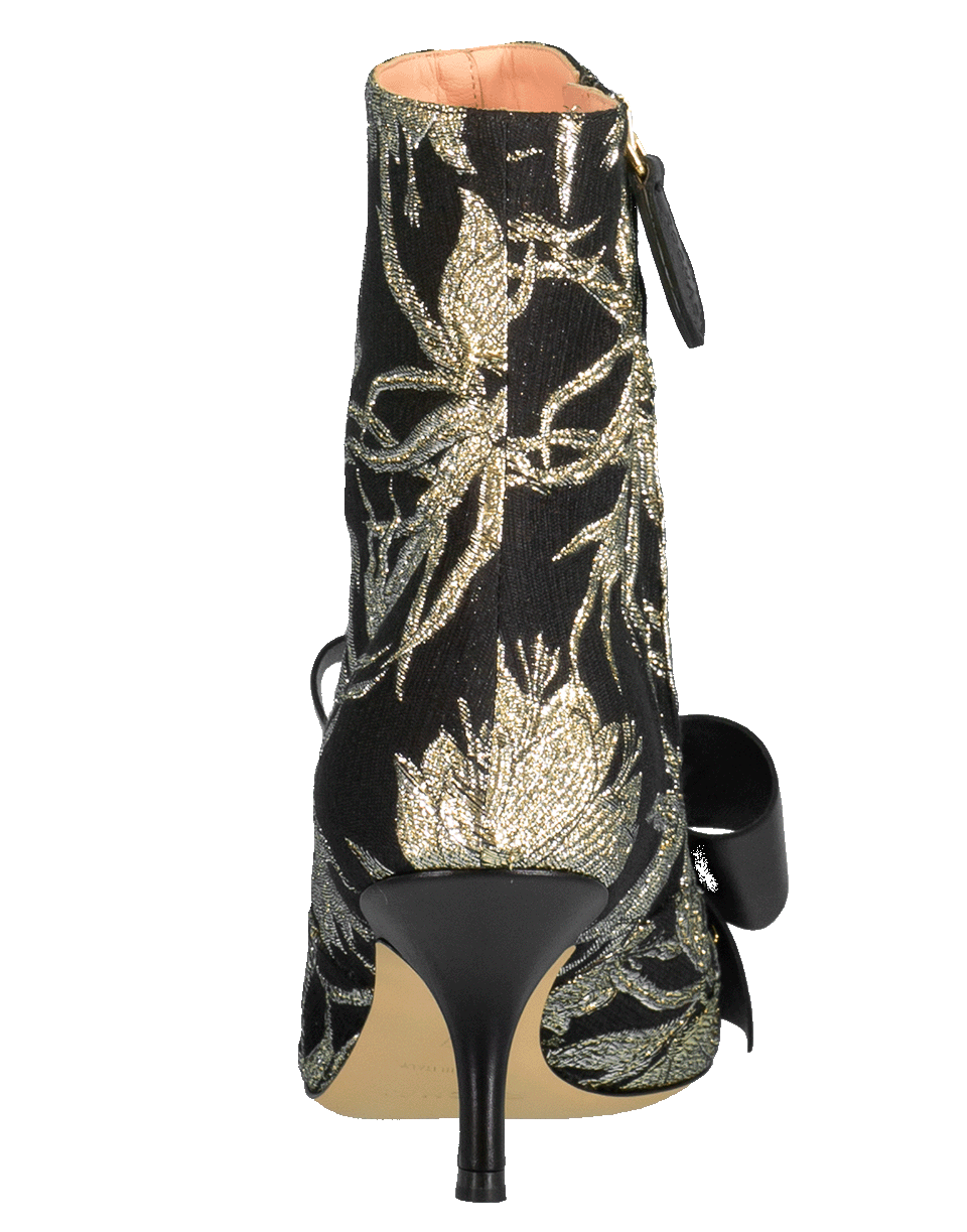These Olona booties from Rochas have a pointed toe silhouette with a black satin bow, metallic brocade pattern and finished with a 60mm heel. Leather sole.