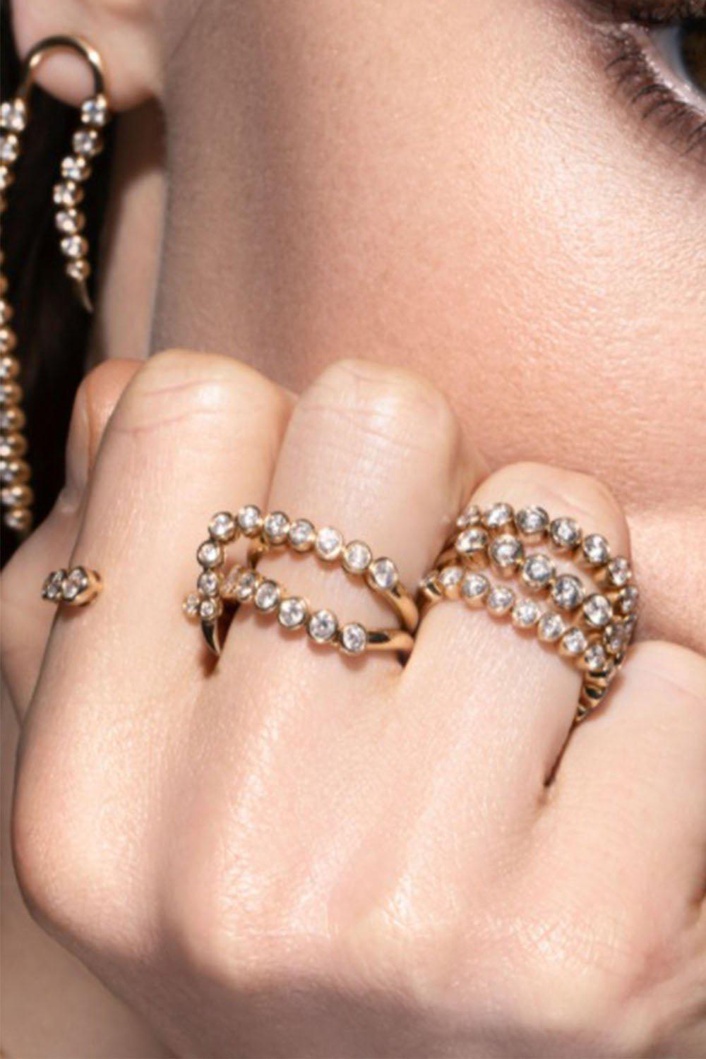 The Capri ring is the must-have articulated diamond band ring. A single row of bezel-set diamonds are articulated by master artisans to drape elegantly across your finger and move with your every movement.
