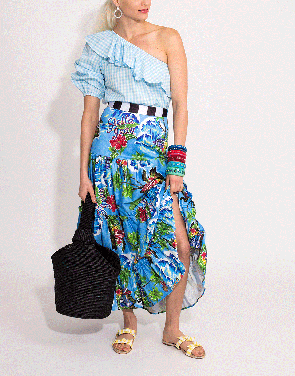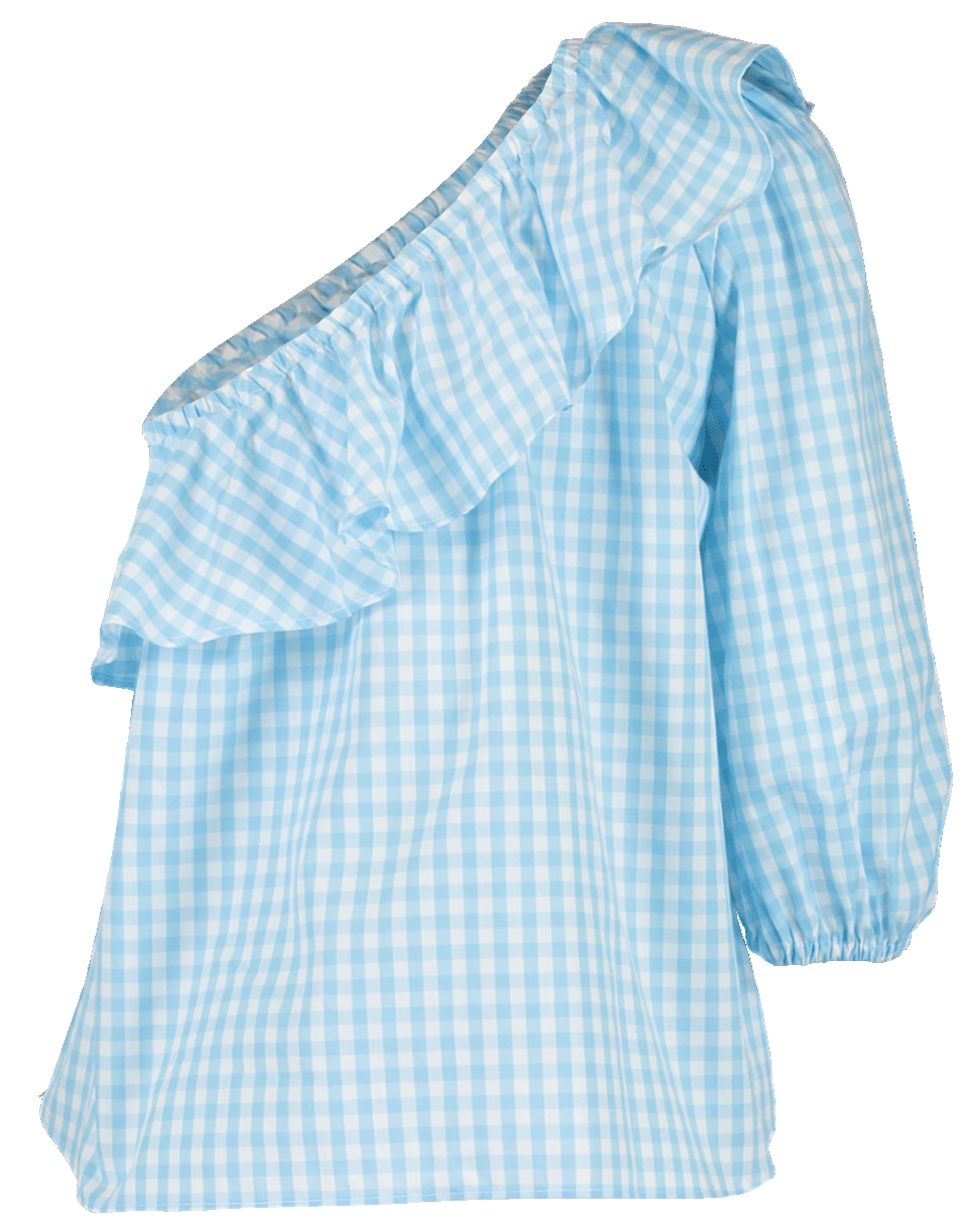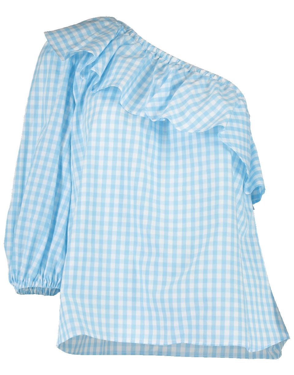 Blue and white one-shoulder checked top by MDS Stripes. This loose slip-on cotton top is made with summer in mind. It features ruffling around the neckline and one off-the-shoulder ¾ length sleeve with an elasticized edge.