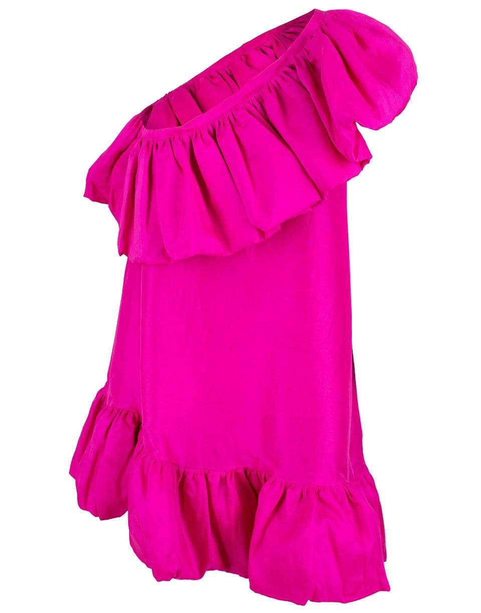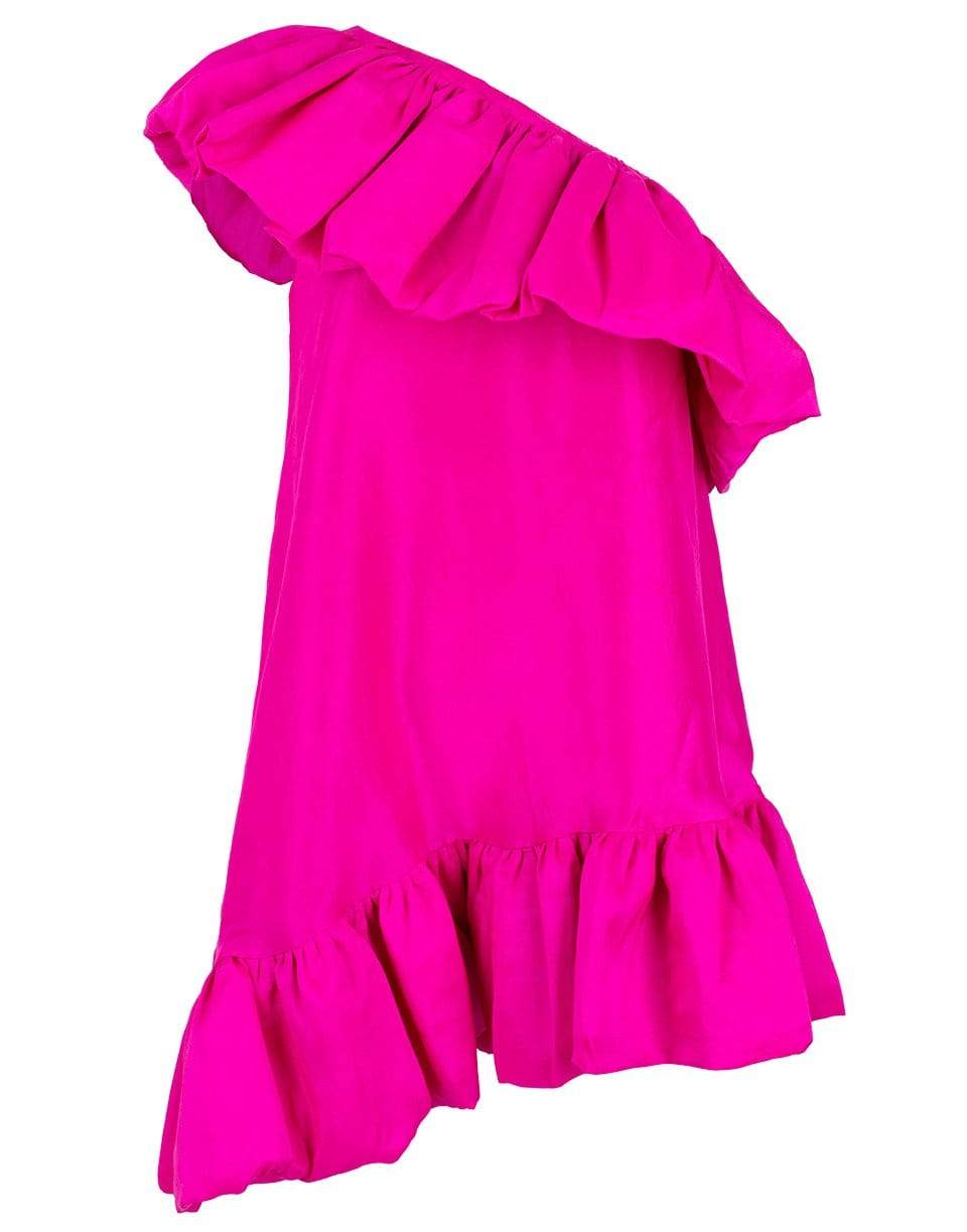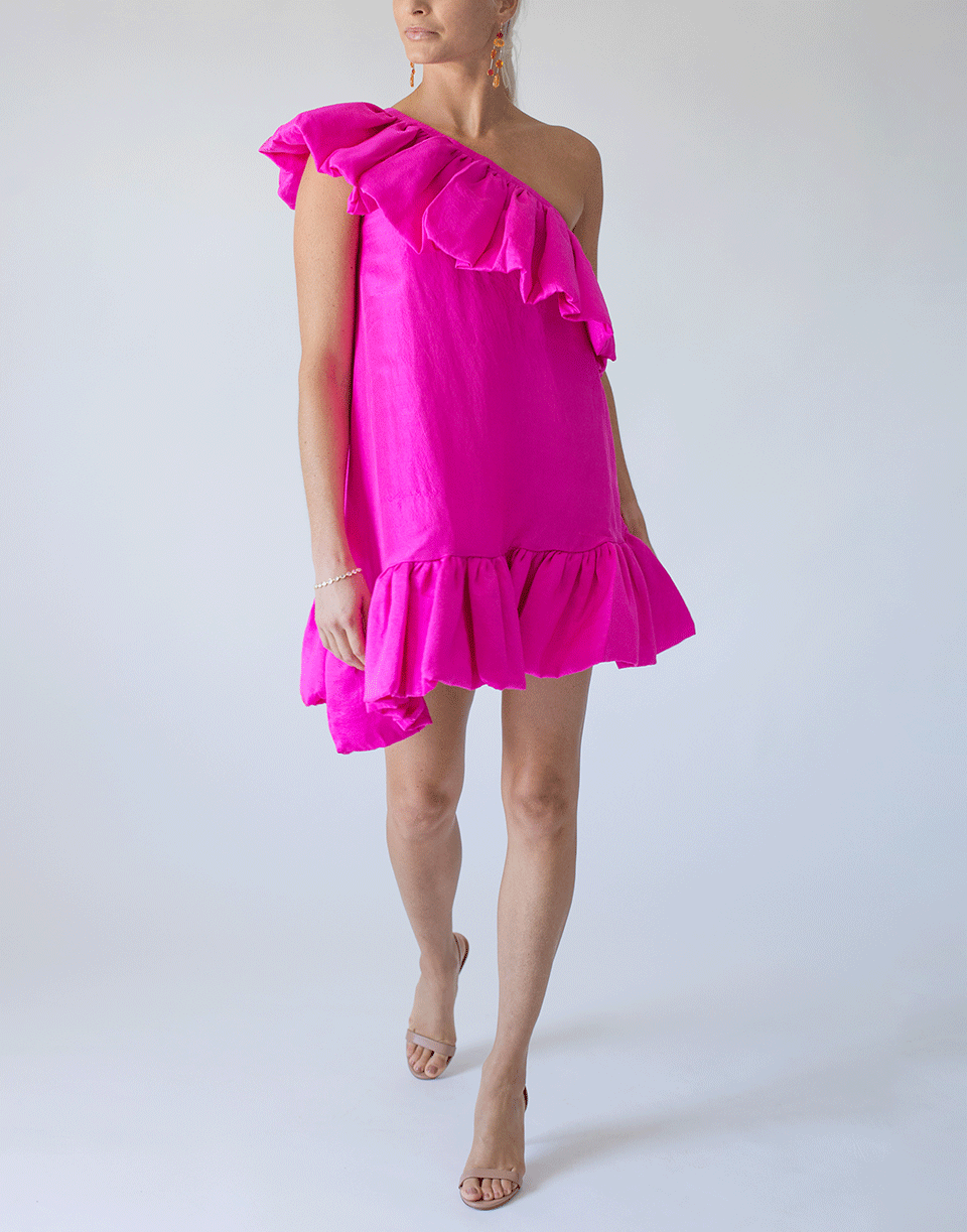 The Whitney mini dress is a one-shoulder trapeze dress, with full gathered ruffles and neckline and hem. Slips on with elasticated neckline. Non-stretch fabrication.