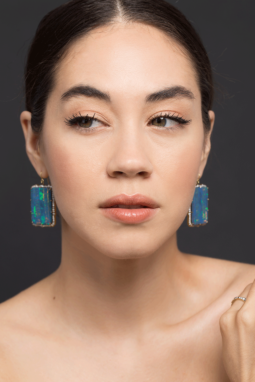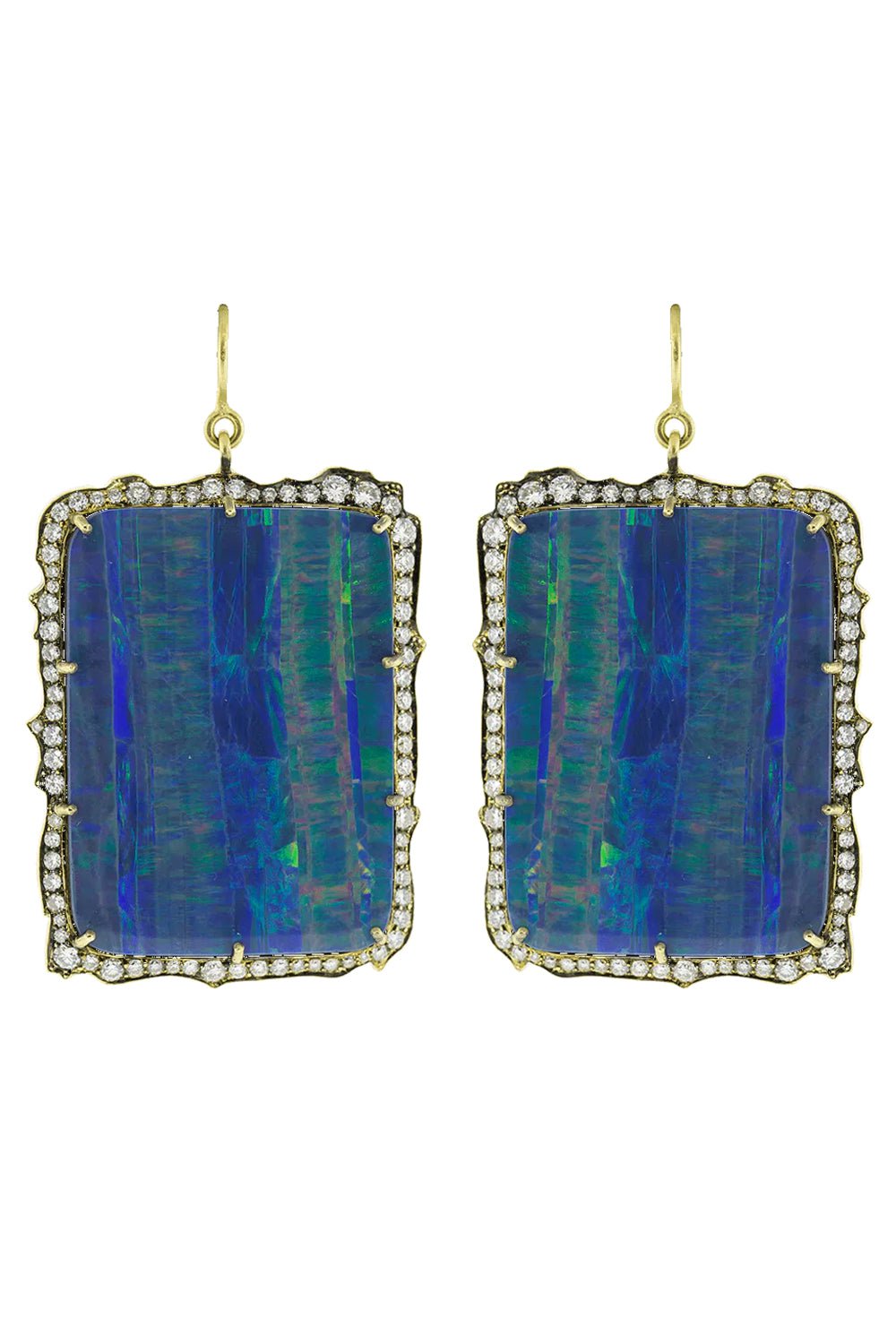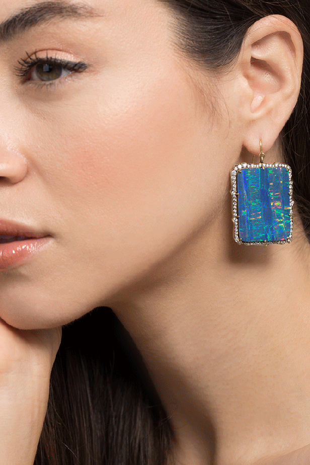 Stunning rectangle opal drop earrings with round brilliant cut diamonds for pierced ears.