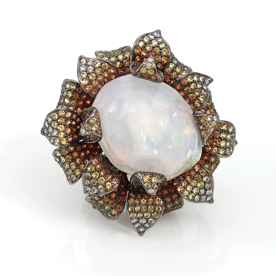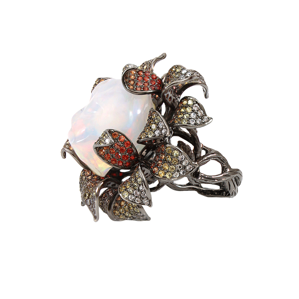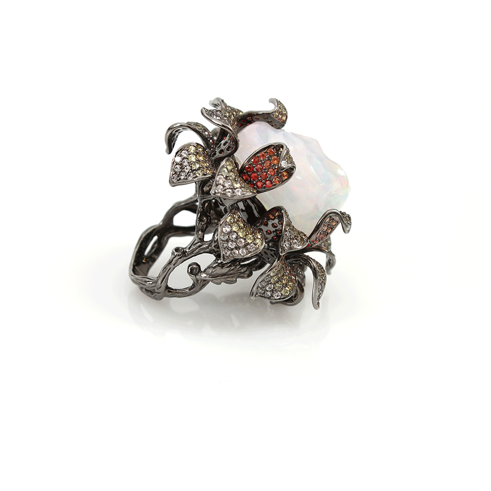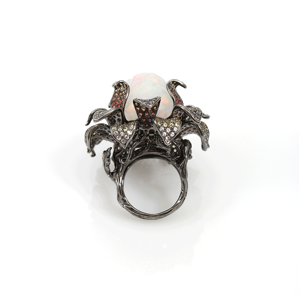 Make a stunning statement in iridescence with Wendy Yue’s opal flower ring. Be sure to complete a naturally luxe look when you pair this ring with any day or evening ensemble. Size 7 2” x 2” x 1” Opal (38.76 CTW), Multi Color Sapphires (7.76 CTW) Available in 18K Black Gold