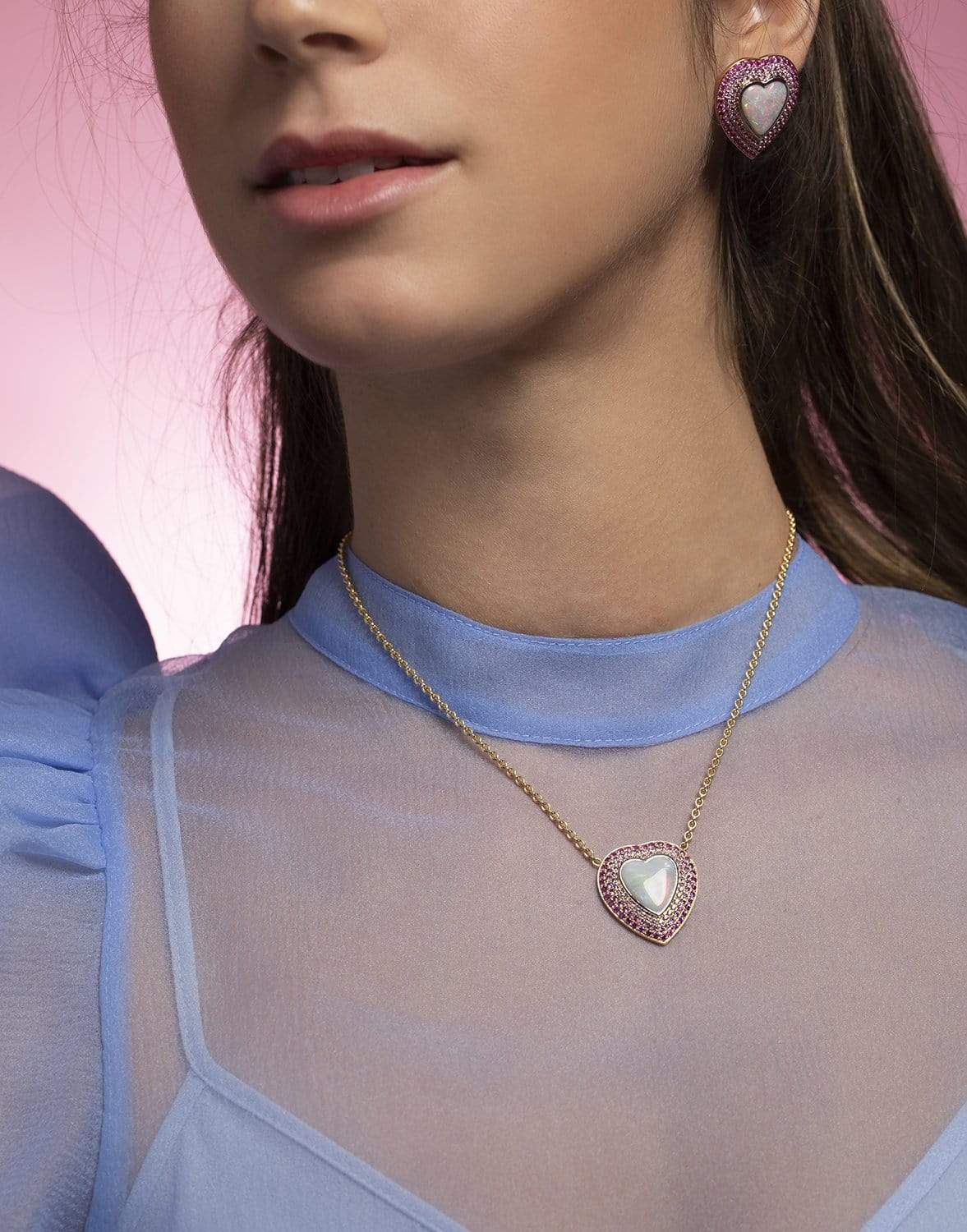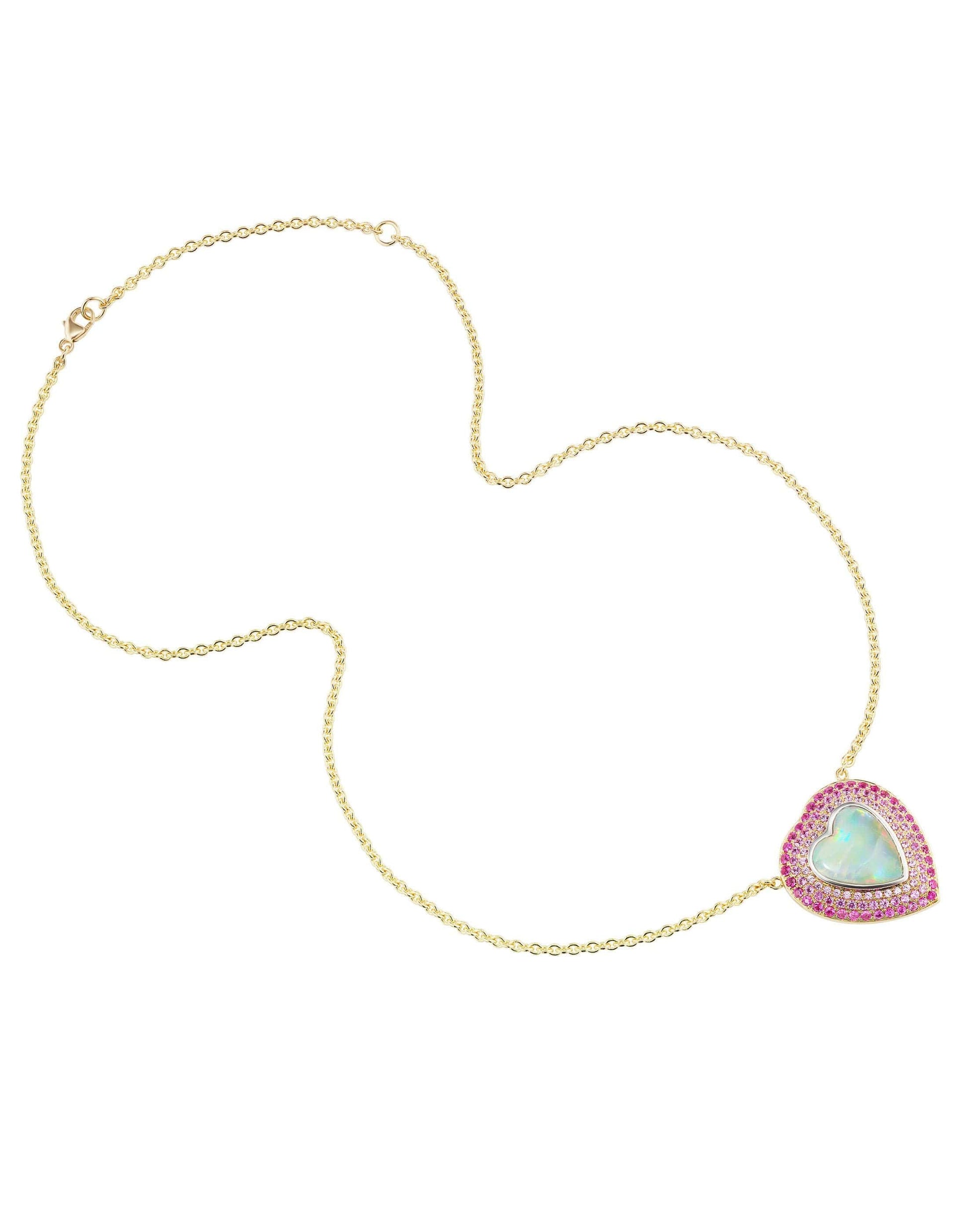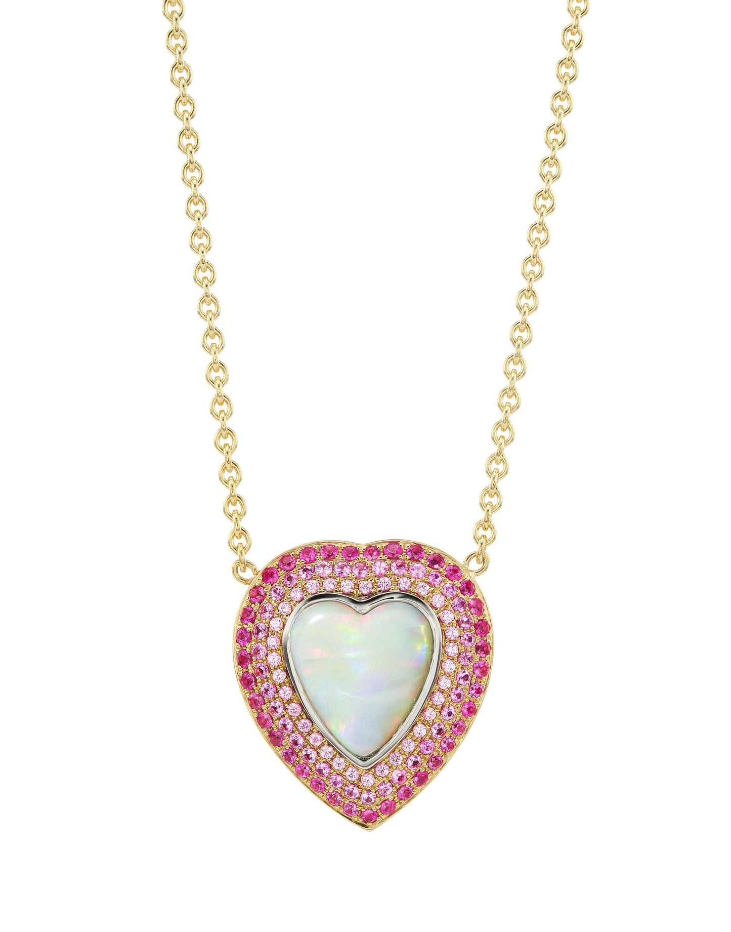 Emily P. Wheeler opal heart necklace. 18 karat yellow and white gold necklace with 5.04 carat Australian Opal and 1.9 carats of pink sapphire.