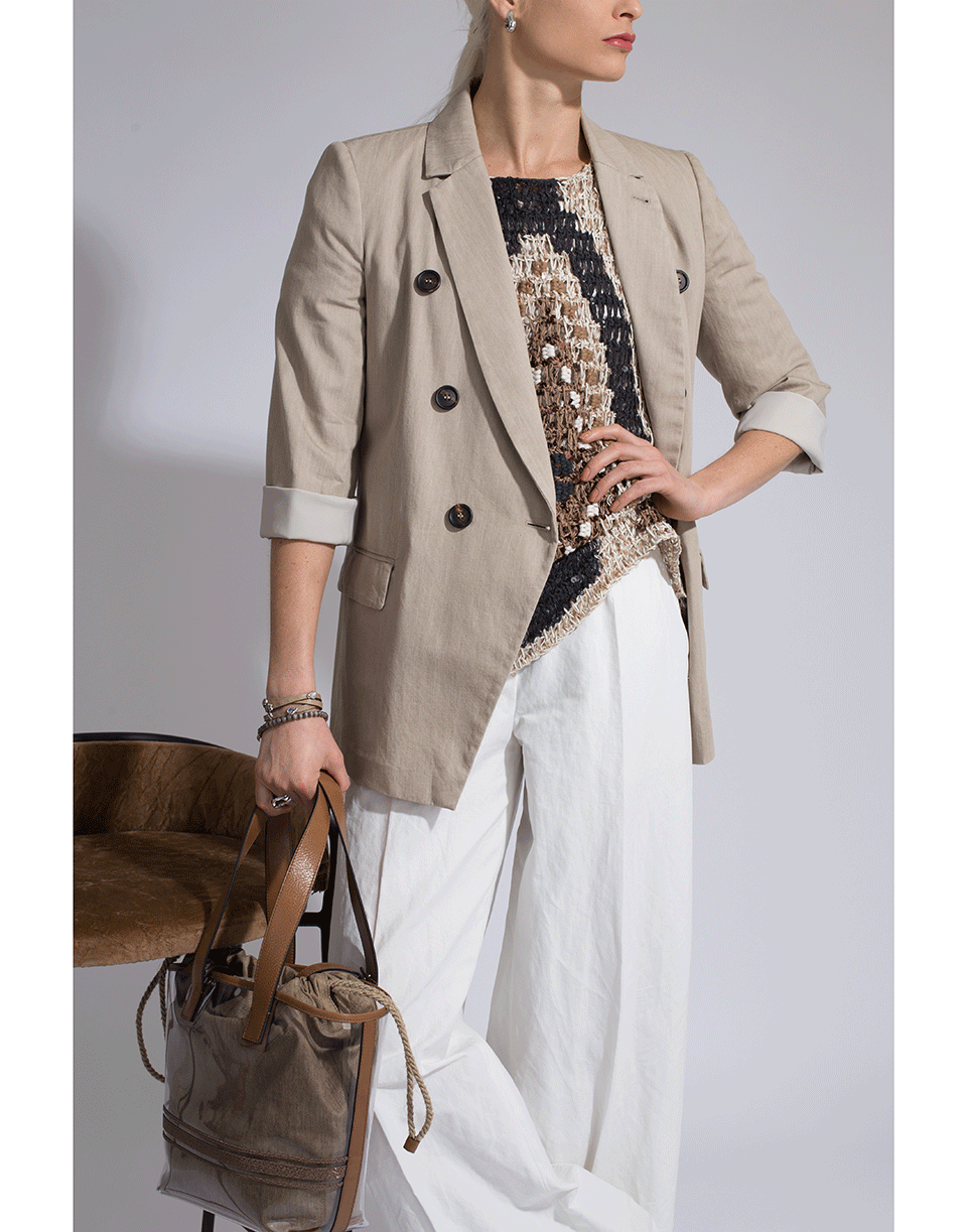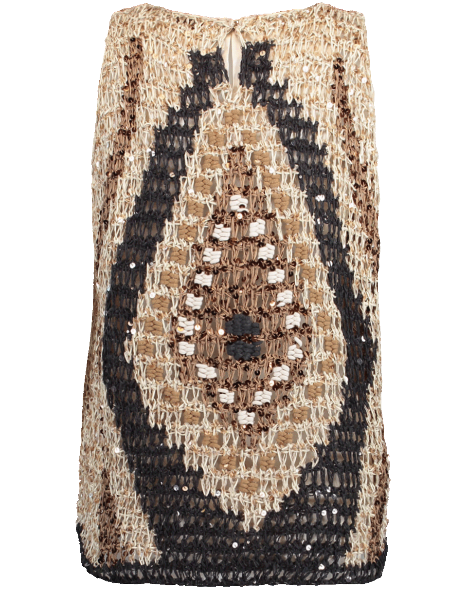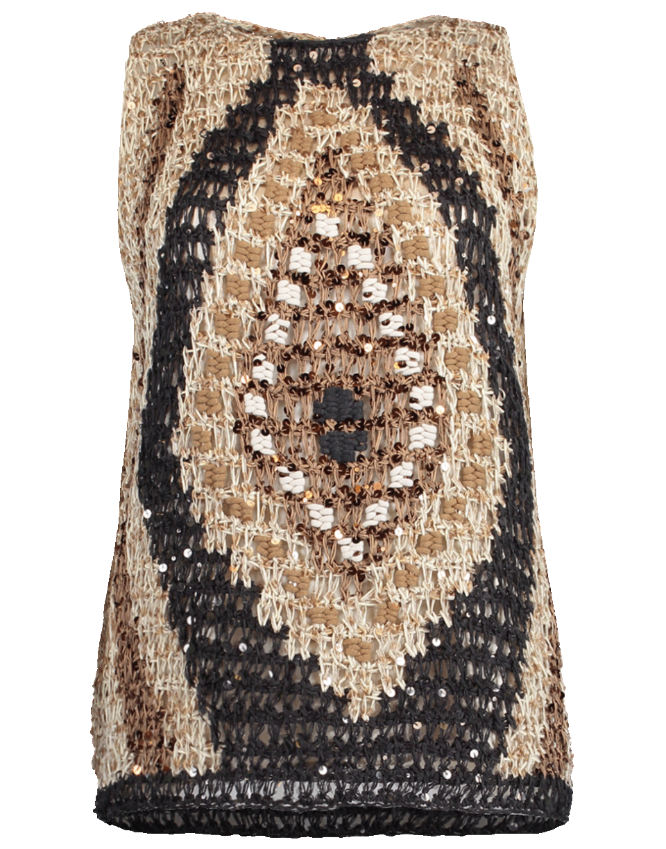 Woven evil eye top by Brunello Cucinelli. This woven knit has been completely crafted by hand using a particular crocheting technique, it features a round neckline, sleeveless cut, loose fit, sparkly sequin details and a keyhole with a button at back.