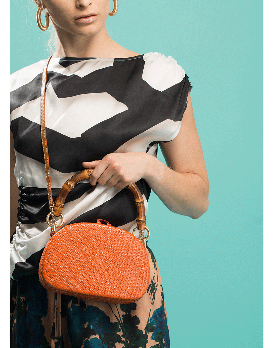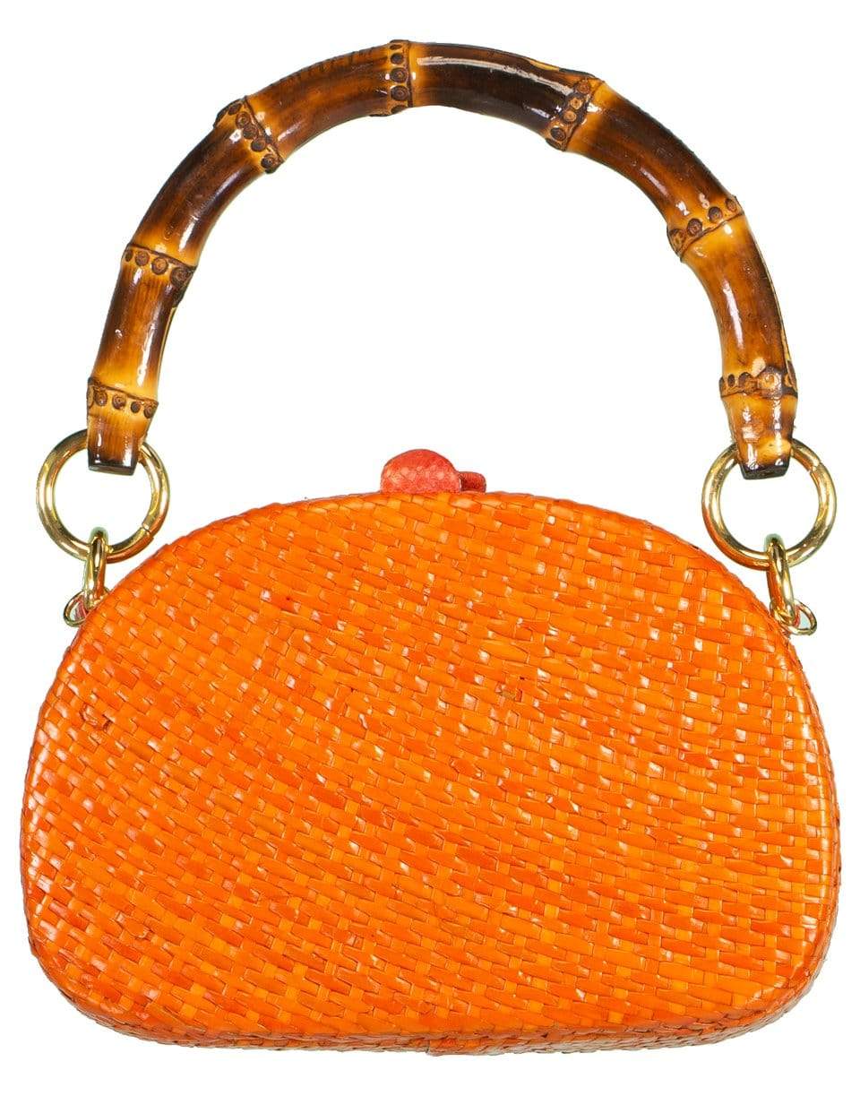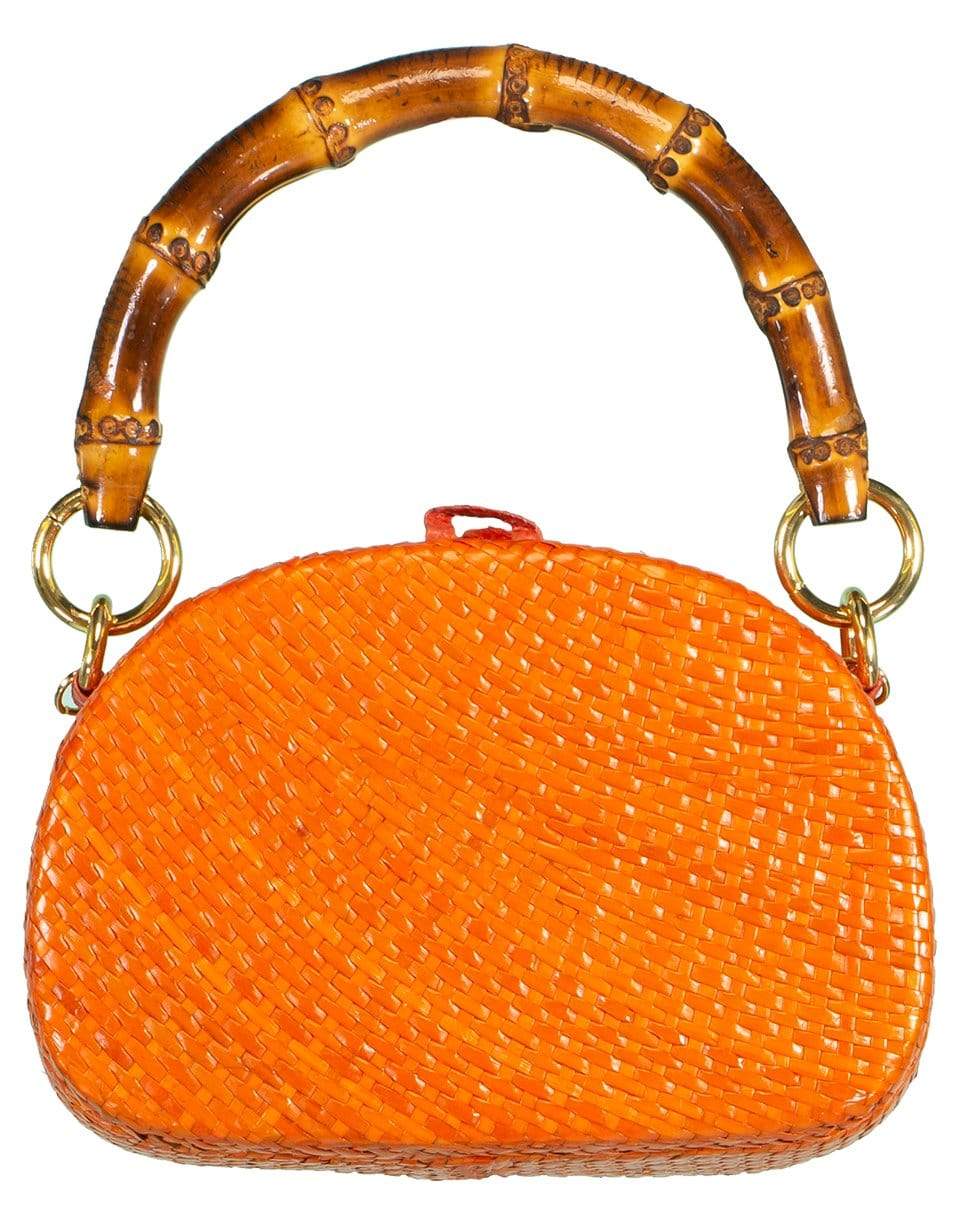 Handmade Serpui orange Anne RM straw bag featuring two main compartments with magnetic closures, a bamboo top handle, interior pockets, and a detachable shoulder strap.