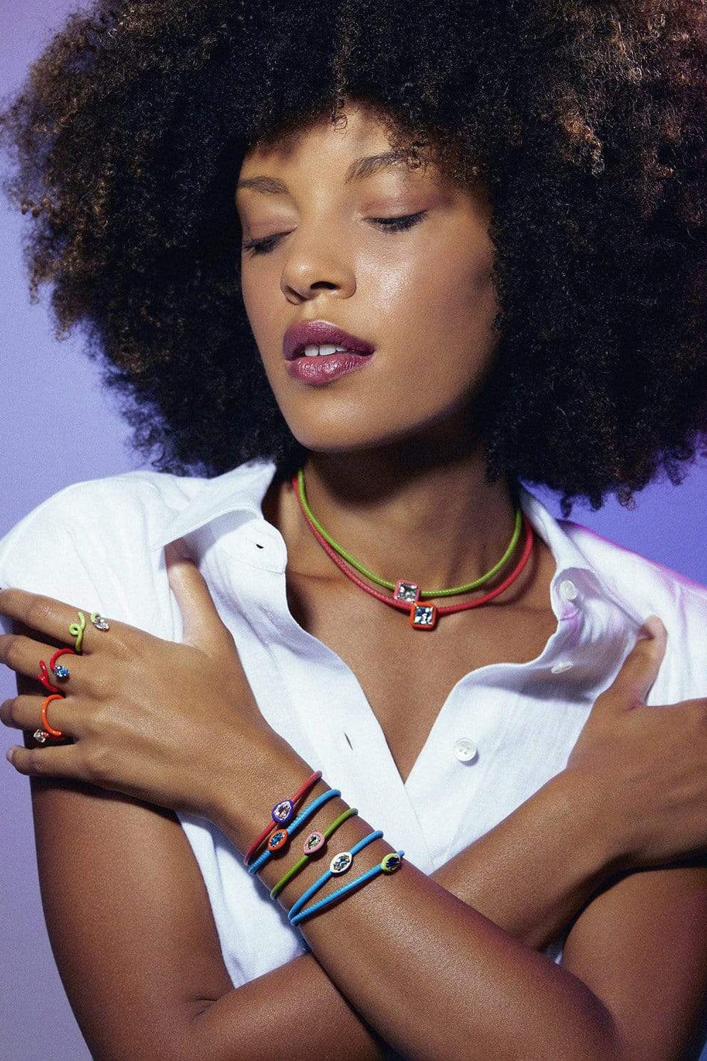 Bea Bongiasca fab bracelet with orange enamel and topaz and blue leather cord.