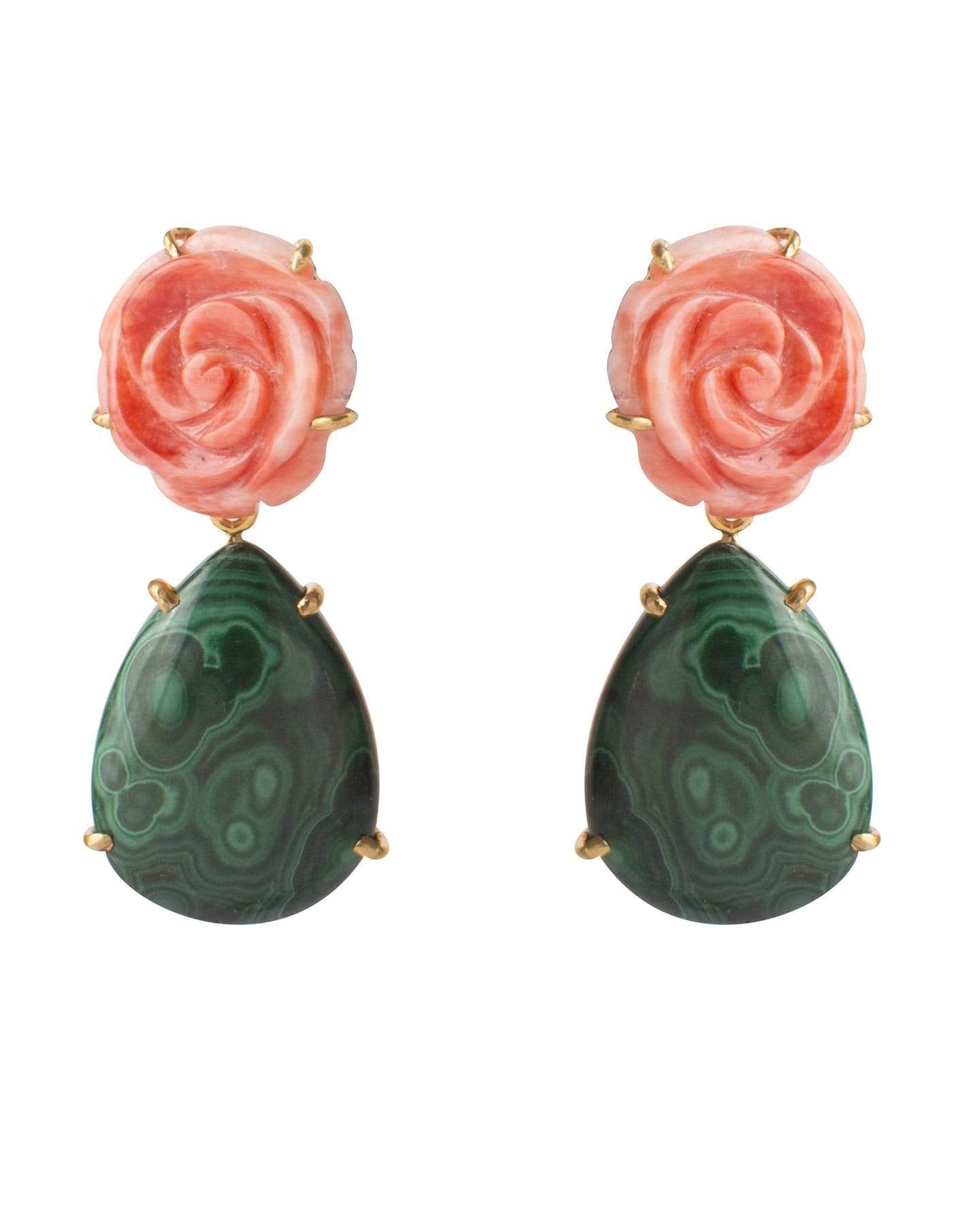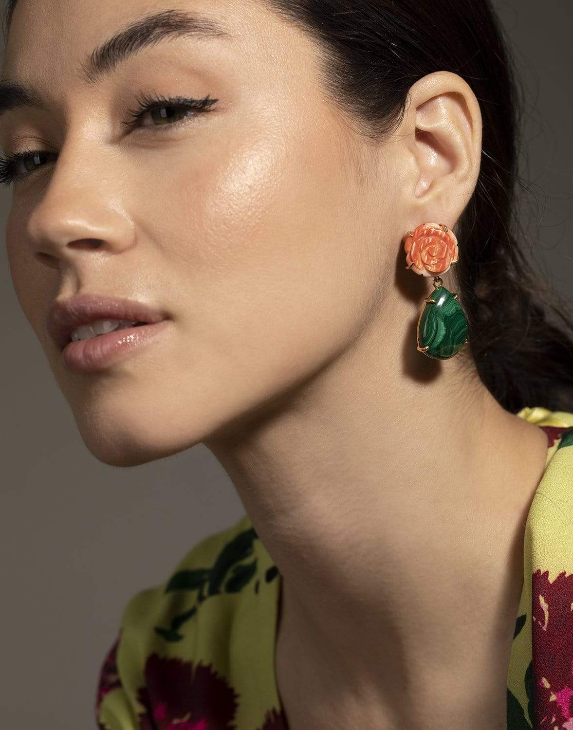 Bounkit Orange Sea Shell Flower & Malachite Earrings. Take your gemstone obsession to a whole new level with these beautifully unique earrings featuring Orange Sea Shell , Malachite, Green Onyx & Carnelian.