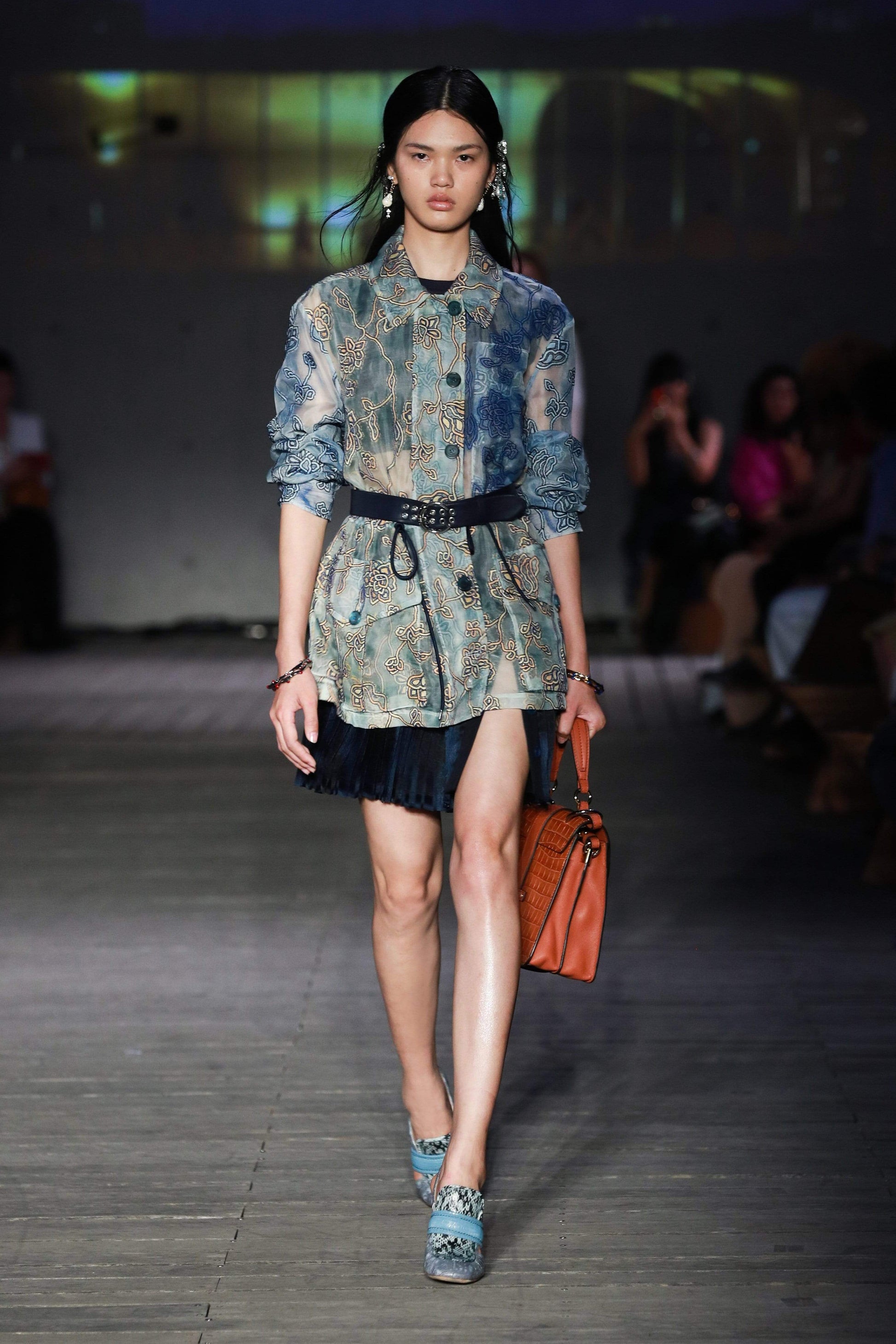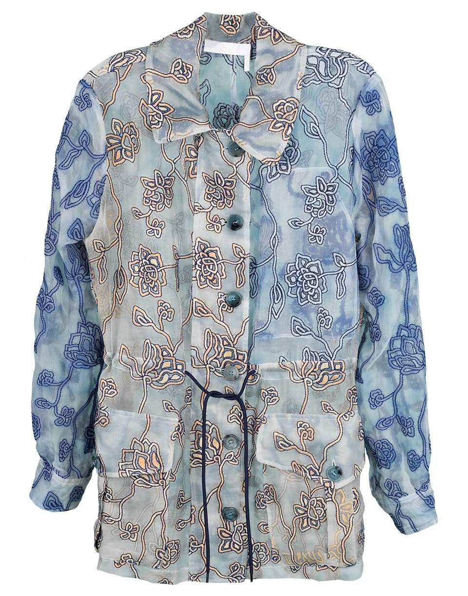 Chloe sheer organza embroidered jacket with a regular fit, pointed collar, long sleeves, front flap pockets, button down front, and a drawstring waist.