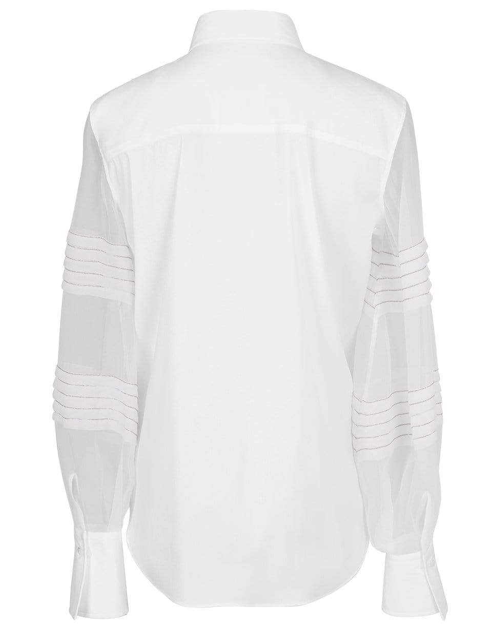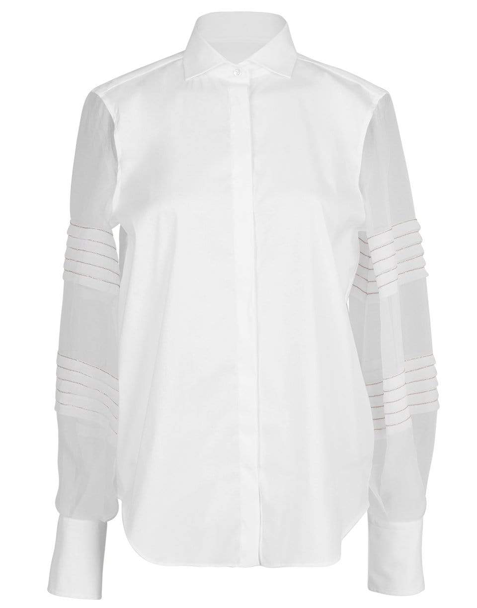 Brunello Cucinelli silk organza blouse with a boyfriend fit, sheer long sleeves, spread collar, and a concealed button placket.