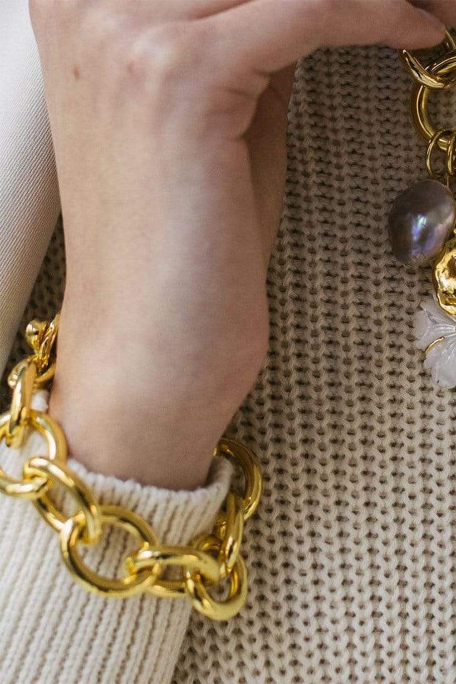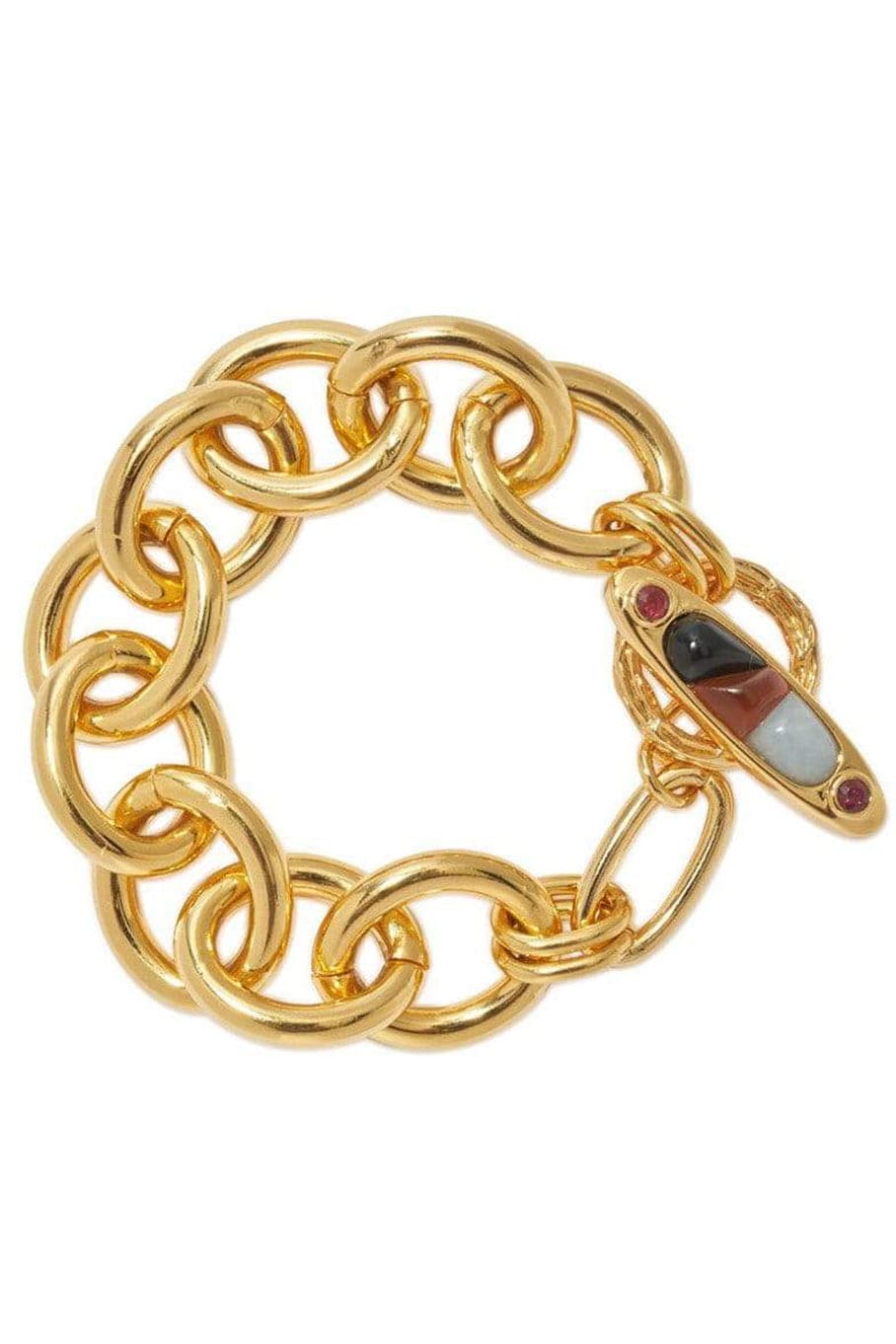 Lizzie Fortunato oro bracelet. Keep sophistication close at hand with our gold-plated brass chain link bracelet, featuring a special statement toggle closure set with black agate, amber, and angelite stones and garnet cabochon details.