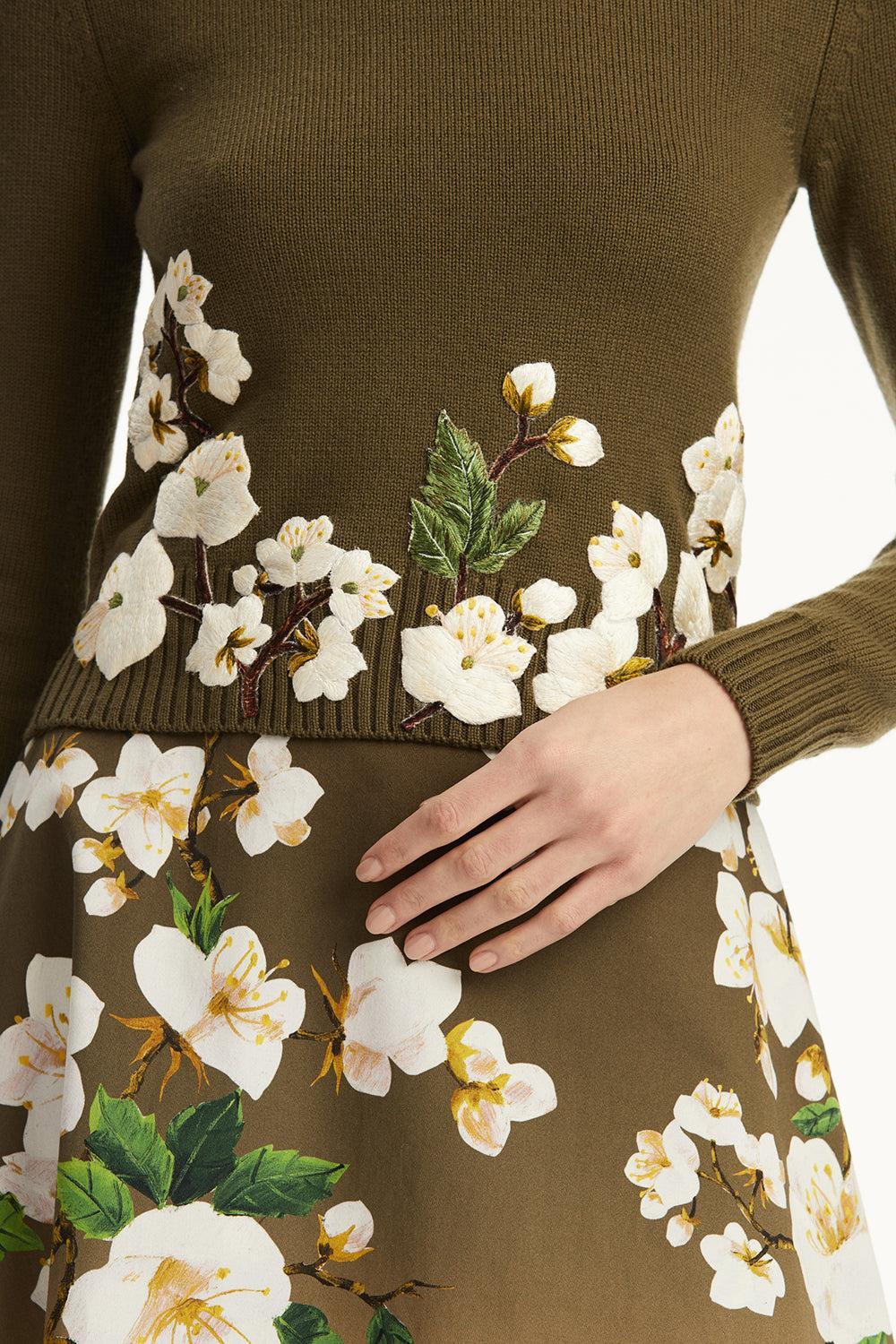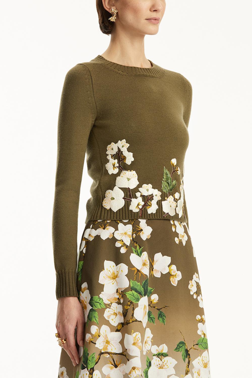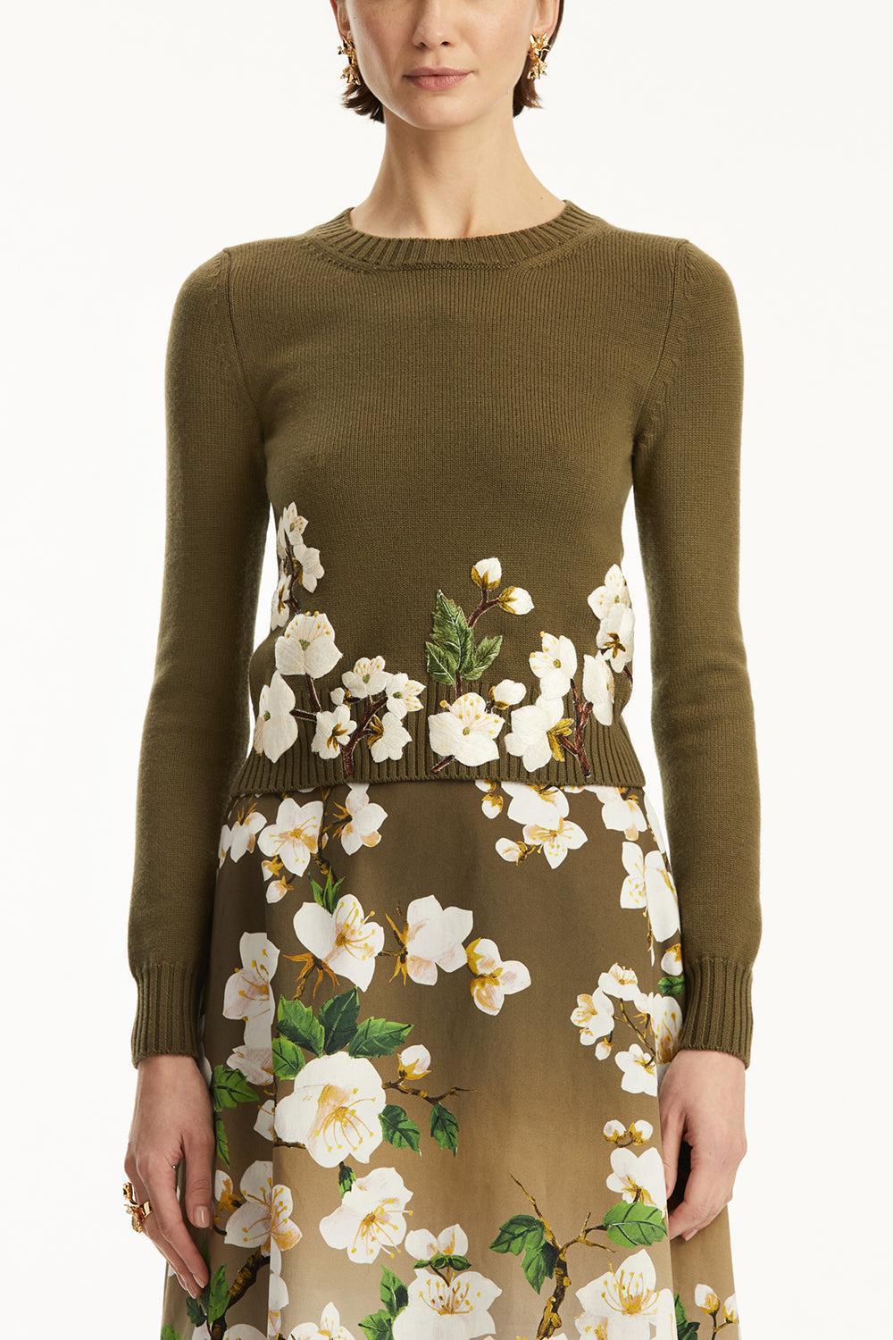 Oscar De La Renta cherry blossom embroidered pullover in khaki.