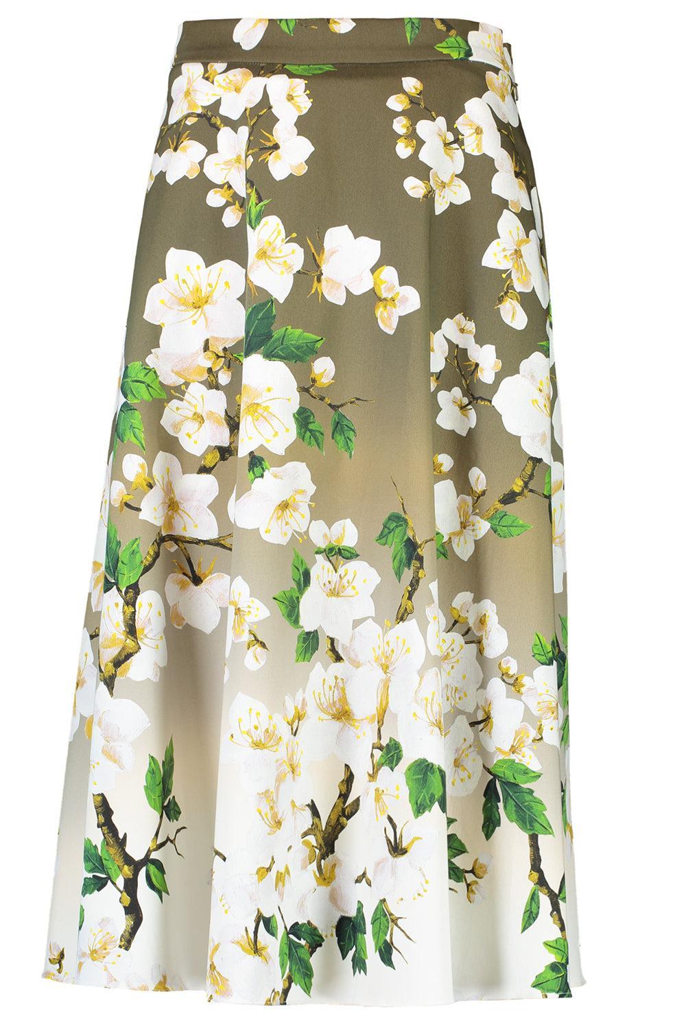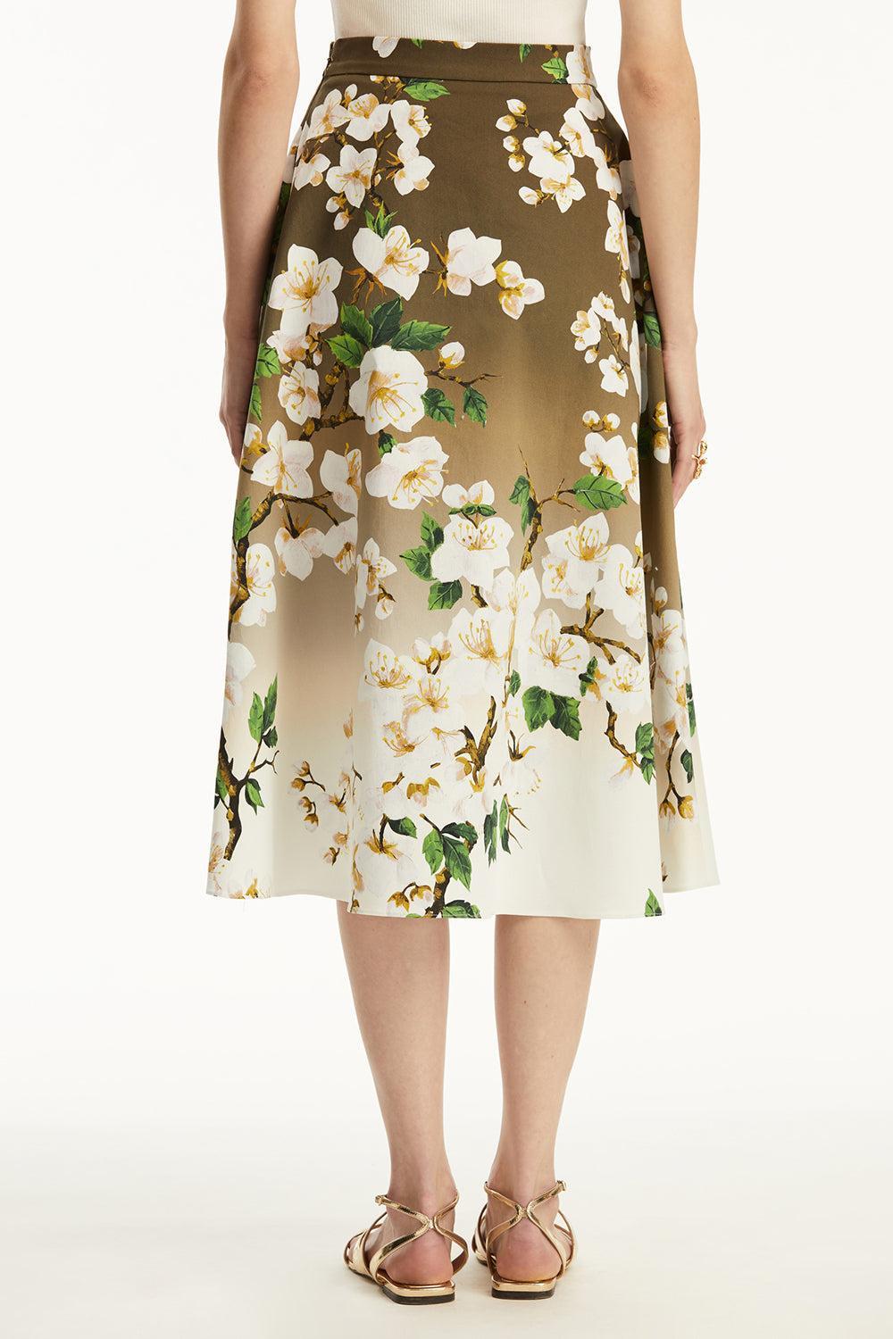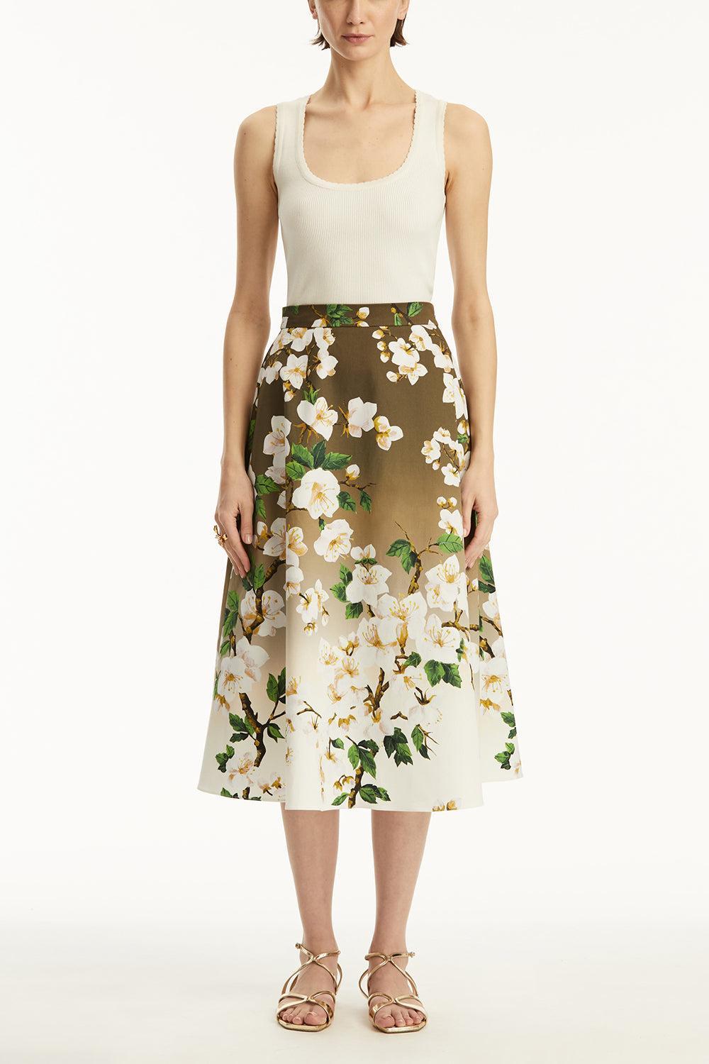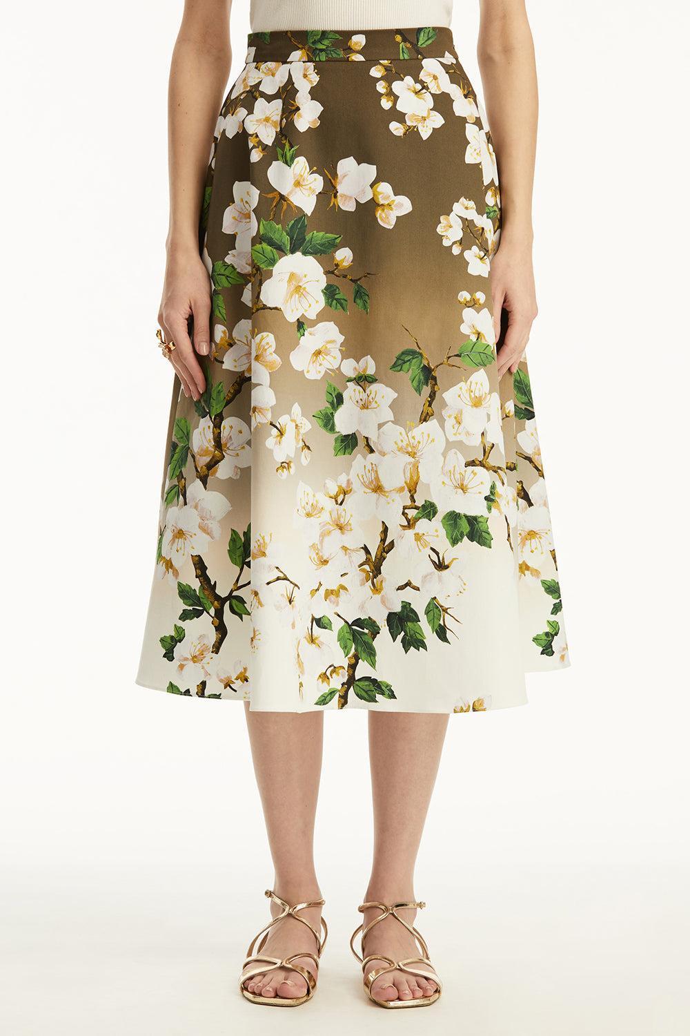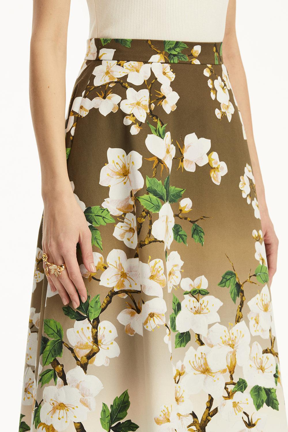Oscar De La Renta cherry blossom midi skirt in white khaki ombre.