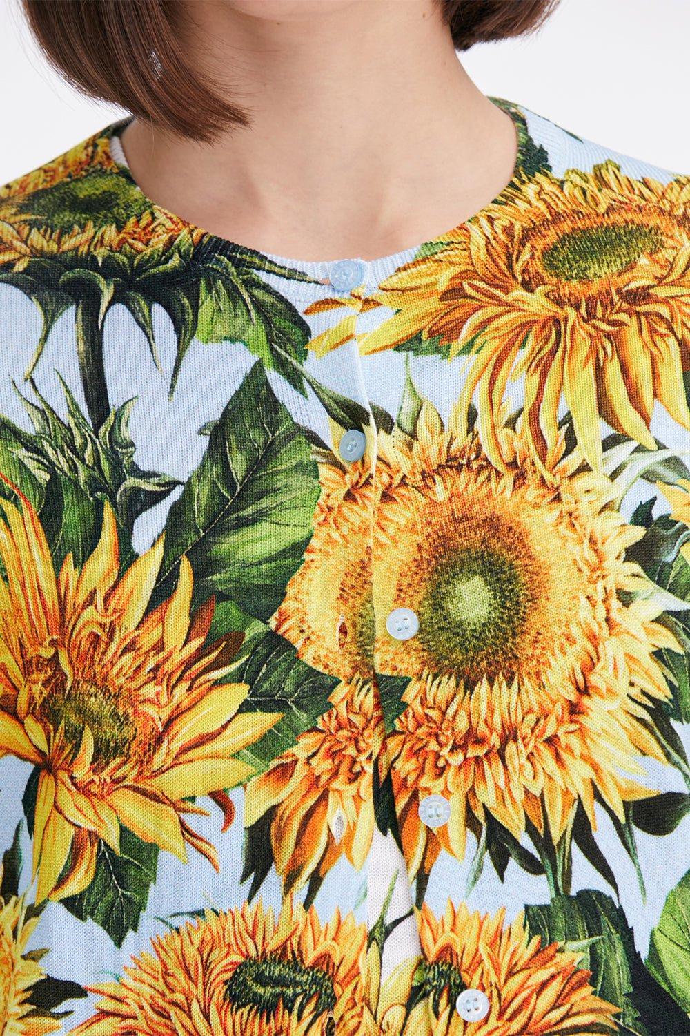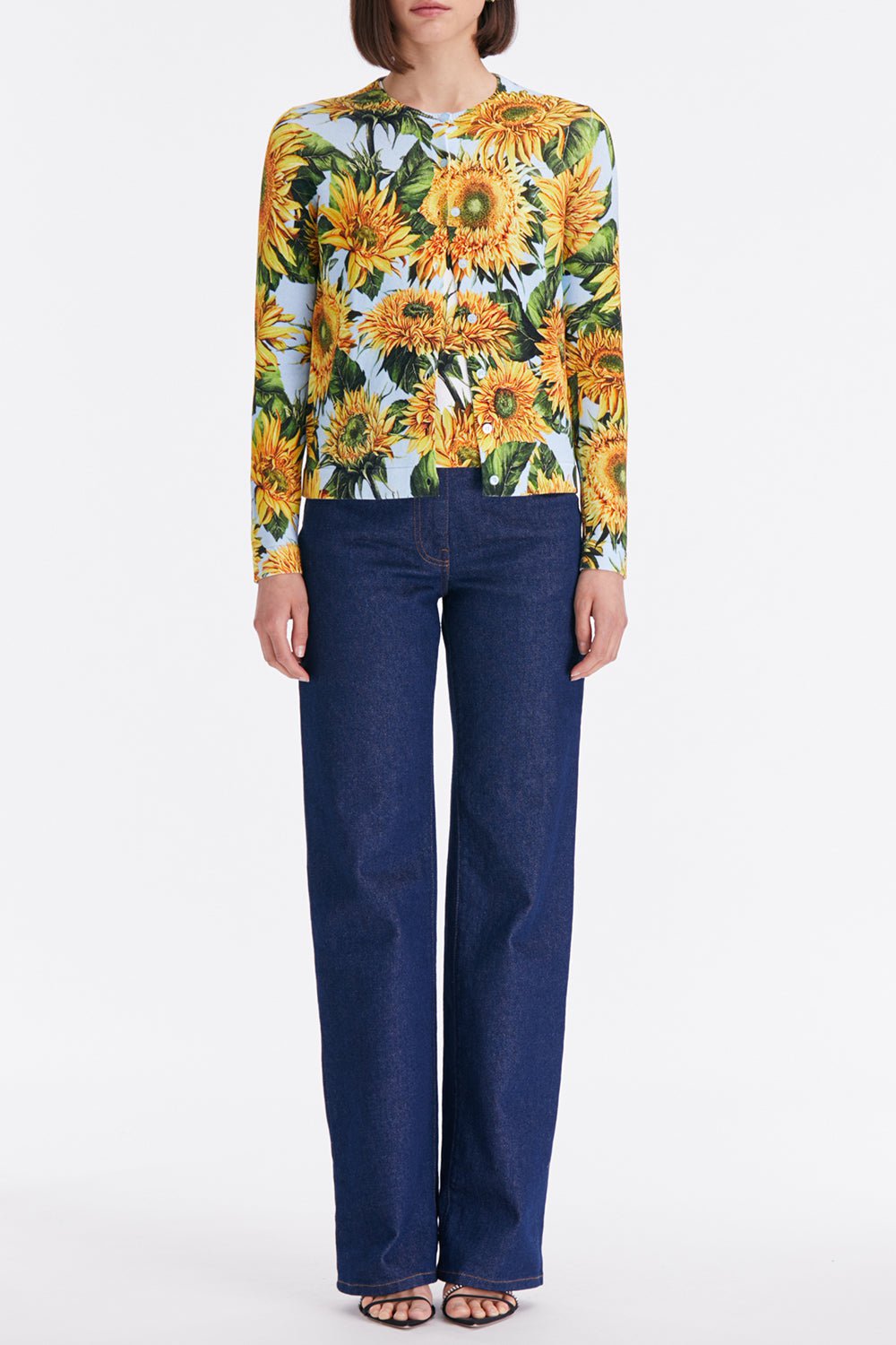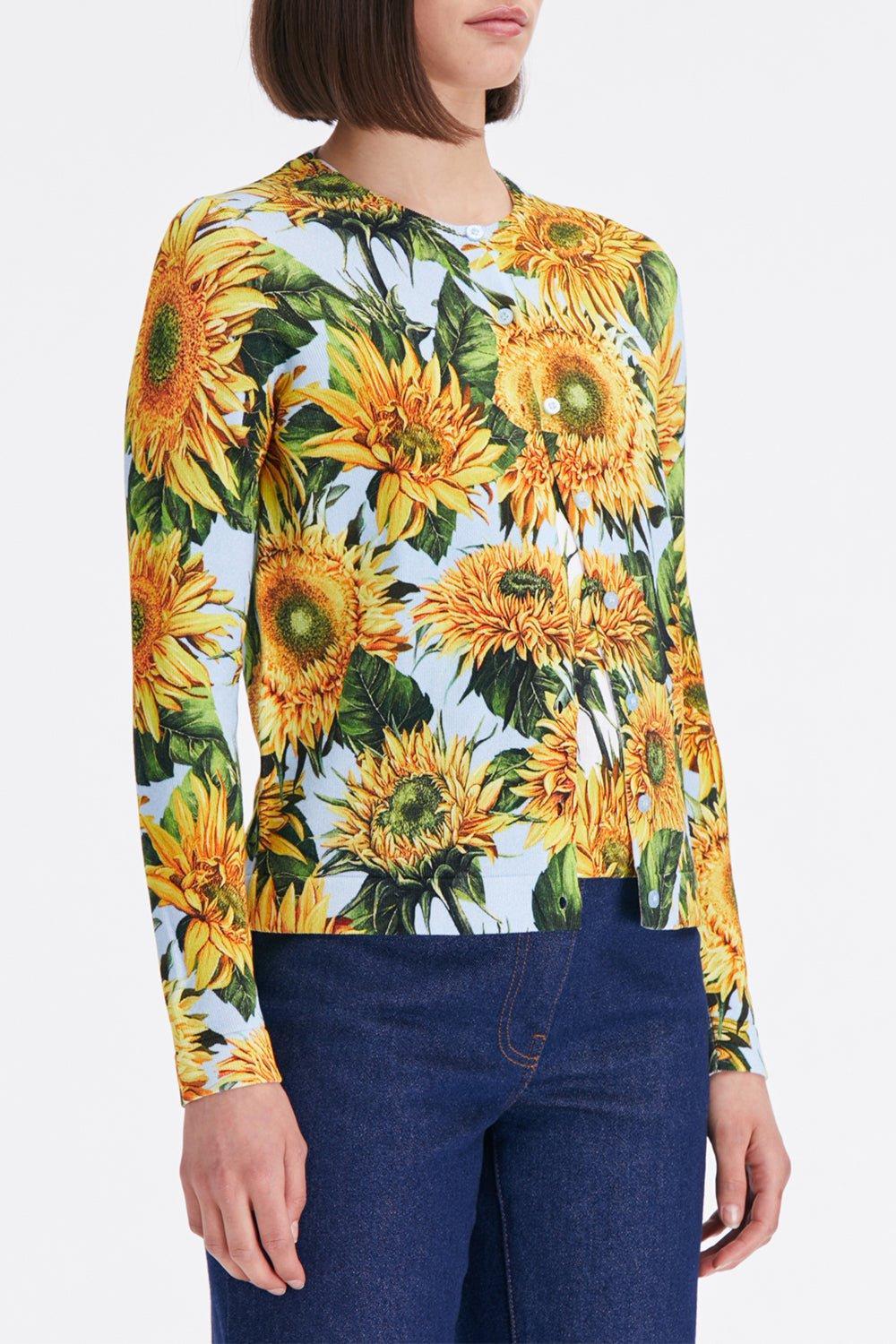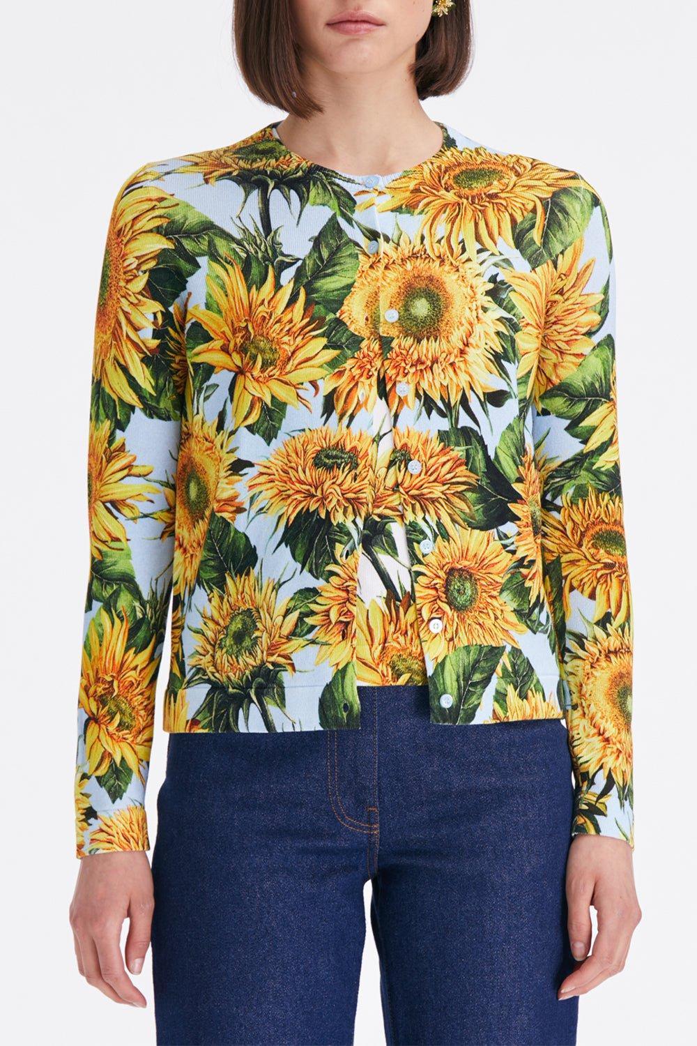 Oscar De La Renta long sleeve sunflower cardigan in yellow soft blue.