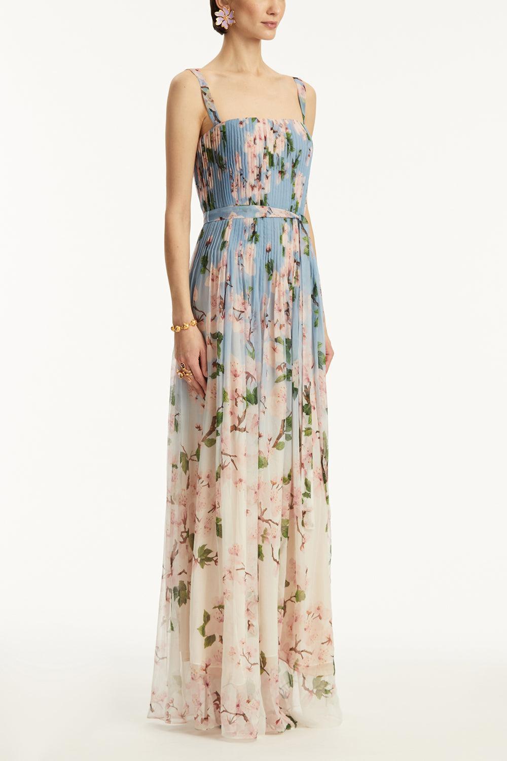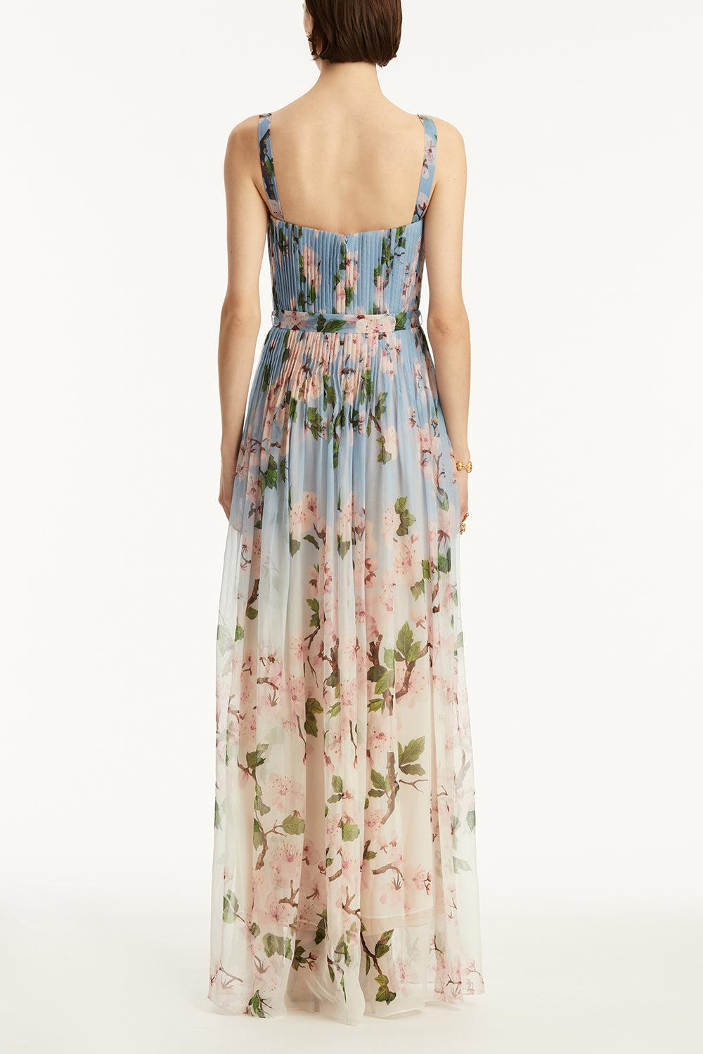 Oscar De La Renta pleated ombre cherry blossom gown in pink blue ombre.