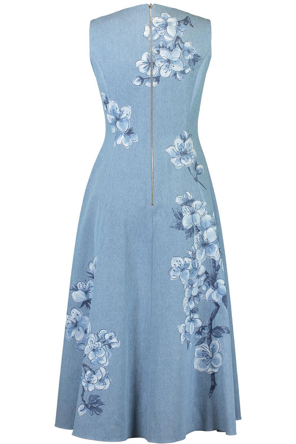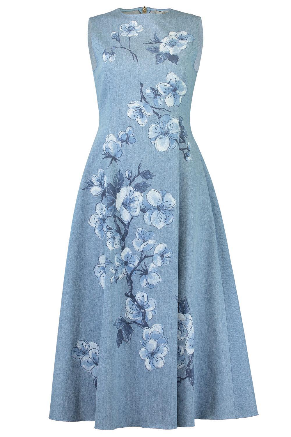 Oscar De La Renta sleeveless cherry blossom printed dress in khaki.