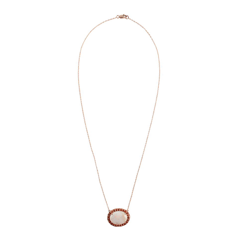 Pep up your look with Andrea Fohrman’s oval opal and orange sapphire necklace. Hanging from a medium length chain and laid in a 14k rose gold setting, the oval opal and orange sapphire provide a bright hued contrast that will have your look screaming with style.