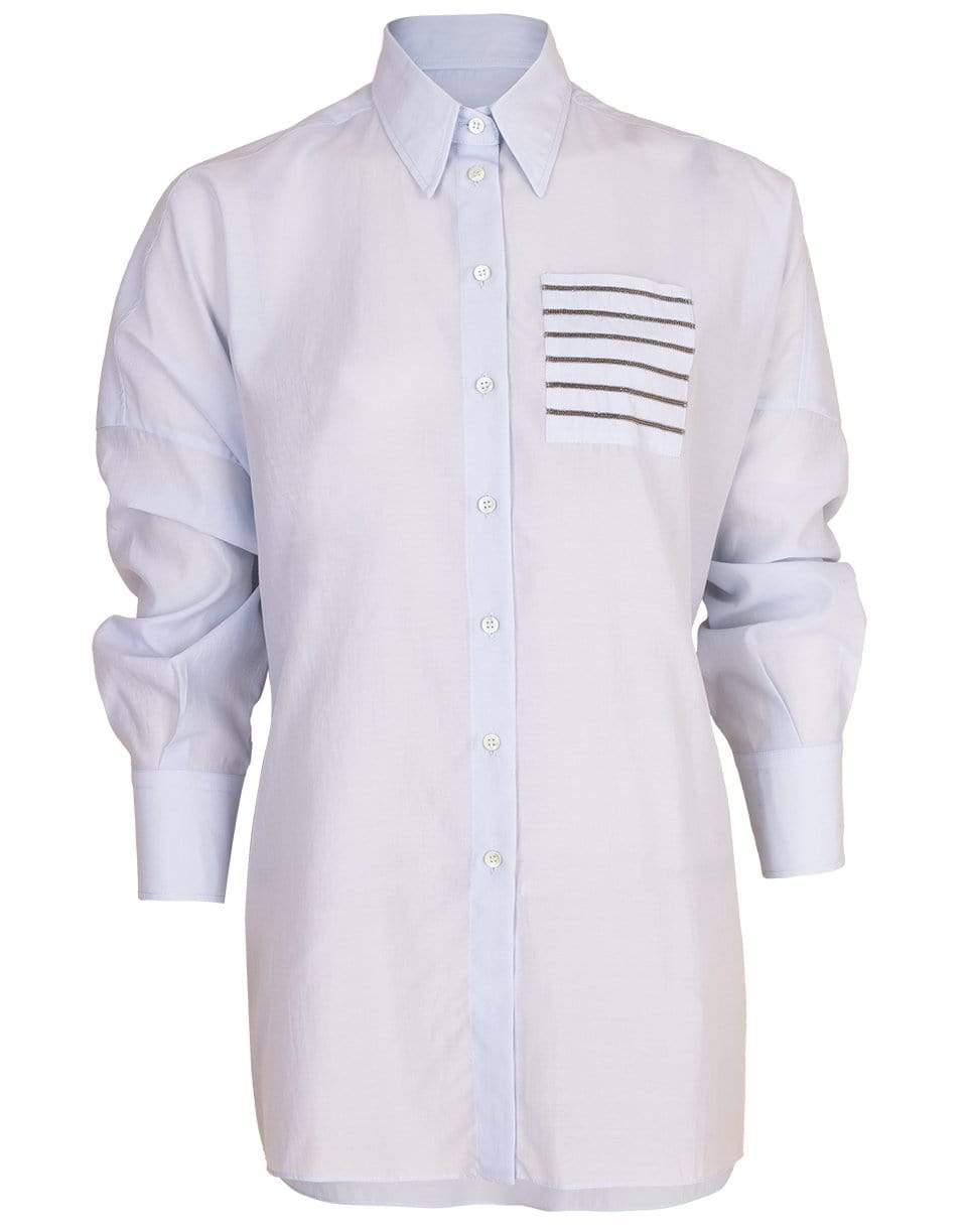 Brunello Cucinelli oversized blouse with a monili striped pocket, long sleeves, pointed collar, and a button front.