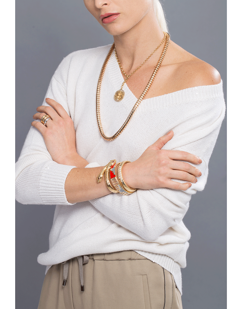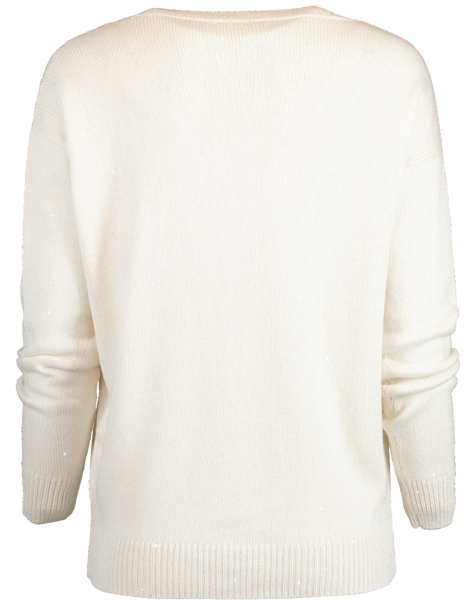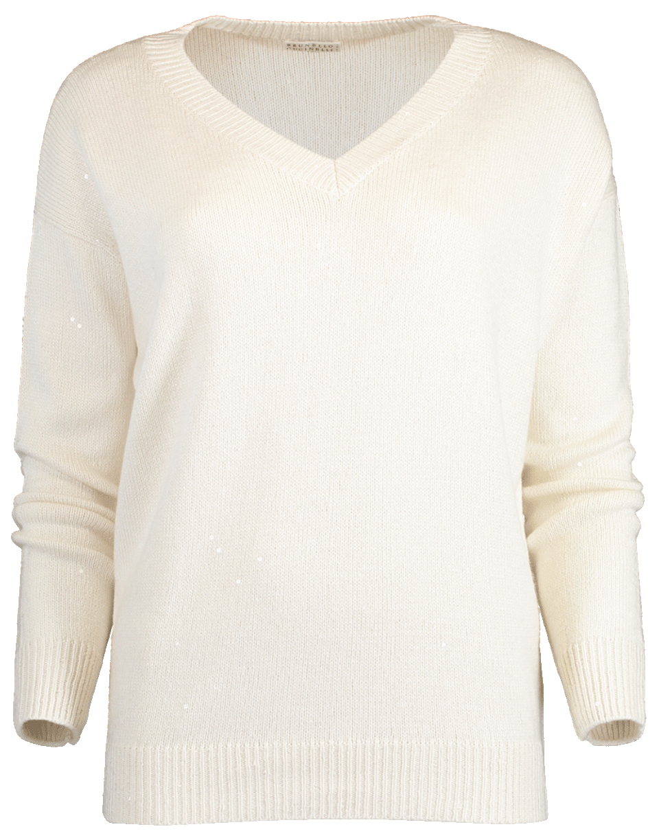 This silk blend sweater from Brunello Cucinelli is the ultimate basic. Featuring a pull over style with a relaxed boyfriend fit, v-neckline, long sleeves, ribbed trims and finshed with paillette details.