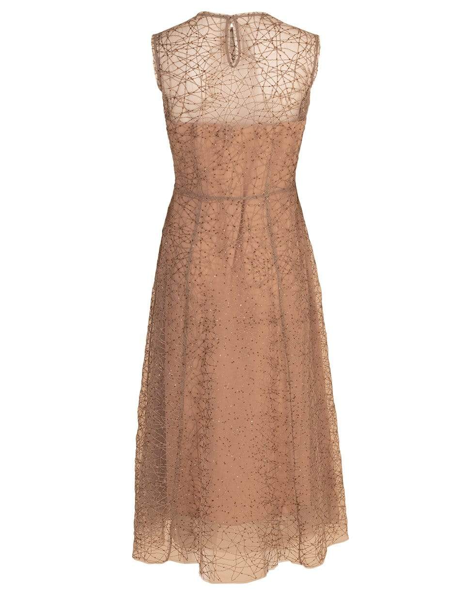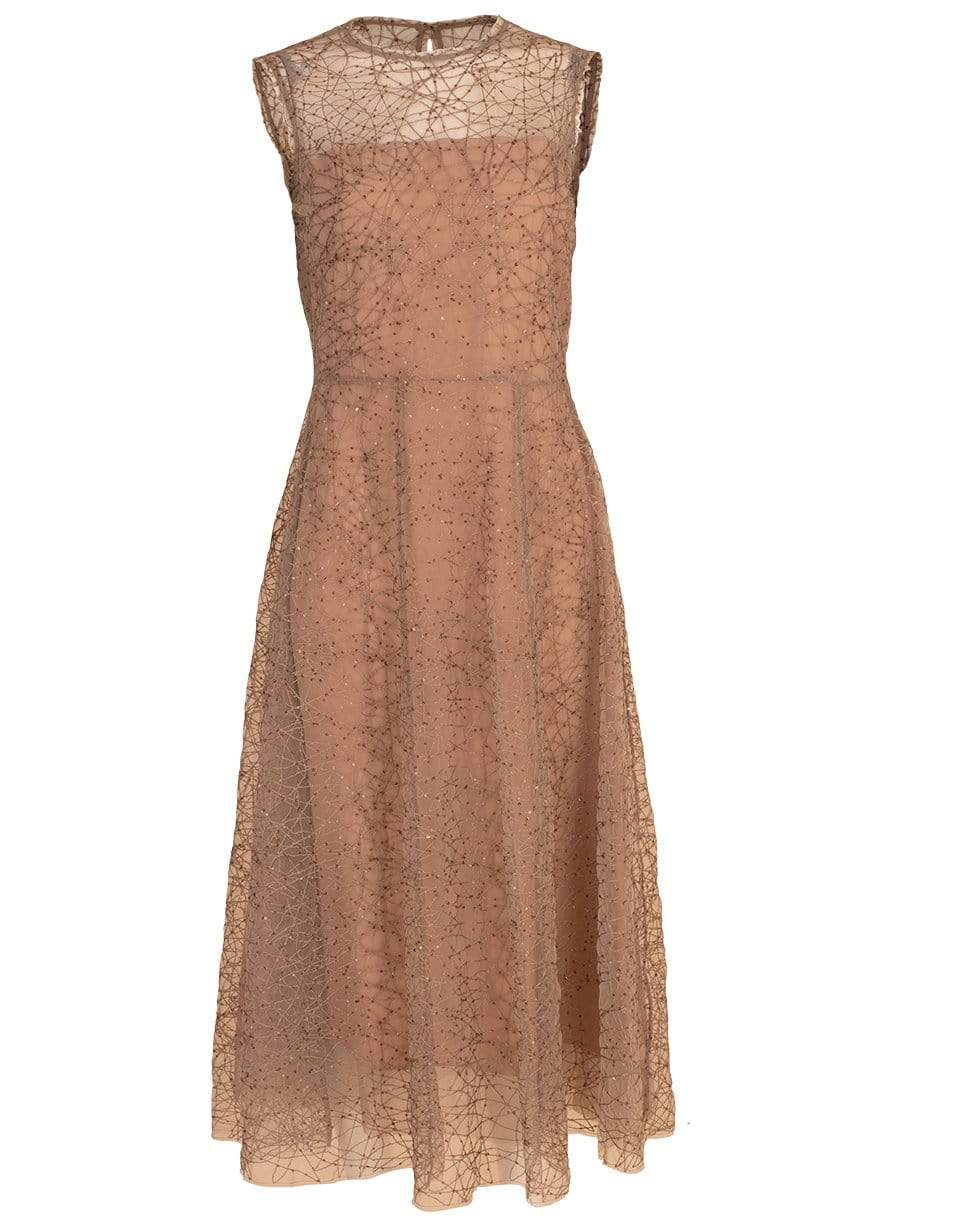 Nude paillette embroidered silk organza dress from Brunello Cucinelli with a fitted waist, round neck, sleeveless cut, side zip closure, and a mid-length. Lined.