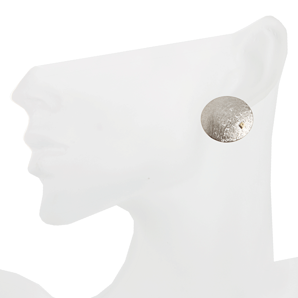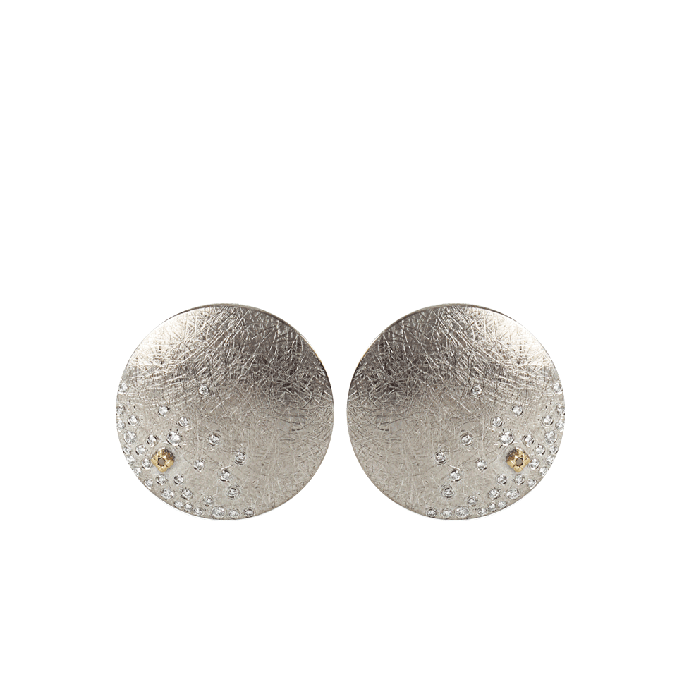 Shining like a full moon these Todd Reed palladium and raw diamond disc earrings look fabulous paired with a uniquely organic collar necklace and a strapless dress.