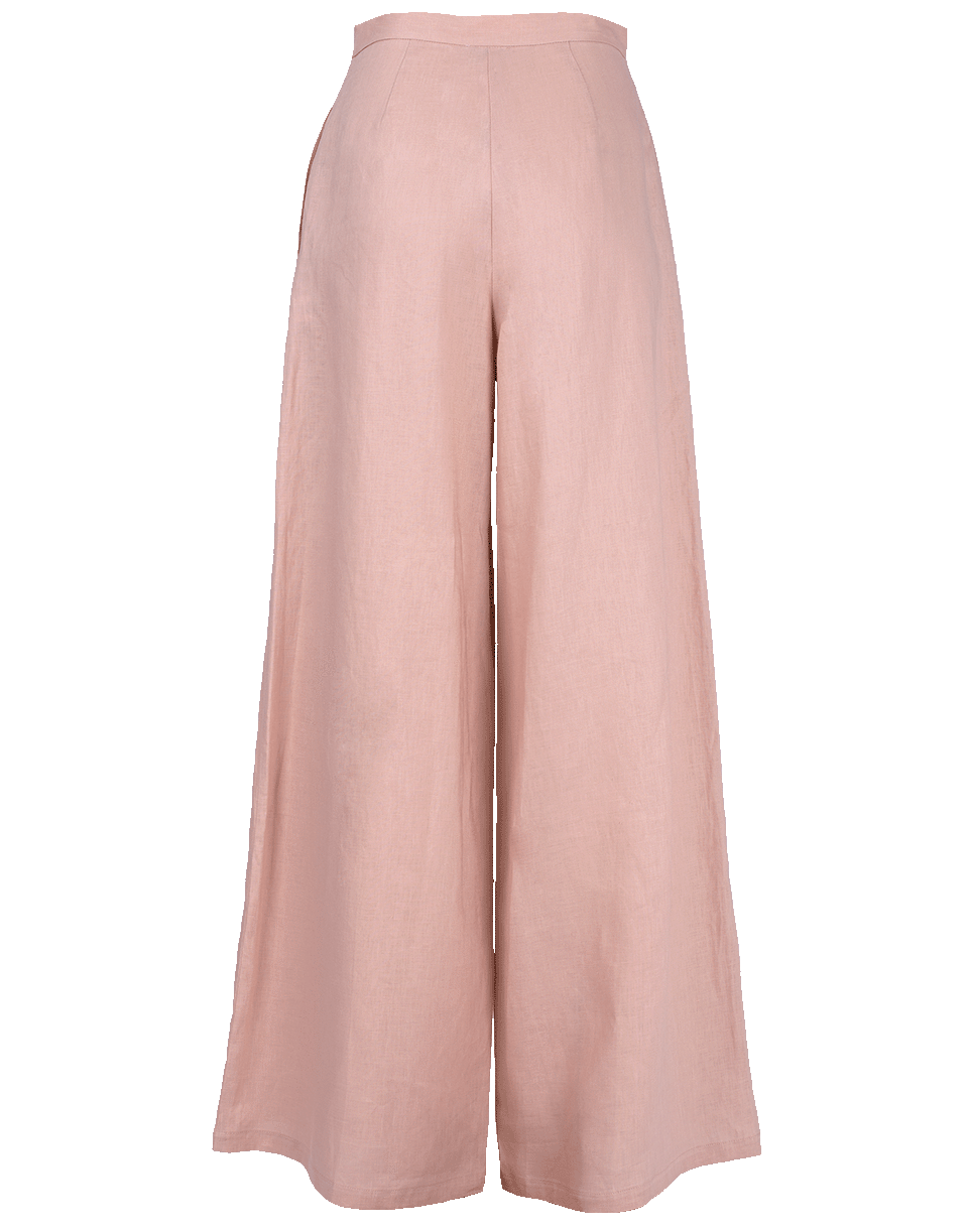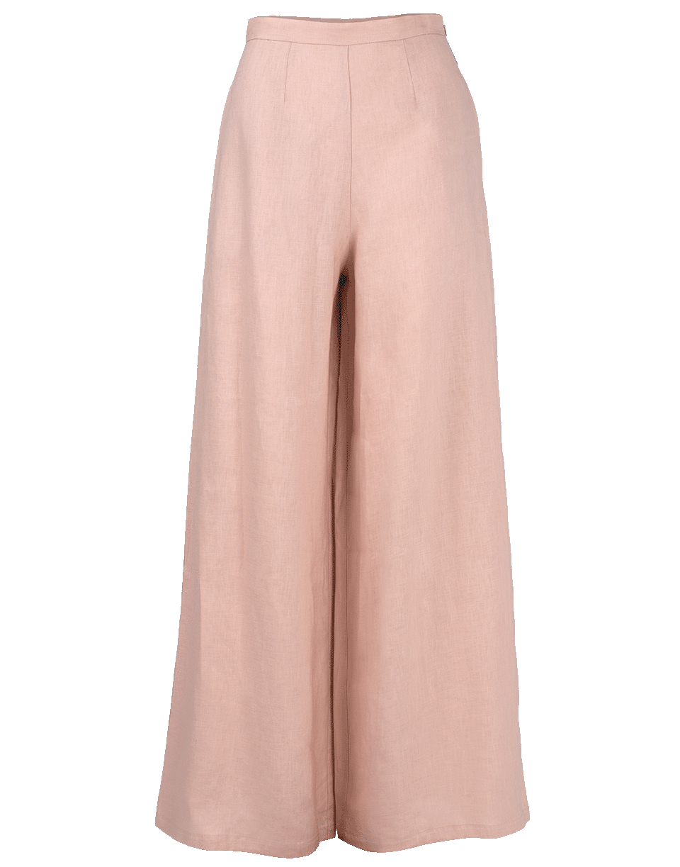 Pink ‘Pamela’ flared high waist pants by Miguelina. These lightweight linen pants feature a full length, voluminous wide leg cut with a slimmer high waist, loose silhouette, darts at front and back and a concealed zip closure along the side.