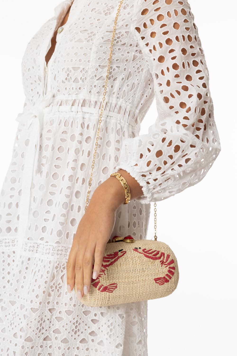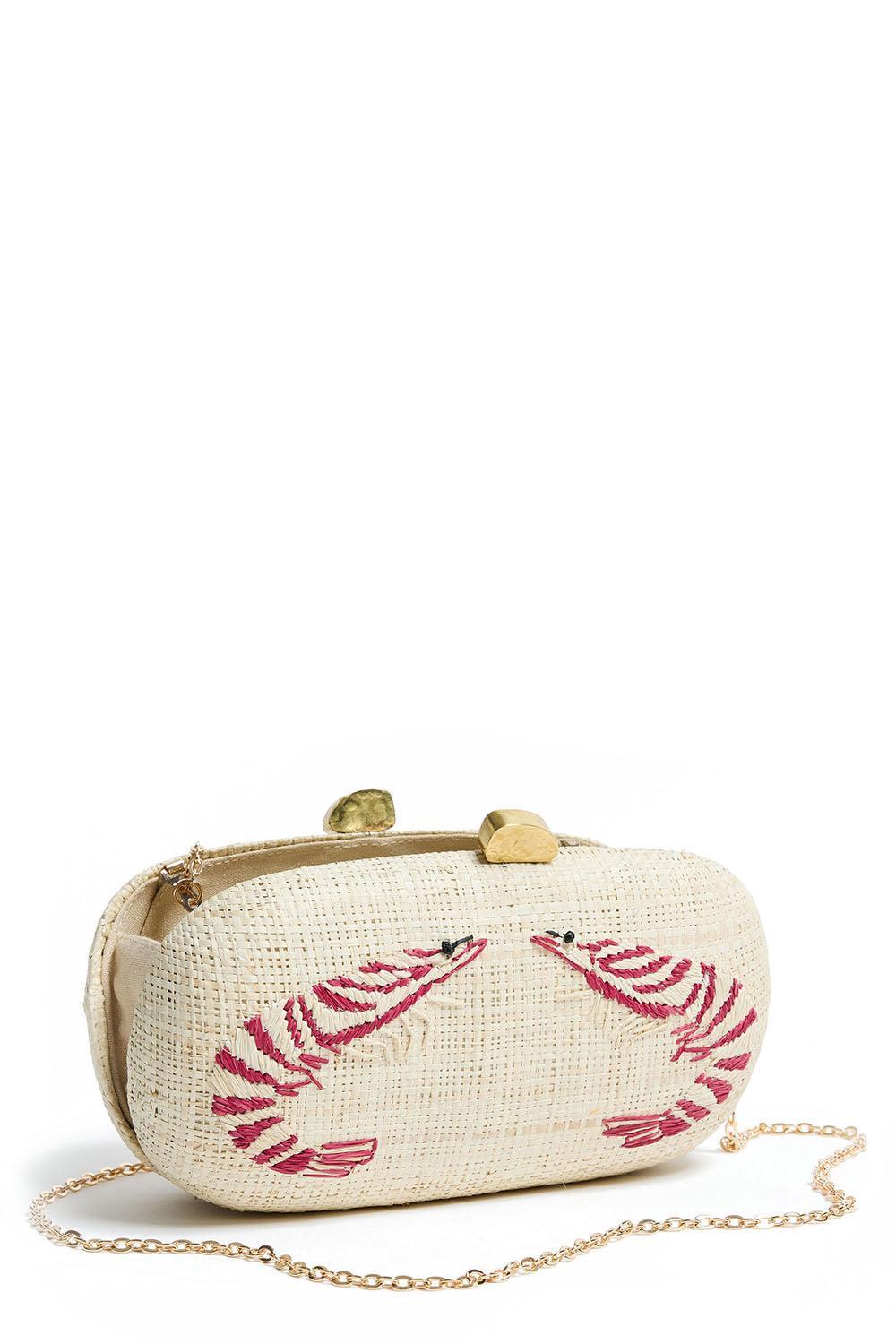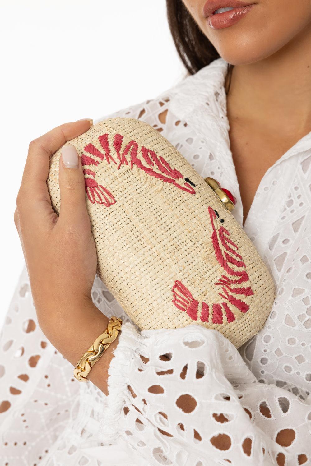 Straw Minaudière With Hand-Embroidered Shrimp Motif And Hammered Brass Closure